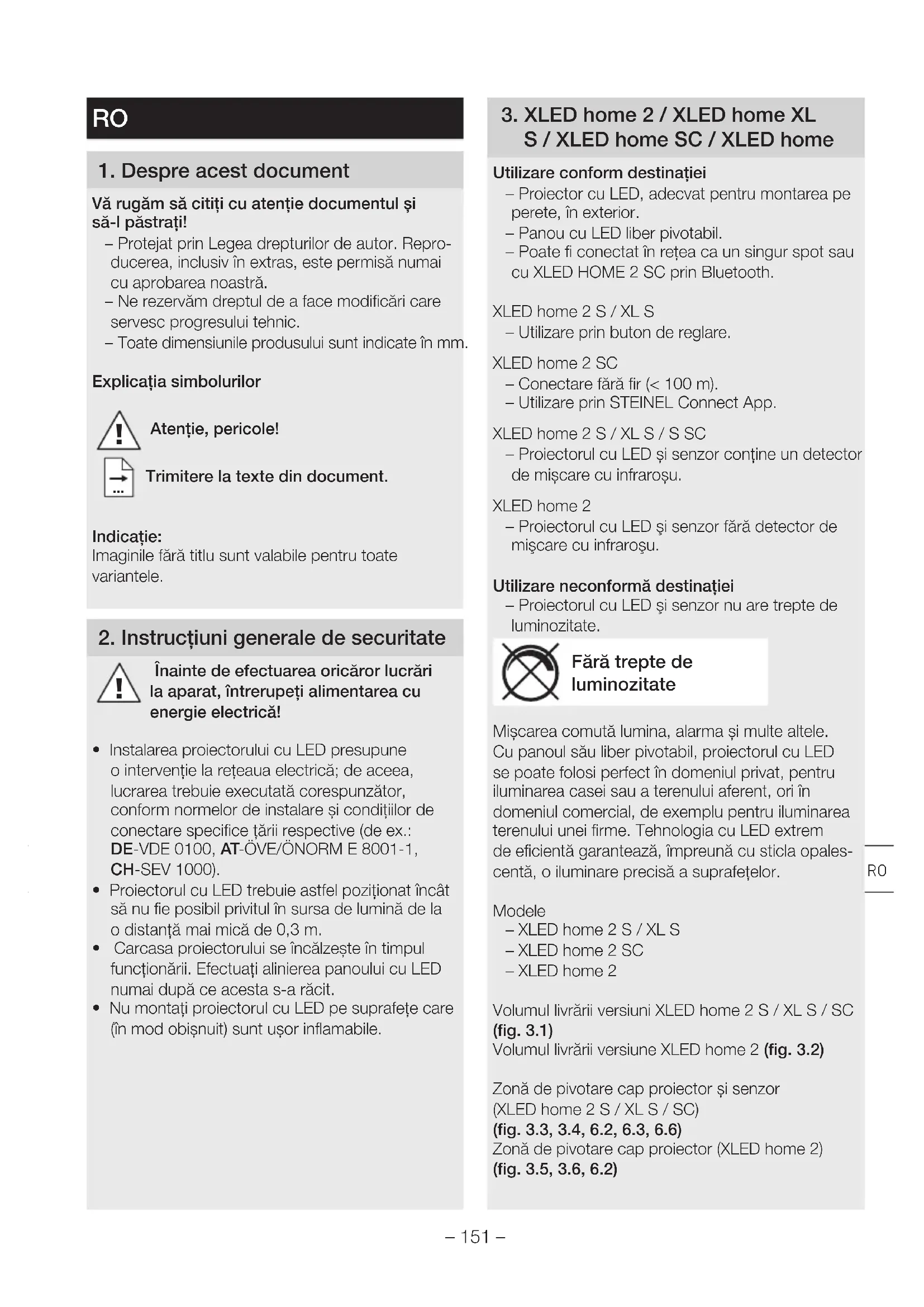 S/XLEDhome SC/XLEDhome Utilizare conform destinaţiei – Proiector cu LED, adecvat pentru montarea pe perete, în exterior. – Panou cu LED liber pivotabil. – Poate fi conectat în reea ca un singur spot sau cu XLED HOME 2 SC prin Bluetooth. XLEDhome2 S/XL S – Utilizare prin buton de reglare. XLEDhome2 SC – Conectare fără fir (<100m). – Utilizare prin STEINEL Connect App. XLED home 2 S/XL S/S SC – Proiectorul cu LED și senzor conţine un detector de mișcare cu infraroșu. XLED home 2 – Proiectorul cu LED şi senzor fără detector de mişcare cu infraroşu. Utilizare neconformă destinaţiei – Proiectorul cu LED şi senzor nu are trepte de luminozitate. Fără trepte de luminozitate Mișcarea comută lumina, alarma și multe altele. Cu panoul său liber pivotabil, proiectorul cu LED se poate folosi perfect în domeniul privat, pentru iluminarea casei sau a terenului aferent, ori în domeniul comercial, de exemplu pentru iluminarea terenului unei firme. Tehnologia cu LED extrem de eficientă garantează, împreună cu sticla opales- centă, o iluminare precisă a suprafeţelor. Modele – XLEDhome2 S/XL S – XLEDhome2SC – XLEDhome2 Volumul livrării versiuni XLED home 2 S/XL S/SC (fig.3.1) Volumul livrării versiune XLEDhome2 (fig.3.2) Zonă de pivotare cap proiector și senzor (XLED home 2 S/XL S/SC) (fig.3.3, 3.4, 6.2, 6.3, 6.6) Zonă de pivotare cap proiector (XLEDhome2) (fig.3.5, 3.6, 6.2) RO– 152 – Dimensiunile produsului (XLED home 2 S/XL S/SC) (fig.3.7, 3.8) Dimensiunile produsului (XLEDhome2) (fig.3.9, 3.10) Prezentare generală a aparatului (XLED home 2 S/XL S/SC) (fig.3.11) A Panou cu LED B Carcasă C Suport de perete D Unitate senzor E Temporizare (XLED home 2 S/XLED home2XL S) F Setarea luminozităţii de comutare (XLED home 2 S/XLEDhome 2 XL S) Prezentare generală a aparatului (XLEDhome2) (fig.3.12) A Panou cu LED B Carcasă C Suport de perete Distribuirea intensităţii luminii (fig. 3.13)