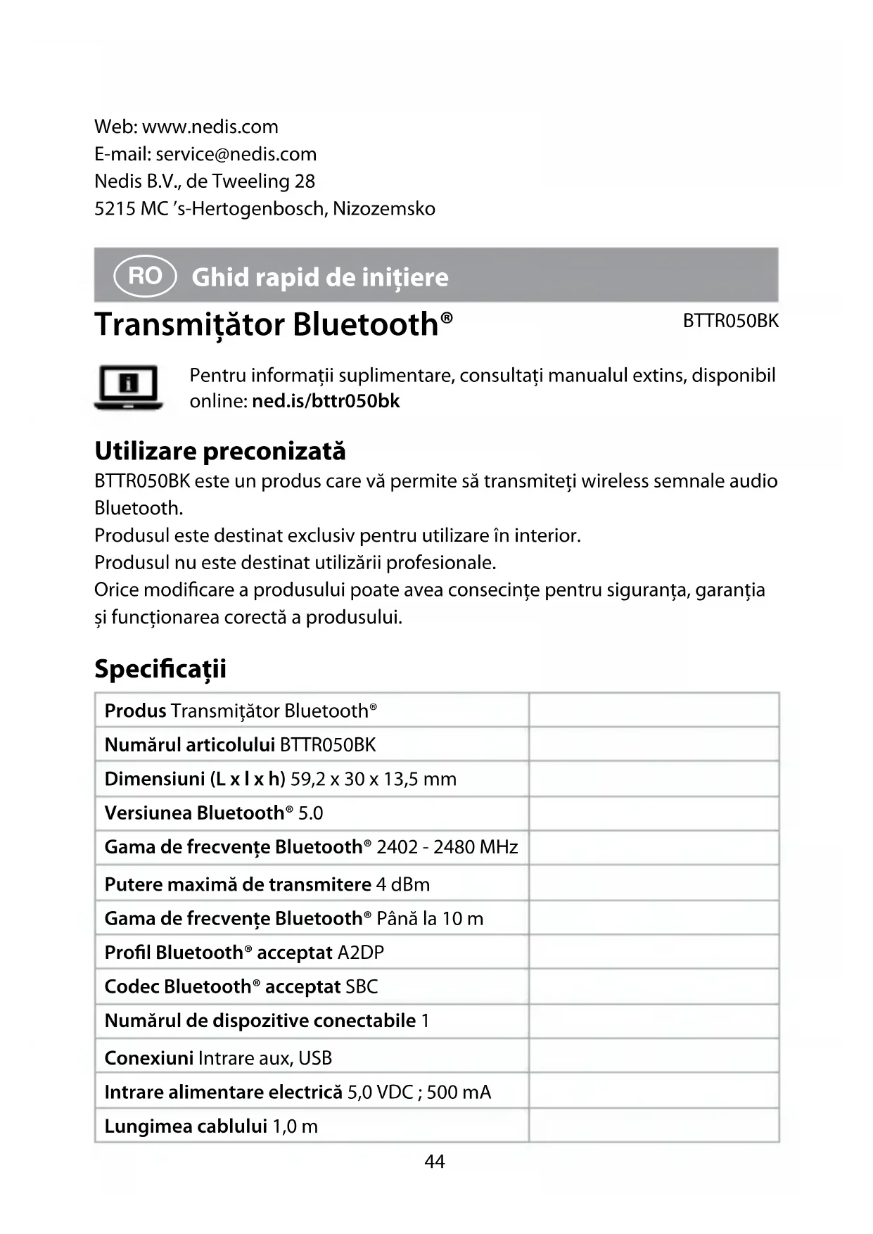 Ghid rapid de inițiere Transmițător Bluetooth® BTTR050BK Pentru informații suplimentare, consultați manualul extins, disponibil online: ned.is/bttr050bk Utilizare preconizată BTTR050BK este un produs care vă permite să transmiteți wireless semnale audio Bluetooth. Produsul este destinat exclusiv pentru utilizare în interior. Produsul nu este destinat utilizării profesionale. Orice modicare a produsului poate avea consecințe pentru siguranța, garanția și funcționarea corectă a produsului. Specicaţii Produs Transmițător Bluetooth® Numărul articolului BTTR050BK Dimensiuni (L x l x h) 59,2 x 30 x 13,5 mm Versiunea Bluetooth® 5.0 Gama de frecvențe Bluetooth® 2402 - 2480 MHz Putere maximă de transmitere 4 dBm Gama de frecvențe Bluetooth® Până la 10 m Prol Bluetooth® acceptat A2DP Codec Bluetooth® acceptat SBC Numărul de dispozitive conectabile 1 Conexiuni Intrare aux, USB Intrare alimentare electrică 5,0 VDC ; 500 mA Lungimea cablului 1,0 m45 Piese principale (imagine A) 1 Buton asociere 2 LED indicator de stare 3 Conector USB 4 Cablu audio 3,5 mm la 3,5 mm Instrucțiuni de siguranță