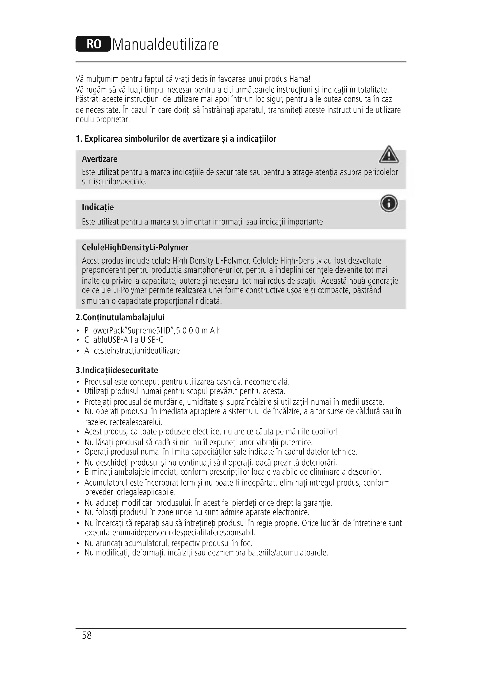Avertizare Este utilizat pentru amarca indicațiile de securitate sau pentru aatrage atenția asuprapericolelor șiriscurilor speciale. Indicație Este utilizat pentru amarca suplimentar informații sau indicații importante. Celule High Density Li-Polymer Acest produs include celule High Density Li-Polymer.Celulele High-Density au fost dezvoltate preponderent pentru producția smartphone-urilor,pentru aîndeplini cerințele devenite tot mai înalte cu privirelacapacitate, putere șinecesarul tot mai redus de spațiu. Această nouă generație de celule Li-Polymer permite realizarea unei forme constructive ușoare șicompacte, păstrând simultan ocapacitate proporțional ridicată.