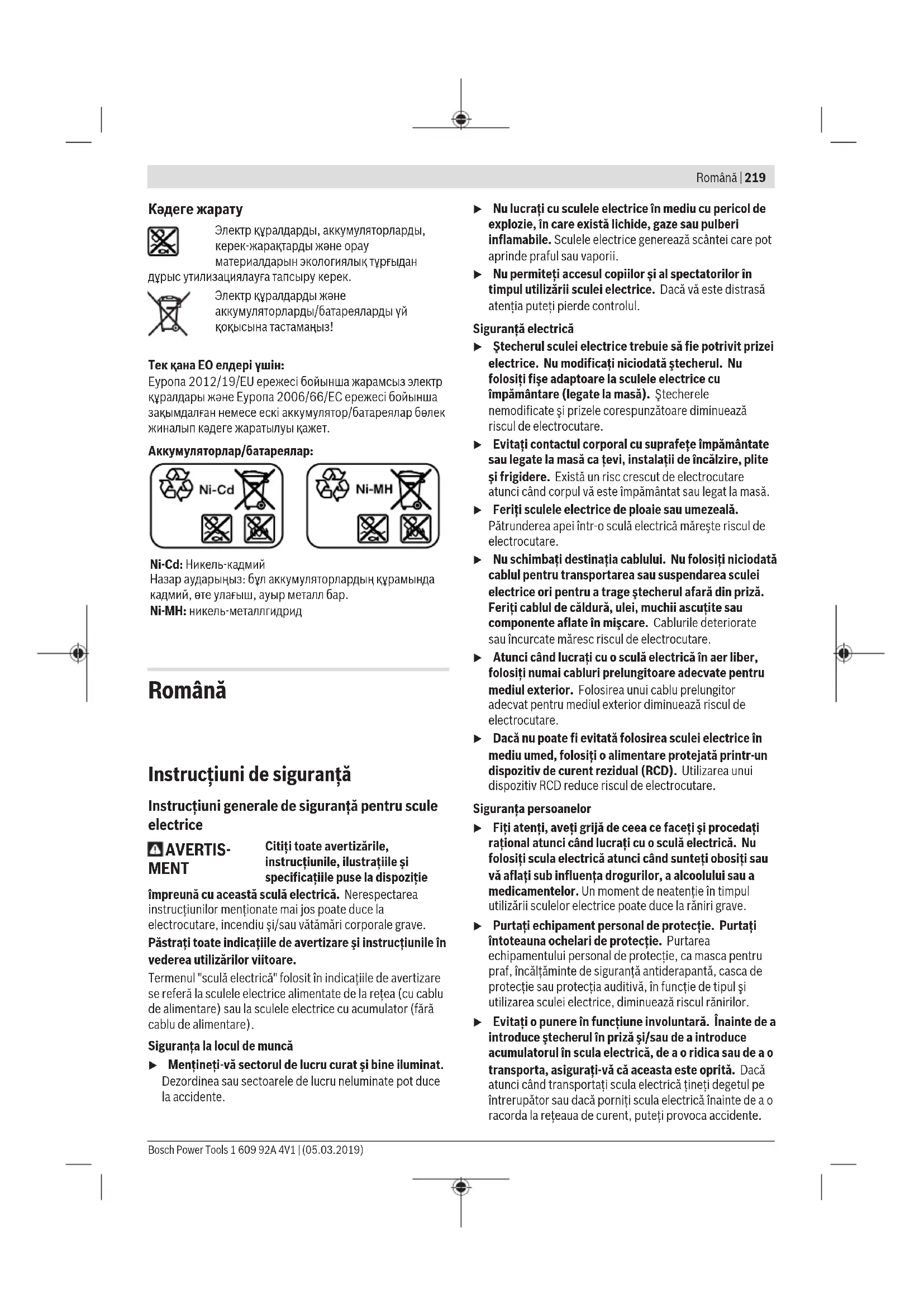 1 609 92A 4V1 | (05.03.2019) Bosch Power ToolsRomână | 219 Кәдеге жарату Электр құралдарды, аккумуляторларды, керек-жарақтарды және орау материалдарын экологиялық тұрғыдан дұрыс утилизациялауға тапсыру керек. Электр құралдарды және аккумуляторларды/батареяларды үй қоқысына тастамаңыз! Тек қана ЕО елдері үшін: Еуропа 2012/19/EU ережесі бойынша жарамсыз электр құралдары және Еуропа 2006/66/EC ережесі бойынша зақымдалған немесе ескі аккумулятор/батареялар бөлек жиналып кәдеге жаратылуы қажет. Аккумуляторлар/батареялар: Ni-Cd: Никель-кадмий Назар аударыңыз: бұл аккумуляторлардың құрамында кадмий, өте улағыш, ауыр металл бар. Ni-MH: никель-металлгидрид Română Instrucţiuni de siguranţă Instrucţiuni generale de siguranţă pentru scule electrice AVERTIS- MENT Citiţi toate avertizările, instrucţiunile, ilustraţiile şi specificaţiile puse la dispoziţie împreună cu această sculă electrică. Nerespectarea instrucţiunilor menţionate mai jos poate duce la electrocutare, incendiu şi/sau vătămări corporale grave. Păstraţi toate indicaţiile de avertizare şi instrucţiunile în vederea utilizărilor viitoare. Termenul "sculă electrică" folosit în indicaţiile de avertizare se referă la sculele electrice alimentate de la reţea (cu cablu de alimentare) sau la sculele electrice cu acumulator (fără cablu de alimentare). Siguranţa la locul de muncă u Menţineţi‑vă sectorul de lucru curat şi bine iluminat. Dezordinea sau sectoarele de lucru neluminate pot duce la accidente. u Nu lucraţi cu sculele electrice în mediu cu pericol de explozie, în care există lichide, gaze sau pulberi inflamabile. Sculele electrice generează scântei care pot aprinde praful sau vaporii. u Nu permiteţi accesul copiilor şi al spectatorilor în timpul utilizării sculei electrice. Dacă vă este distrasă atenţia puteţi pierde controlul. Siguranţă electrică u Ştecherul sculei electrice trebuie să fie potrivit prizei electrice. Nu modificaţi niciodată ştecherul. Nu folosiţi fişe adaptoare la sculele electrice cu împământare (legate la masă). Ştecherele nemodificate şi prizele corespunzătoare diminuează riscul de electrocutare. u Evitaţi contactul corporal cu suprafeţe împământate sau legate la masă ca ţevi, instalaţii de încălzire, plite şi frigidere. Există un risc crescut de electrocutare atunci când corpul vă este împământat sau legat la masă. u Feriţi sculele electrice de ploaie sau umezeală. Pătrunderea apei într‑o sculă electrică măreşte riscul de electrocutare. u Nu schimbaţi destinaţia cablului. Nu folosiţi niciodată cablul pentru transportarea sau suspendarea sculei electrice ori pentru a trage ştecherul afară din priză. Feriţi cablul de căldură, ulei, muchii ascuţite sau componente aflate în mişcare. Cablurile deteriorate sau încurcate măresc riscul de electrocutare. u Atunci când lucraţi cu o sculă electrică în aer liber, folosiţi numai cabluri prelungitoare adecvate pentru mediul exterior. Folosirea unui cablu prelungitor adecvat pentru mediul exterior diminuează riscul de electrocutare. u Dacă nu poate fi evitată folosirea sculei electrice în mediu umed, folosiţi o alimentare protejată printr-un dispozitiv de curent rezidual (RCD). Utilizarea unui dispozitiv RCD reduce riscul de electrocutare. Siguranţa persoanelor u Fiţi atenţi, aveţi grijă de ceea ce faceţi şi procedaţi raţional atunci când lucraţi cu o sculă electrică. Nu folosiţi scula electrică atunci când sunteţi obosiţi sau vă aflaţi sub influenţa drogurilor, a alcoolului sau a medicamentelor. Un moment de neatenţie în timpul utilizării sculelor electrice poate duce la răniri grave. u Purtaţi echipament personal de protecţie. Purtaţi întoteauna ochelari de protecţie. Purtarea echipamentului personal de protecţie, ca masca pentru praf, încălţăminte de siguranţă antiderapantă, casca de protecţie sau protecţia auditivă, în funcţie de tipul şi utilizarea sculei electrice, diminuează riscul rănirilor. u Evitaţi o punere în funcţiune involuntară. Înainte de a introduce ştecherul în priză şi/sau de a introduce acumulatorul în scula electrică, de a o ridica sau de a o transporta, asiguraţi‑vă că aceasta este oprită. Dacă atunci când transportaţi scula electrică ţineţi degetul pe întrerupător sau dacă porniţi scula electrică înainte de a o racorda la reţeaua de curent, puteţi provoca accidente. Bosch Power Tools 1 609 92A 4V1 | (05.03.2019)220 | Română u Înainte de pornirea sculei electrice îndepărtaţi cleştii de reglare sau cheile fixe din aceasta. O cheie sau un cleşte ataşat la o componentă rotativă a sculei electrice poate provoca răniri. u Nu vă întindeţi pentru a lucra cu scula electrică. Menţineţi-vă întotdeauna stabilitatea şi echilibrul. Astfel veţi putea controla mai bine scula electrică în situaţii neaşteptate. u Purtaţi îmbrăcăminte adecvată. Nu purtaţi îmbrăcăminte largă sau podoabe. Feriţi părul şi îmbrăcămintea de piesele aflate în mişcare. Îmbrăcămintea largă, părul lung sau podoabele pot fi prinse în piesele aflate în mişcare. u Dacă pot fi montate echipamente de aspirare şi colectare a prafului, asiguraţi‑vă că acestea sunt racordate şi folosite în mod corect. Folosirea unei instalaţii de aspirare a prafului poate duce la reducerea poluării cu praf. u Nu vă lăsaţi amăgiţi de uşurinţa în operare dobândită în urma
