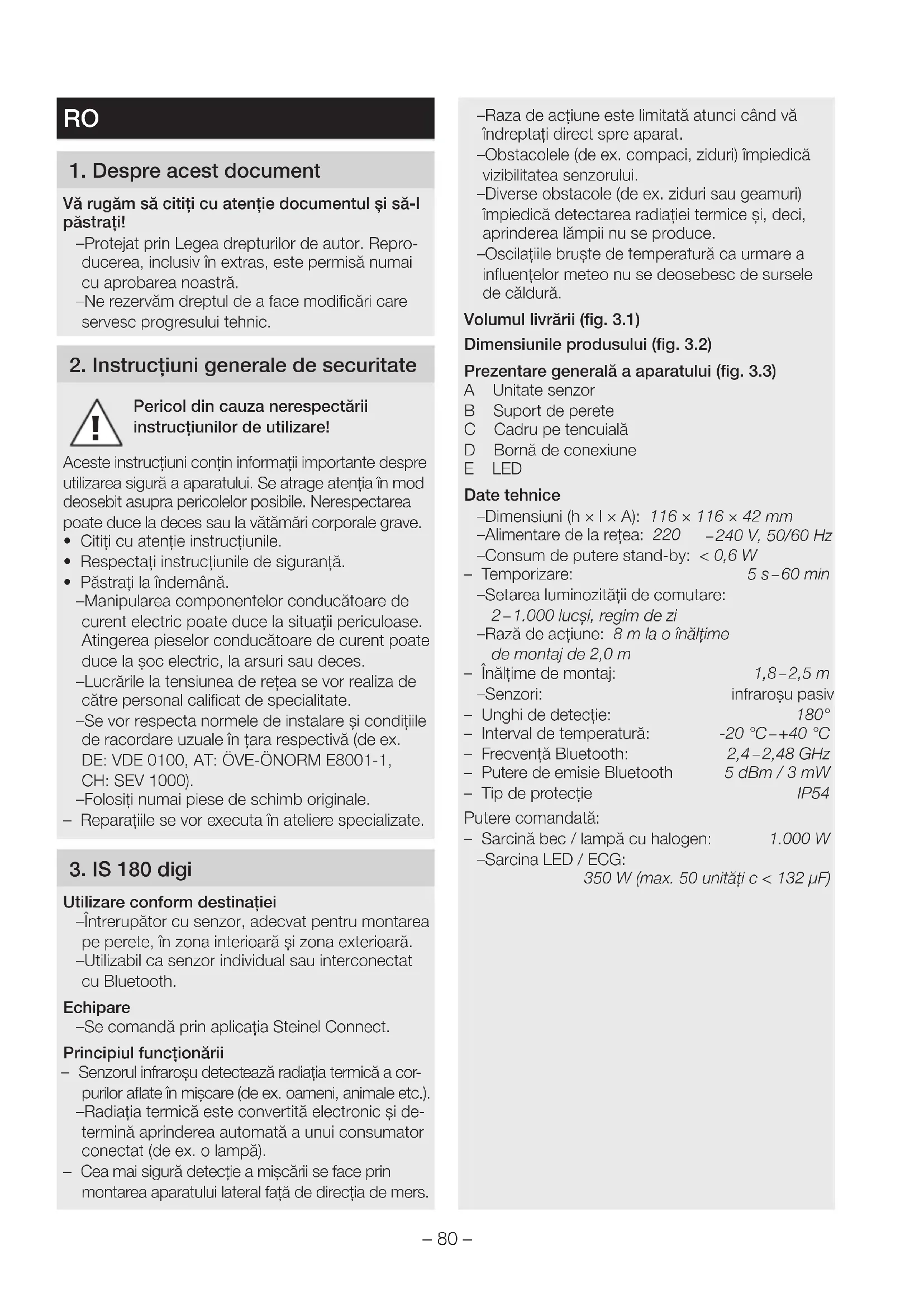 Utilizare conform destinaţiei – Întrerupător cu senzor, adecvat pentru montarea pe perete, în zona interioară şi zona exterioară. – Utilizabil ca senzor individual sau interconectat cu Bluetooth. Echipare – Se comandă prin aplicaţia Steinel Connect. Principiul funcţionării – Senzorul infraroşu detectează radiaţia termică a cor- purilor aflate în mişcare (de ex. oameni, animale etc.). – Radiaţia termică este convertită electronic şi de- termină aprinderea automată a unui consumator conectat (de ex. o lampă). – Cea mai sigură detecţie a mişcării se face prin montarea aparatului lateral faţă de direcţia de mers. – Raza de acţiune este limitată atunci când vă îndreptaţi direct spre aparat. – Obstacolele (de ex. compaci, ziduri) împiedică vizibilitatea senzorului. – Diverse obstacole (de ex. ziduri sau geamuri) împiedică detectarea radiaţiei termice şi, deci, aprinderea lămpii nu se produce. – Oscilaţiile bruşte de temperatură ca urmare a influenţelor meteo nu se deosebesc de sursele de căldură. Volumul livrării (fig. 3.1) Dimensiunile produsului (fig. 3.2) Prezentare generală a aparatului (fig. 3.3) A Unitate senzor B Suport de perete C Cadru pe tencuială D Bornă de conexiune E LED Date tehnice – Dimensiuni (h×l×A): 116×116×42mm – Alimentare de la reţea: 220 – 240V, 50/60Hz – Consum de putere stand-by: <0,6W – Temporizare: 5s – 60min – Setarea luminozităţii de comutare: 2 – 1.000lucşi, regim de zi – Rază de acţiune: 8m la o înălţime de montaj de 2,0 m – Înălţime de montaj: 1,8 – 2,5m – Senzori: infraroşu pasiv – Unghi de detecţie: 180° – Interval de temperatură: -20°C – +40°C – Frecvenţă Bluetooth: 2,4 – 2,48GHz – Putere de emisie Bluetooth 5dBm/3mW – Tip de protecţie IP54 Putere comandată: – Sarcină bec/lampă cu halogen: 1.000W – Sarcina LED / ECG: 350 W (max. 50 unități c < 132 µF)– 81 –