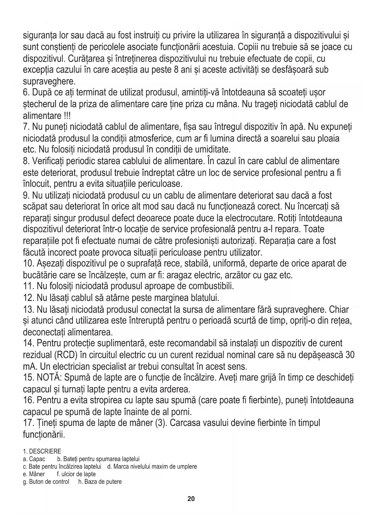 capacul și turnați lapte pentru a evita arderea. g. Buton de control h. Baza de putere