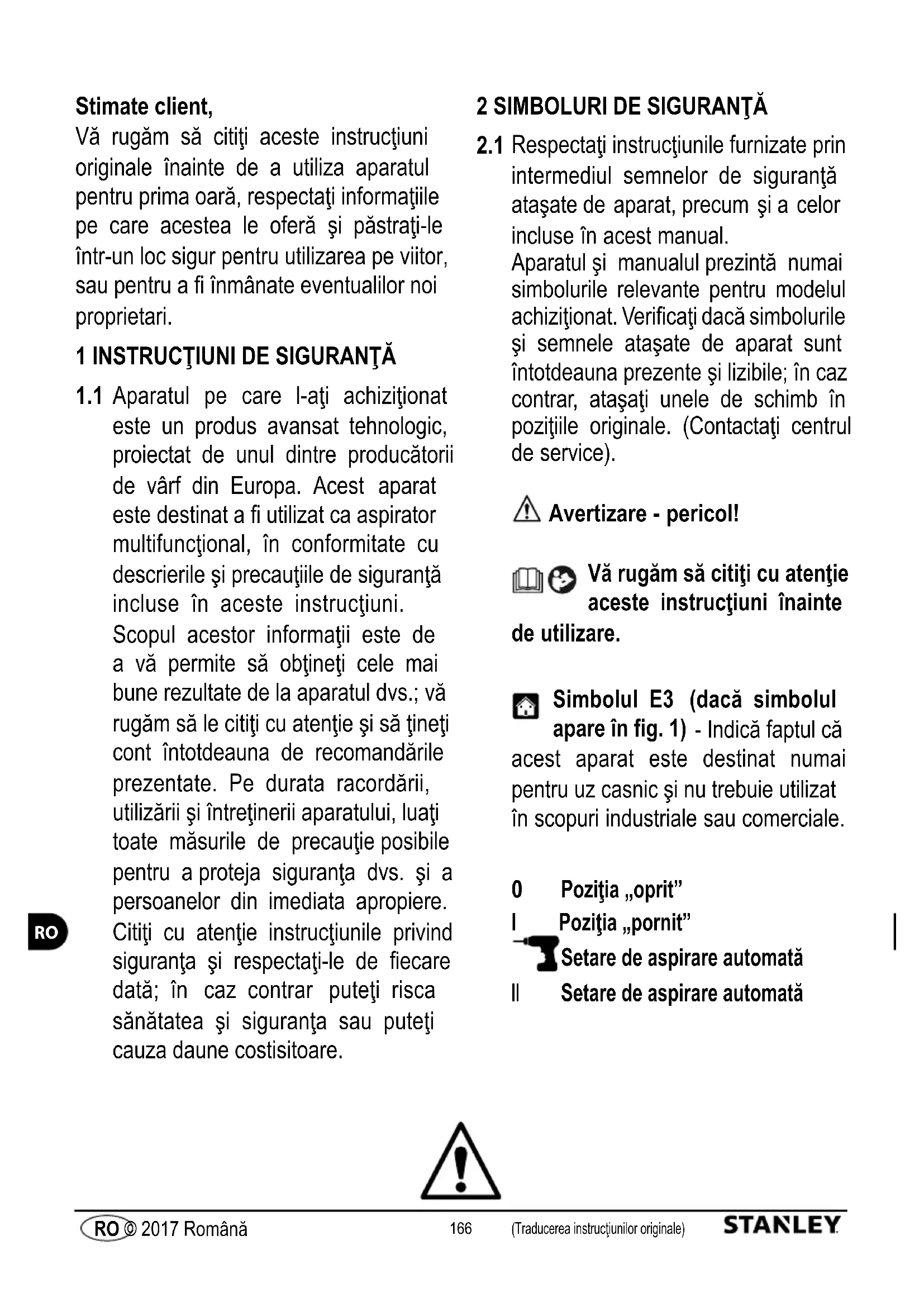DEPANAREA Probleme Cauze probabile Rezolvări Aparatul nu porneşte Nu există alimentare electrică Verificaţi dacă ştecherul este bine introdus în priză şi dacă există tensiune la reţeaua de alimentare (*) Probleme la circuitul electric-electronic Contactaţi centrul de service Aparatul nu aspiră material, sau aspirarea este slabă Accesorii în stare necorespunzătoare Verificaţi şi curăţaţi duzele, extensiile sau furtunurile Filtre murdare Curăţaţi filtrele Saci plini Goliţi / schimbaţi sacii Rezervor plin Goliţi rezervorul Unealta electrică nu porneşte (acolo unde este prevăzută o priză pentru unelte electrice) Ştecherul uneltei electrice nu este bine introdus în priza aspiratorului Introduceţi ştecherul în mod corespunzător Întrerupător oprit sau rotit pe I Rotiţi întrerupătorul pe poziţia unealtă electrică/II Din aparat iese praf Filtru nemontat Montaţi filtrul Filtru deteriorat Înlocuiţi filtrul uzat cu unul nou Furtun sau racorduri deteriorate Înlocuiţi piesele deteriorate Mirosuri neplăcute de la aparat pe durata funcţionării Filtre/saci murdari Înlocuiţi filtrele/sacii (*) Dacă motorul se opreşte şi nu reporneşte pe durata funcţionării, contactaţi centrul de service. Declaraţie de conformitate CE Noi, Annovi Reverberi S.p.A, cu sediul în Modena, Italia, declarăm faptul că următorul (următoarele) aparat (aparate) Stanley: Destinaţia aparatului: Aspirator de produse umede şi uscate Nr. model: SXVC20PE SXVC20PTE SXVC20XTE SXVC25PTDE SXVC30XTDE SXVC35PTDE SXVC50XTDE Puterea nominală: 1.2 kW 1.2 kW 1.4 kW 1.2 kW 1.6 kW 1.6 kW 1.6 kW este (sunt) conform (conforme) cu următoarele directive europene: 22014/35/EU, 2014/30/EU, 2011/65/EU , 2009/125/EC şi 2012/19/EU. şi a fost fabricat (au fost fabricate) în conformitate cu următoarele norme sau documente standardizate: EN 60335-1; EN 60335-2-2; EN 55014-1; EN 55014-2; EN 61000-3-2; EN 61000-3-3; EN 62233; EN 50581; Reg.1275/2008. Numele şi adresa persoanei responsabile de întocmirea dosarului tehnic: Stefano Reverberi / AR Managing Director Via ML King, 3 - 41122 Modena, Italia Data: 31.10.2017 MODENA (I) Stefano Reverberi Director General174 TM (Traducerea instrucţiunilor originale) RO © 2017 Română (Traducerea instrucţiunilor originale) RO © 2017 Română