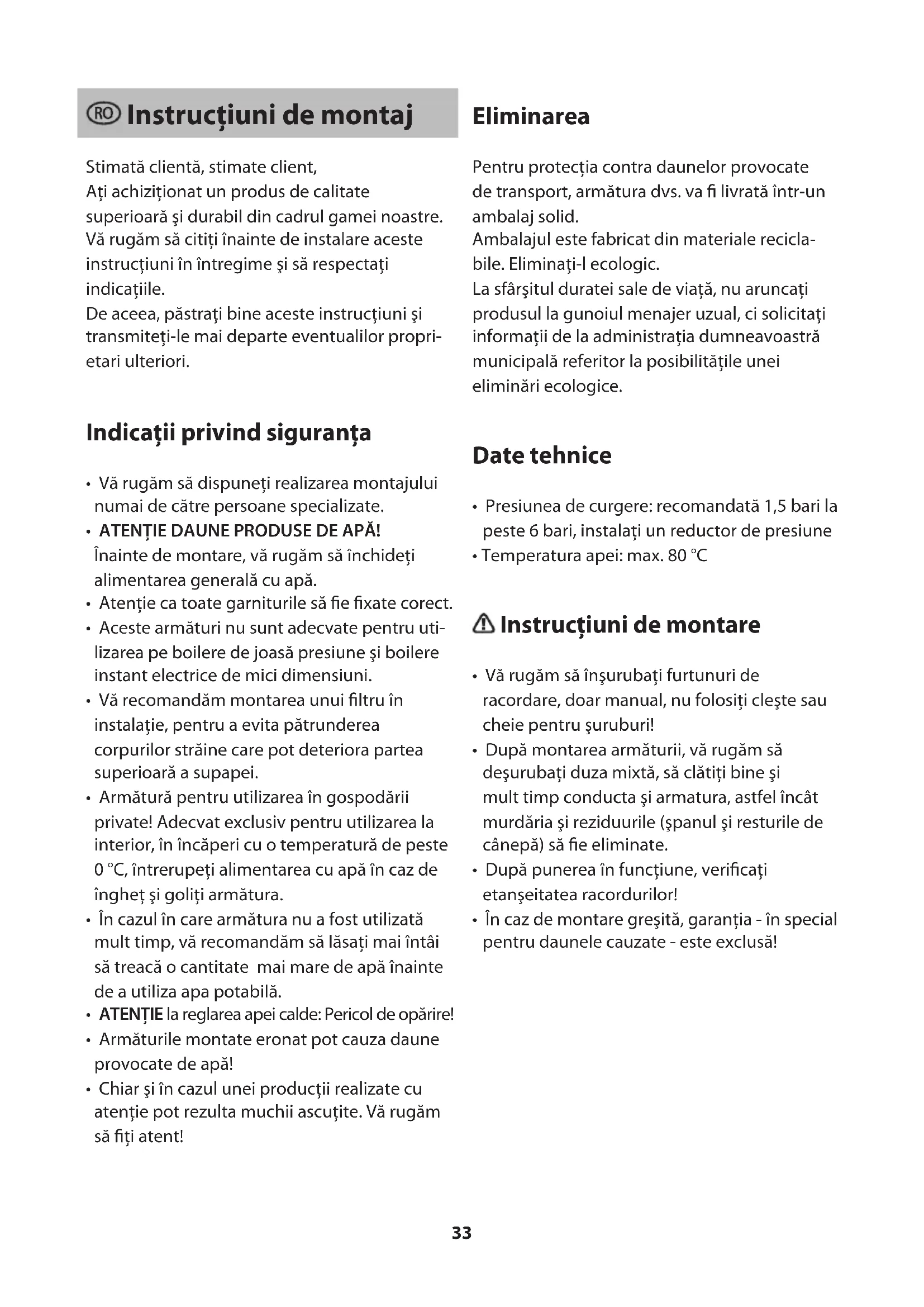 Ați achiziționat un produs de calitate superioară și durabil din cadrul gamei noastre. Vă rugăm să citiți înainte de instalare aceste instrucțiuni în întregime și să respectați indicațiile.