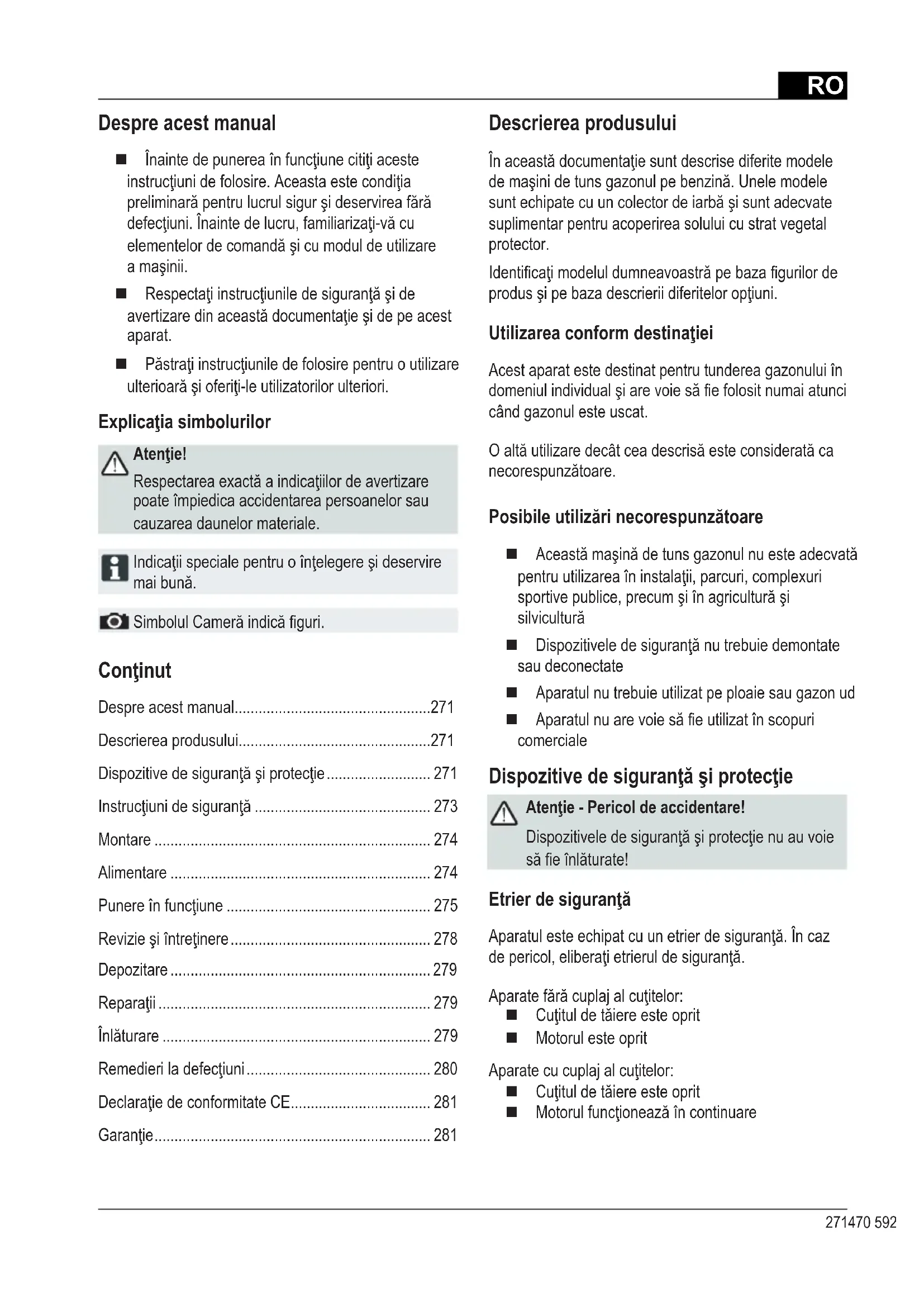 - Garanţie Despre acest manual Înaintedepunereaînfuncţiunecitiţiaceste instrucţiunidefolosire.Aceastaestecondiţia preliminarăpentrulucrulsigurşideservireafără defecţiuni.Înaintedelucru,familiarizaţi-văcu elementelordecomandăşicumoduldeutilizare amaşinii. Respectaţiinstrucţiuniledesiguranţăşide avertizaredinaceastădocumentaţieşidepeacest aparat. Păstraţiinstrucţiuniledefolosirepentruoutilizare ulterioarăşioferiţi-leutilizatorilorulteriori. Explicaţia simbolurilor Atenţie! Respectareaexactăaindicaţiilordeavertizare poate împiedica accidentarea persoanelor sau cauzarea daunelor materiale. Indicaţiispecialepentruoînţelegereşideservire maibună. SimbolulCamerăindicăguri. Descrierea produsului Înaceastădocumentaţiesuntdescrisediferitemodele demaşinidetunsgazonulpebenzină.Unelemodele suntechipatecuuncolectordeiarbăşisuntadecvate suplimentar pentru acoperirea solului cu strat vegetal protector. Identicaţimodeluldumneavoastrăpebazagurilorde produsşipebazadescrieriidiferiteloropţiuni. Utilizarea conform destinaţiei Acest aparat este destinat pentru tunderea gazonului în domeniulindividualşiarevoiesăefolositnumaiatunci când gazonul este uscat. Oaltăutilizaredecâtceadescrisăesteconsideratăca necorespunzătoare. Posibile utilizări necorespunzătoare Aceastămaşinădetunsgazonulnuesteadecvată pentruutilizareaîninstalaţii,parcuri,complexuri sportivepublice,precumşiînagriculturăşi silvicultură Dispozitiveledesiguranţănutrebuiedemontate sau deconectate Aparatul nu trebuie utilizat pe ploaie sau gazon ud Aparatulnuarevoiesăeutilizatînscopuri comerciale Dispozitive de siguranţă şi protecţie Atenţie - Pericol de accidentare! Dispozitiveledesiguranţăşiprotecţienuauvoie săeînlăturate! Etrier de siguranţă Aparatulesteechipatcuunetrierdesiguranţă.Încaz depericol,eliberaţietrieruldesiguranţă. Aparatefărăcuplajalcuţitelor: Cuţituldetăiereesteoprit Motorul este oprit Aparatecucuplajalcuţitelor: Cuţituldetăiereesteoprit MotorulfuncţioneazăîncontinuareRO Traducerea instrucţiunilor de folosire originale p. 281