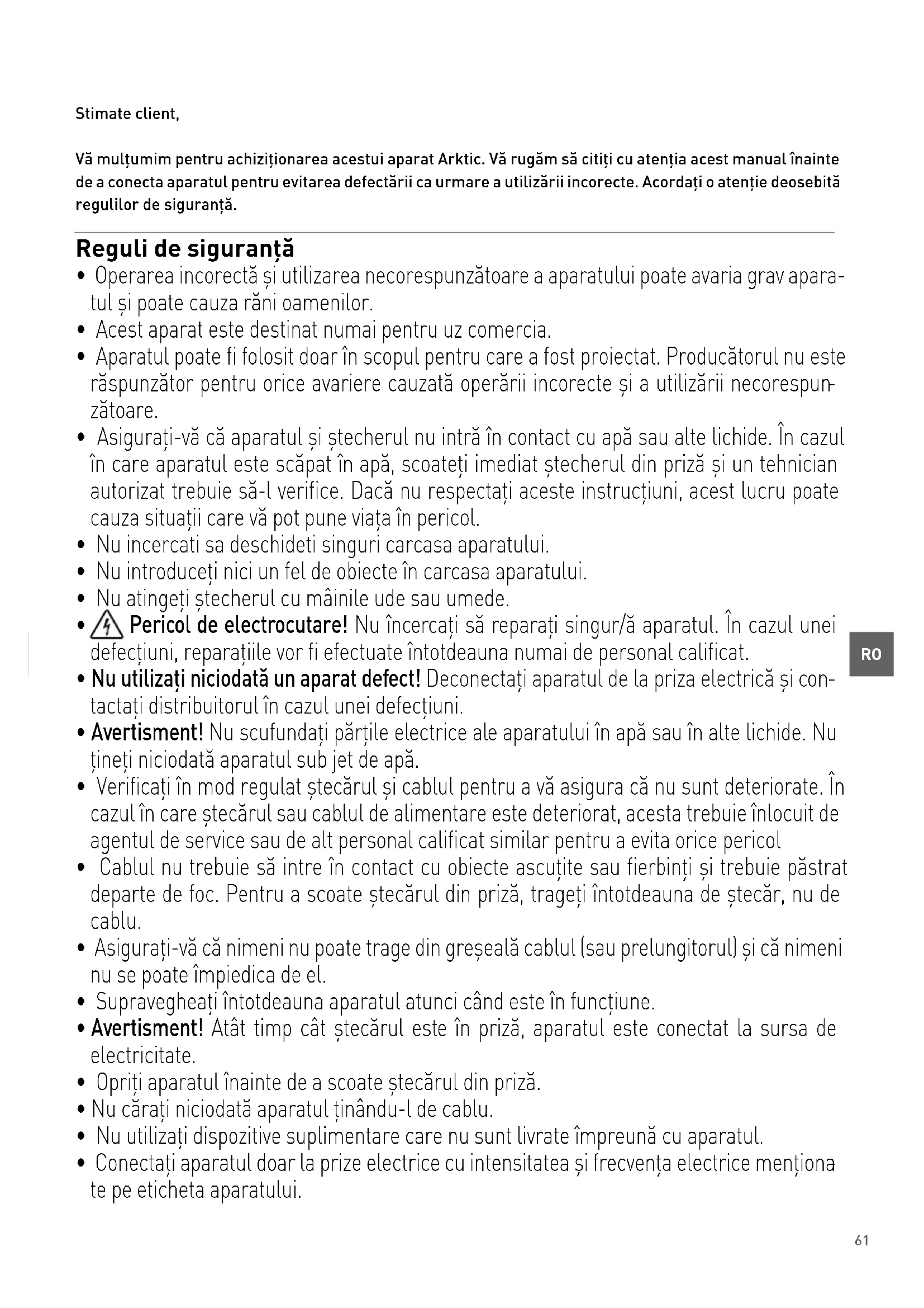 Stimate client, Vă mulțumim pentru achiziționarea acestui aparat Arktic. Vă rugăm să citiți cu atenția acest manual înainte de a conecta aparatul pentru evitarea defectării ca urmare a utilizării incorecte. Acordați o atenție deosebită regulilor de siguranță. Reguli de siguranță