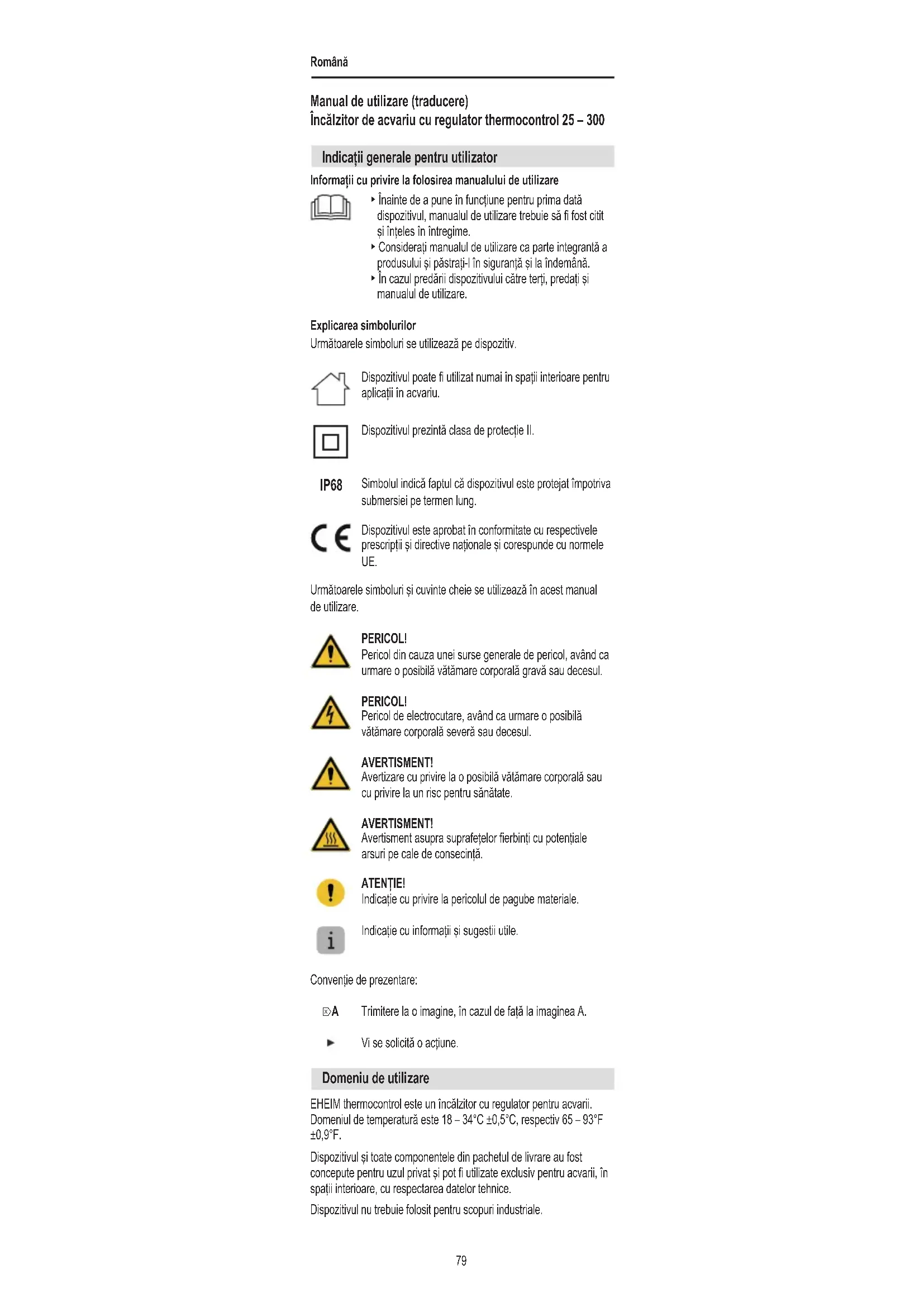 Domeniu de utilizare EHEIM thermocontrol este un încălzitor cu regulator pentru acvarii. Domeniul de temperatură este 18 – 34°C ±0,5°C, respectiv 65 – 93°F ±0,9°F. Dispozitivul şi toate componentele din pachetul de livrare au fost concepute pentru uzul privat şi pot utilizate exclusiv pentru acvarii, în spaţii interioare, cu respectarea datelor tehnice. Dispozitivul nu trebuie folosit pentru scopuri industriale.Română