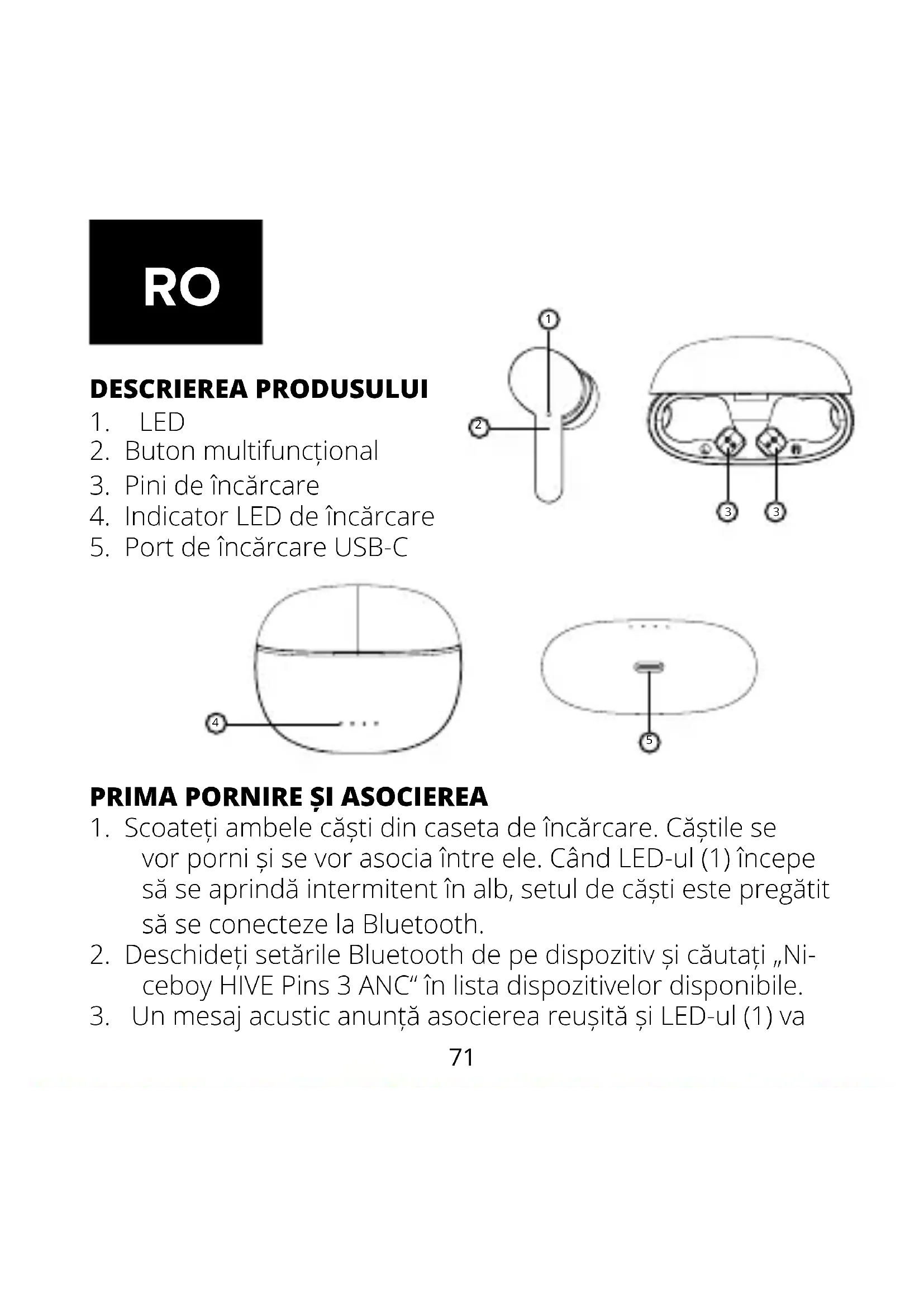 tea se vor porni automat și se vor asocia una cu cealaltă. Procesul de resetare este acum nalizat.76 SPECIFICAȚII BT: 5.3 Bandă de frecvență: 2,4GHz Puterea de radiofrecvență: ≤ 2,5mW Proluri BT: HFP, A2DP, AVRCP Codecuri acceptate: AAC, SBC Grad de protecție: IPX4 Raza de transmisie: 10m Difuzor: 10mm Frecvență: 20Hz-20kHz Sensibilitate: 118±1,5dB Durata de viață a bateriei (căști): până la 10 ore Durata maximă de viață a bateriei: până la 40ore Capacitatea bateriei căștilor: 50mAh Capacitatea bateriei casetei de încărcare: 400mAh Asistenți vocali: Siri și Google Assistant Asociere multipunct: DA CONȚINUTUL PACHETULUI: Căști Niceboy HIVE Pins 3 ANC Cutie de încărcare Sfaturi de înlocuire pentru căști Cablu USB-C Manual77