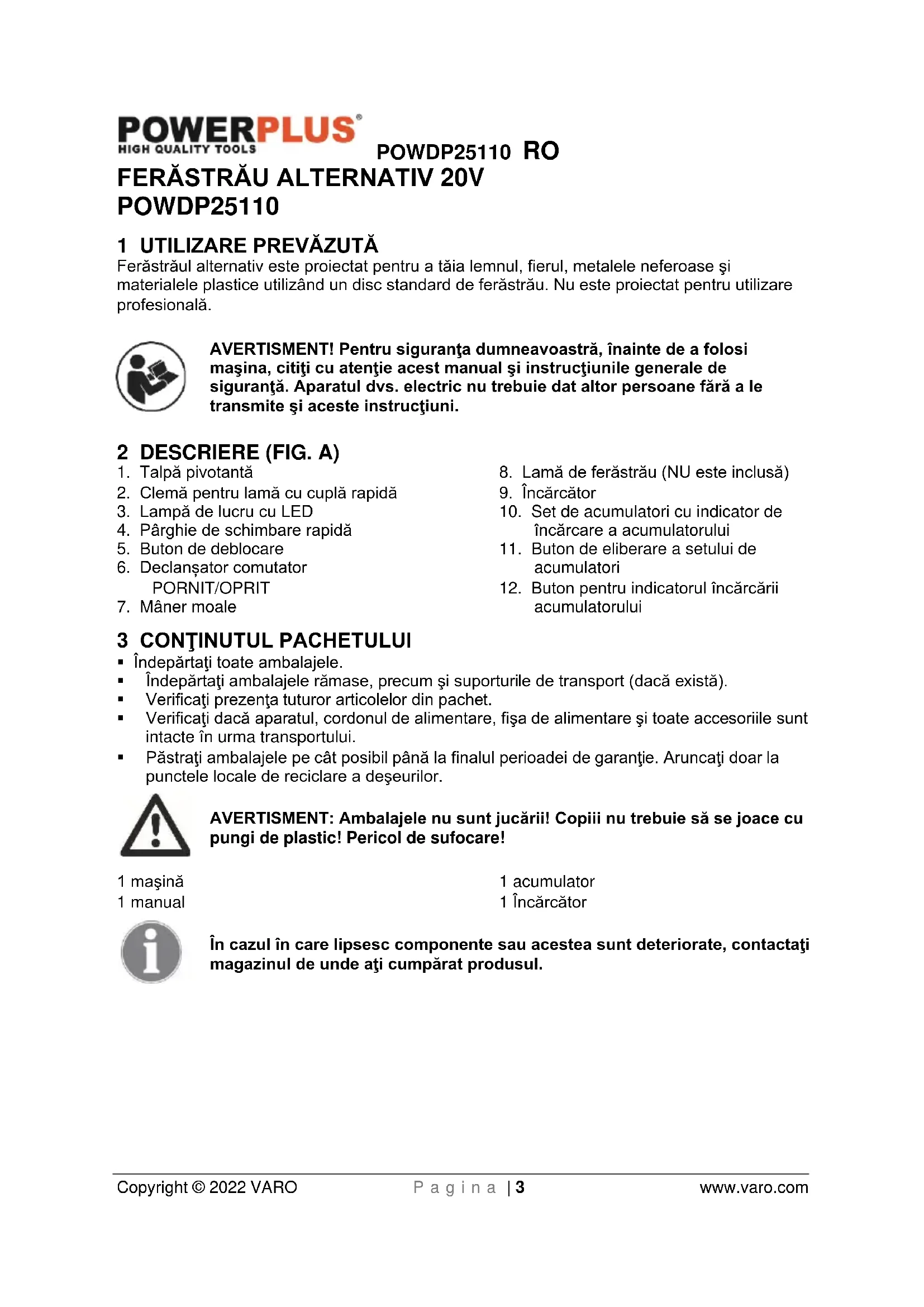 produsul: Ferăstrău alternativ 20V marcă înregistrată: PowerPlus model: POWDP25100 este în conformitate cu specificaţiile esenţiale şi alte prevederi relevante ale Directivelor Europene aplicabile, pe baza aplicării standardelor europene armonizate. Orice modificare neautorizată a aparatelor atrage după sine anularea acestei declaraţii. Directivele europene (inclusiv, dacă este cazul, amendamentele lor, până la data semnăturii); 2011/65/EU 2006/42/EC 2014/30/EU Standardele europene armonizate (inclusiv, dacă este cazul, amendamentele lor, până la data semnăturii); EN62841-1 : 2015 EN62841-2-11 : 2016 EN55014-1 : 2017 EN55014-2 : 2015 Persoana care păstrează documentaţia tehnică : Philippe Vankerkhove, VARO – Vic. Van Rompuy N.V. Subsemnatul acţionează în numele Directorului general executiv al societăţii, Ludo Mertens Divizia de reglementare – Director de conformitate 24/06/2021, Lier - BelgiumPOWDP25110 PL Copyright © 2022 VARO P a g e | 1 www.varo.com 1 PRZEZNACZENIE ........................................................................... 3