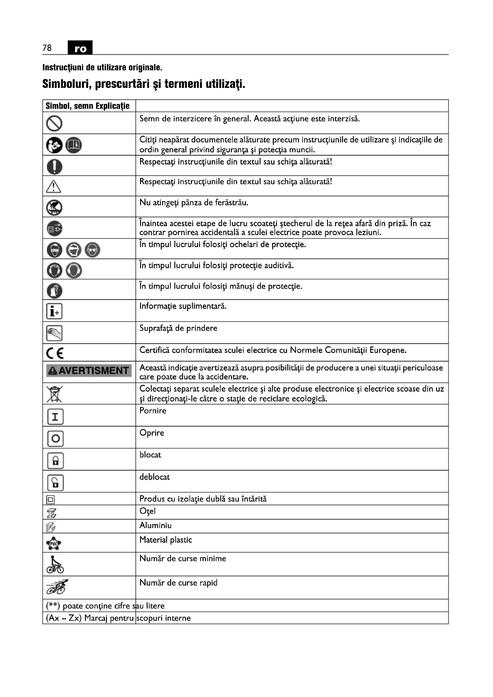 Instrucţiuni de utilizare originale. Simboluri, prescurtări şi termeni utilizaţi. Simbol, semn Explicaţie Semn de interzicere în general. Această acţiune este interzisă. Citiţi neapărat documentele alăturate precum instrucţiunile de utilizare şi indicaţiile de ordin general privind siguranţa şi potecţia muncii. Respectaţi instrucţiunile din textul sau schiţa alăturată! Respectaţi instrucţiunile din textul sau schiţa alăturată! Nu atingeţi pânza de ferăstrău. Înaintea acestei etape de lucru scoateţi ştecherul de la reţea afară din priză. În caz contrar pornirea accidentală a sculei electrice poate provoca leziuni. În timpul lucrului folosiţi ochelari de protecţie. În timpul lucrului folosiţi protecţie auditivă. În timpul lucrului folosiţi mănuşi de protecţie. Informaţie suplimentară. Suprafaţă de prindere Certifică conformitatea sculei electrice cu Normele Comunităţii Europene. Această indicaţie avertizează asupra posibilităţii de producere a unei situaţii periculoase care poate duce la accidentare. Colectaţi separat sculele electrice şi alte produse electronice şi electrice scoase din uz şi direcţionaţi-le către o staţie de reciclare ecologică. Pornire Oprire blocat deblocat Produs cu izolaţie dublă sau întărită Oţel Aluminiu Material plastic Număr de curse minime Număr de curse rapid (**) poate conţine cifre sau litere (Ax – Zx) Marcaj pentru scopuri interne OBJ_BUCH-0000000078-004.book Page 78 Wednesday, February 26, 2020 1:28 PM79