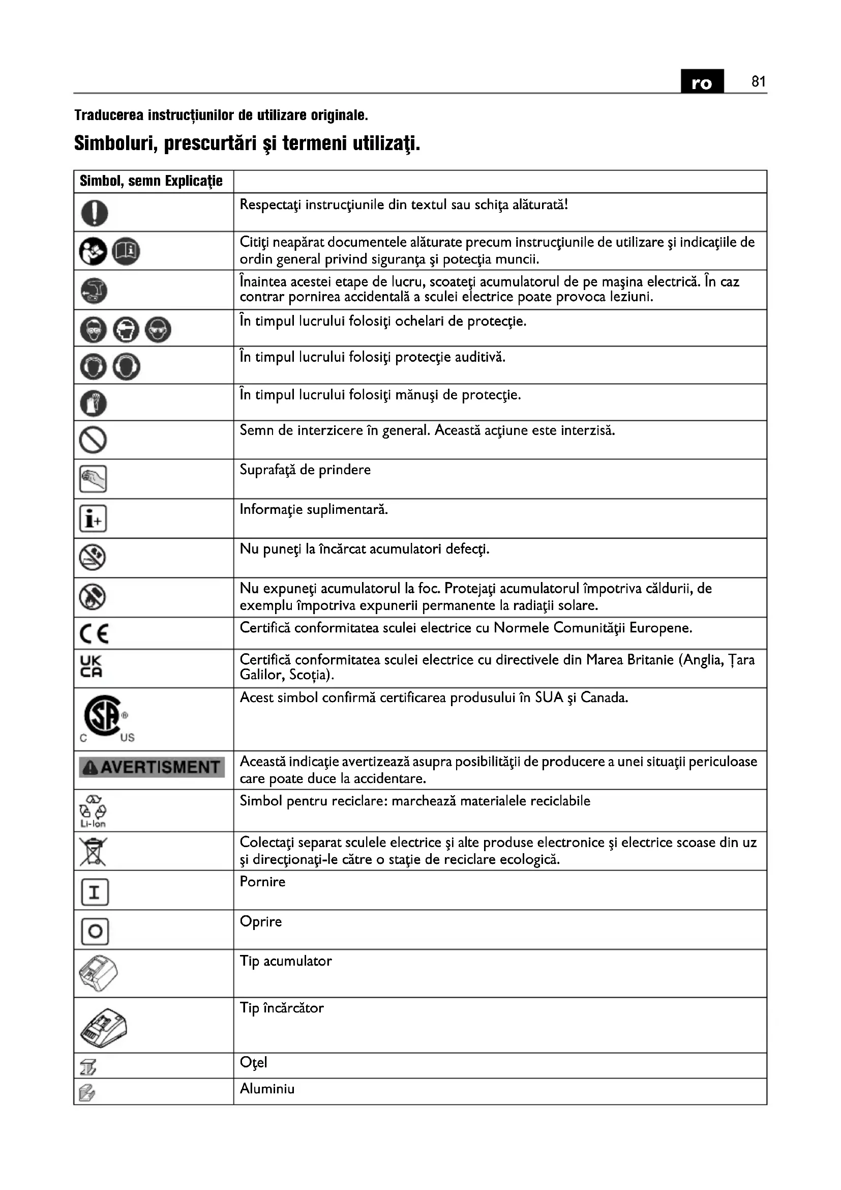 Traducerea instrucțiunilor de utilizare originale. Simboluri, prescurtări şi termeni utilizaţi. Simbol, semn Explicaţie Respectaţi instrucţiunile din textul sau schiţa alăturată! Citiţi neapărat documentele alăturate precum instrucţiunile de utilizare şi indicaţiile de ordin general privind siguranţa şi potecţia muncii. Înaintea acestei etape de lucru, scoateţi acumulatorul de pe maşina electrică. În caz contrar pornirea accidentală a sculei electrice poate provoca leziuni. În timpul lucrului folosiţi ochelari de protecţie. În timpul lucrului folosiţi protecţie auditivă. În timpul lucrului folosiţi mănuşi de protecţie. Semn de interzicere în general. Această acţiune este interzisă. Suprafaţă de prindere Informaţie suplimentară. Nu puneţi la încărcat acumulatori defecţi. Nu expuneţi acumulatorul la foc. Protejaţi acumulatorul împotriva căldurii, de exemplu împotriva expunerii permanente la radiaţii solare. Certifică conformitatea sculei electrice cu Normele Comunităţii Europene. Certifică conformitatea sculei electrice cu directivele din Marea Britanie (Anglia, Țara Galilor, Scoția). Acest simbol confirmă certificarea produsului în SUA şi Canada. Această indicaţie avertizează asupra posibilităţii de producere a unei situaţii periculoase care poate duce la accidentare. Simbol pentru reciclare: marchează materialele reciclabile Colectaţi separat sculele electrice şi alte produse electronice şi electrice scoase din uz şi direcţionaţi-le către o staţie de reciclare ecologică. Pornire Oprire Tip acumulator Tip încărcător Oţel Aluminiu82