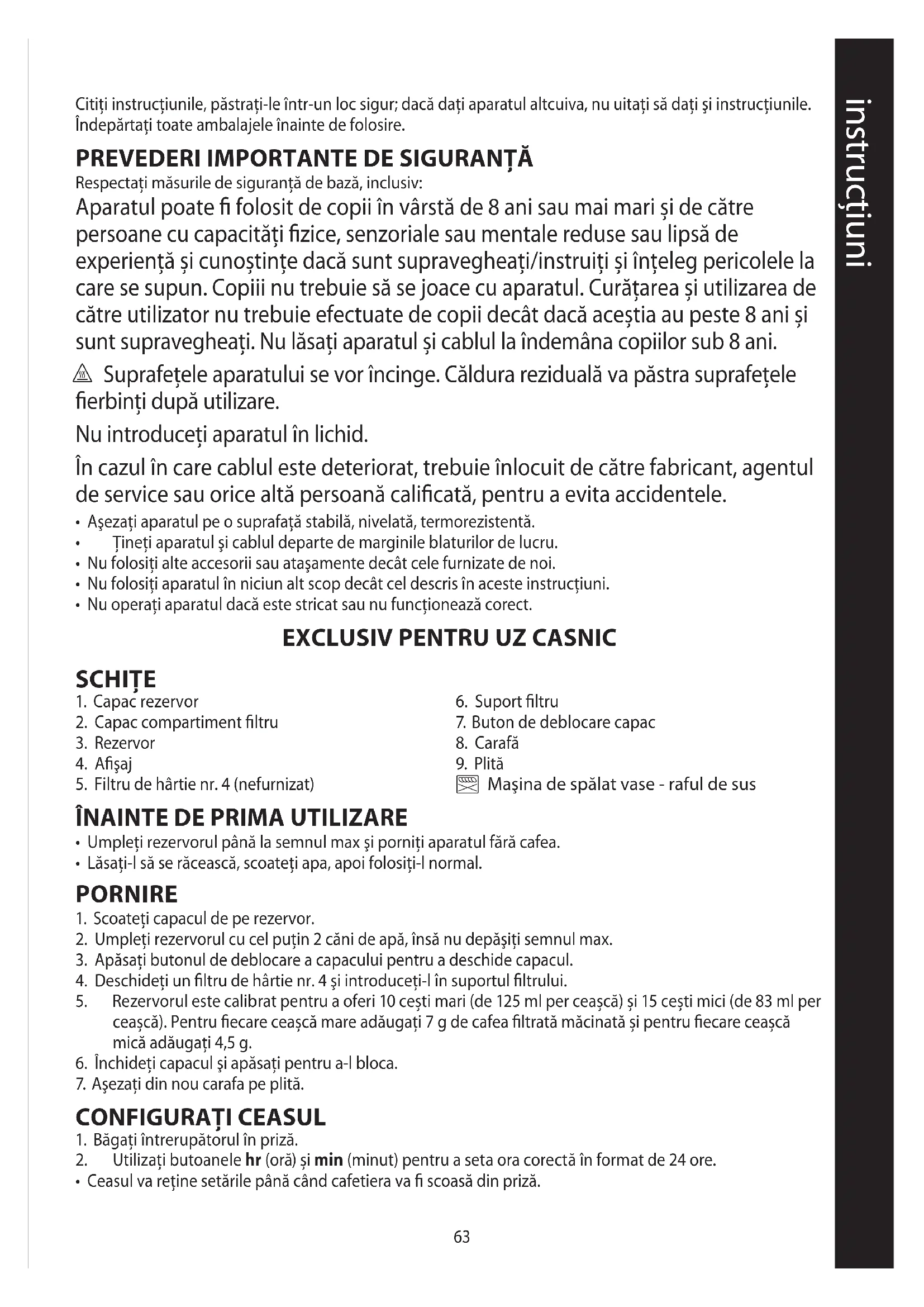 Respectaţi măsurile de siguranţă de bază, inclusiv: Aparatul poate fi folosit de copii în vârstă de 8 ani sau mai mari și de către persoane cu capacităţi fizice, senzoriale sau mentale reduse sau lipsă de experienţă și cunoștinţe dacă sunt supravegheaţi/instruiţi și înţeleg pericolele la care se supun. Copiii nu trebuie să se joace cu aparatul. Curăţarea și utilizarea de către utilizator nu trebuie efectuate de copii decât dacă aceștia au peste 8 ani și sunt supravegheaţi. Nu lăsaţi aparatul și cablul la îndemâna copiilor sub 8 ani. h Suprafeţele aparatului se vor încinge. Căldura reziduală va păstra suprafeţele fierbinţi după utilizare. Nu introduceţi aparatul în lichid. În cazul în care cablul este deteriorat, trebuie înlocuit de către fabricant, agentul de service sau orice altă persoană calificată, pentru a evita accidentele.