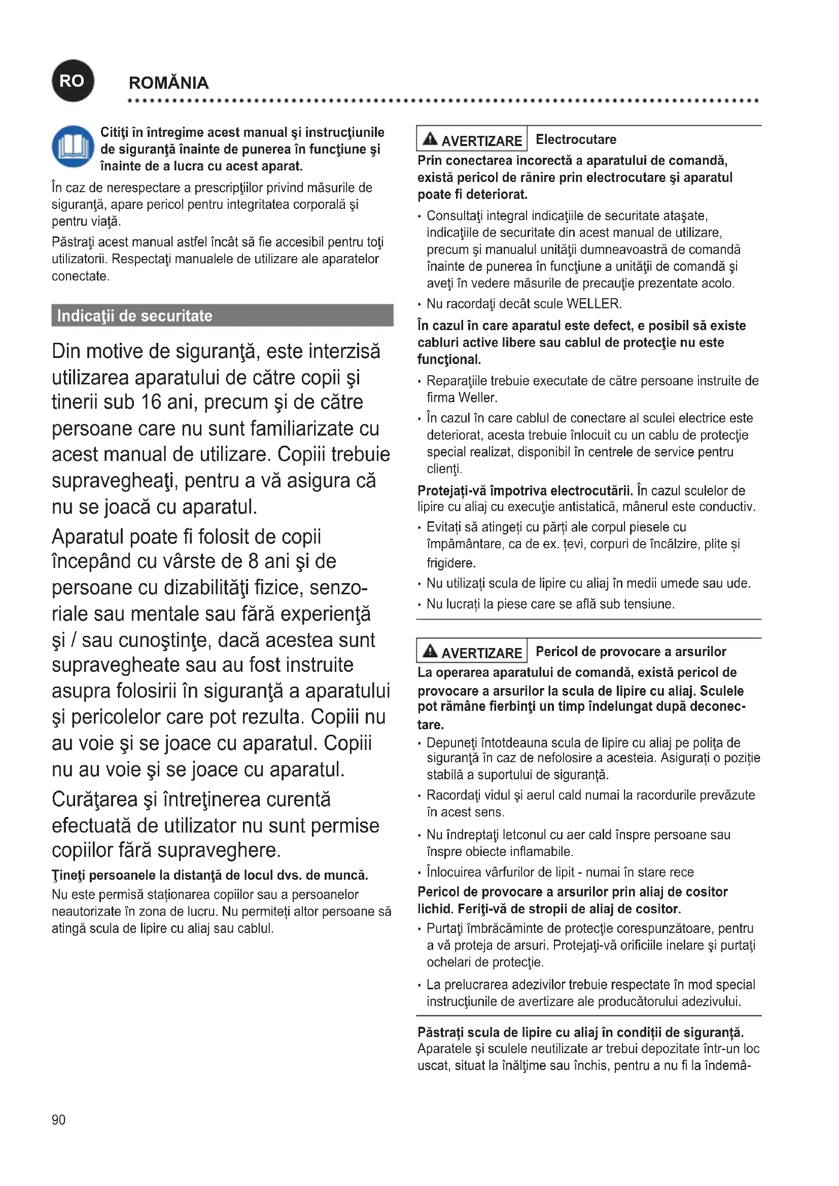 riale sau mentale sau fără experienţă şi / sau cunoştinţe, dacă acestea sunt supravegheate sau au fost instruite asupra folosirii în siguranţă a aparatului şi pericolelor care pot rezulta. Copiii nu au voie şi se joace cu aparatul. Copiii nu au voie şi se joace cu aparatul. Curăţarea şi întreţinerea curentă efectuată de utilizator nu sunt permise copiilor fără supraveghere. Ţineţi persoanele la distanţă de locul dvs. de muncă. Nu este permisă staționarea copiilor sau a persoanelor neautorizate în zona de lucru. Nu permiteți altor persoane să atingă scula de lipire cu aliaj sau cablul. AVERTIZARE Electrocutare Prin conectarea incorectă a aparatului de comandă, există pericol de rănire prin electrocutare şi aparatul poate deteriorat.