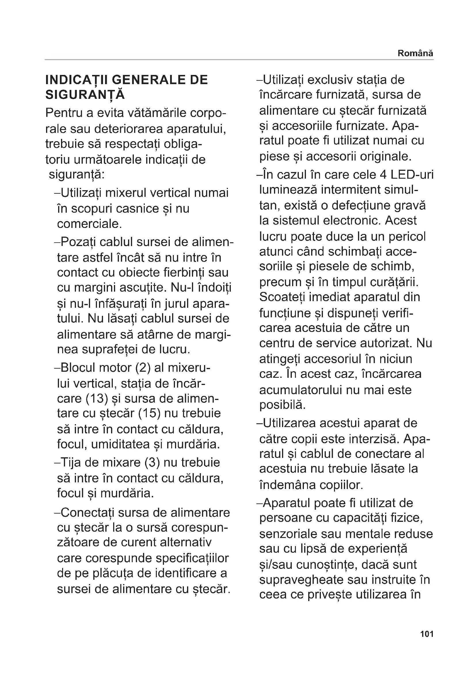 SIGURANȚĂ Pentru a evita vătămările corpo- rale sau deteriorarea aparatului, trebuie să respectați obliga- toriu următoarele indicații de siguranță: – Utilizați mixerul vertical numai în scopuri casnice și nu comerciale. – Pozați cablul sursei de alimen- tare astfel încât să nu intre în contact cu obiecte erbinți sau cu margini ascuțite. Nu-l îndoiți și nu-l înfășurați în jurul apara- tului. Nu lăsați cablul sursei de alimentare să atârne de margi- nea suprafeței de lucru. – Blocul motor (2) al mixeru- lui vertical, stația de încăr- care (13) și sursa de alimen- tare cu ștecăr (15) nu trebuie să intre în contact cu căldura, focul, umiditatea și murdăria. – Tija de mixare (3) nu trebuie să intre în contact cu căldura, focul și murdăria. – Conectați sursa de alimentare cu ștecăr la o sursă corespun- zătoare de curent alternativ care corespunde specicațiilor de pe plăcuța de identicare a sursei de alimentare cu ștecăr. – Utilizați exclusiv stația de încărcare furnizată, sursa de alimentare cu ștecăr furnizată și accesoriile furnizate. Apa- ratul poate utilizat numai cu piese și accesorii originale. – În cazul în care cele 4 LED-uri luminează intermitent simul- tan, există o defecțiune gravă la sistemul electronic. Acest lucru poate duce la un pericol atunci când schimbați acce- soriile și piesele de schimb, precum și în timpul curățării. Scoateți imediat aparatul din funcțiune și dispuneți veri- carea acestuia de către un centru de service autorizat. Nu atingeți accesoriul în niciun caz. În acest caz, încărcarea acumulatorului nu mai este posibilă. – Utilizarea acestui aparat de către copii este interzisă. Apa- ratul și cablul de conectare al acestuia nu trebuie lăsate la îndemâna copiilor. – Aparatul poate utilizat de persoane cu capacități zice, senzoriale sau mentale reduse sau cu lipsă de experiență și/sau cunoștințe, dacă sunt supravegheate sau instruite în ceea ce privește utilizarea în Română102 condiții de siguranță și dacă acestea au înțeles pericolele asociate. – Copiii nu au voie să se joace cu aparatul. – Utilizați mixerul vertical doar atunci când acesta se aă într-un vas cu fund plat. – Mixerul vertical nu trebuie scu- fundat în amestec deasupra punctului de conectare al tijei de mixare și blocului motor. – Nu lăsați aparatul nesuprave- gheat în timpul funcționării. – Nu scufundați niciodată în întregime mixerul vertical, stația de încărcare și sursa de alimentare cu ștecăr în apă sau alte lichide. Nu expuneți niciodată aparatul la ploaie sau umiditate. În cazul în care aparatul a căzut o dată în apă, mai întâi scoateți sursa de alimentare cu ștecăr a stației de încărcare din priză și apoi scoateți piesele aparatului din apă. După aceea, dispuneți vericarea întregului aparat de către un centru de service autorizat, înainte de a-l pune din nou în funcțiune. – Nu utilizați aparatul cu mâi- nile ude. Nu utilizați aparatul atunci când este ud sau umed sau atunci când vă aați pe o suprafață umedă. Nu utilizați aparatul în aer liber. – Mixerul vertical și stația de încărcare nu trebuie curățate în mașina de spălat vase. – În timpul utilizării mixerului vertical, nu atingeți niciodată accesoriile și nu introduceți obiecte în mixerul vertical atunci când funcționează. Pericol de rănire – În caz de defecțiuni la stația de încărcare, scoateți întot- deauna sursa de alimentare cu ștecăr din priză. În acest scop, trageți de ștecăr și nu de cablu. – În caz de deteriorări ale pie- selor aparatului, întrerupeți imediat funcționarea pentru a evita pericolele. După aceea, dispuneți vericarea întregului aparat de către un centru de service autorizat, înainte de a-l pune din nou în funcțiune. – Dacă sursa de alimentare cu ștecăr sau cablul sursei de alimentare este deteriorat, acesta trebuie înlocuit cu o sursă de alimentare cu ștecăr originală de la producător sau de la serviciul clienți de la nivel național. Română103 – Nu porniți niciodată mixerul vertical atunci când îl cură- țați, când scoateți, respectiv montați accesoriile sau când schimbați accesoriile și piesele de schimb. Prin urmare, țineți degetele departe de taste. Nu atingeți lamele accesoriilor, deoarece acestea sunt foarte ascuțite. – Alimentele pot stropi în tim- pul procesării. Prin urmare, lăsați alimentele calde să se răcească înainte de proce- sare, pentru a evita opărirea. – Dacă utilizați mixerul vertical într-o oală, țineți oala departe de suprafața de gătit. Română – Asigurați-vă că locașul pentru accesoriu este amplasat în întregime pe știftul arborelui de antrenare. Accesoriile slăbite, care nu sunt xe, nu trebuie utilizate și trebuie înlocuite. Pericol de explozie – Protejați acumulatorii de căldură și foc. Prezentare generală a așajului LED (6) LED-uri Descriere Mixer vertical în stația de încărcare oprit Acumulator încărcat complet luminează intermitent individual de la stânga la dreapta Acumulatorul se încarcă, ultimul LED care luminează intermitent indică starea de încărcare toate luminează intermitent în sincron Eroare de funcționare (aparat pornit în stația de încărcare) Mixer vertical în afara stației de încărcare 1, 2, 3 sau 4 LED-uri se aprind Aparatul este utilizat, numărul de LED-uri indică starea actuală de încărcare LED 1 luminează intermitent lent (1 s pornit/1 s oprit) Acumulator gol LED 1 luminează intermitent scurt (0,1 s pornit/1 s oprit) Acumulator defect (consultați „SCHIMBAREA ACUMULATORULUI“) toate cele 4 LED-uri luminează intermitent lent (1 s pornit/1 s oprit) Protecție la suprasarcină (consultați „DESCRIEREA FUNCȚIILOR“)104 – Disc de amestecat (12): Pentru amestecarea alimentelor cremoase Mixerul vertical 