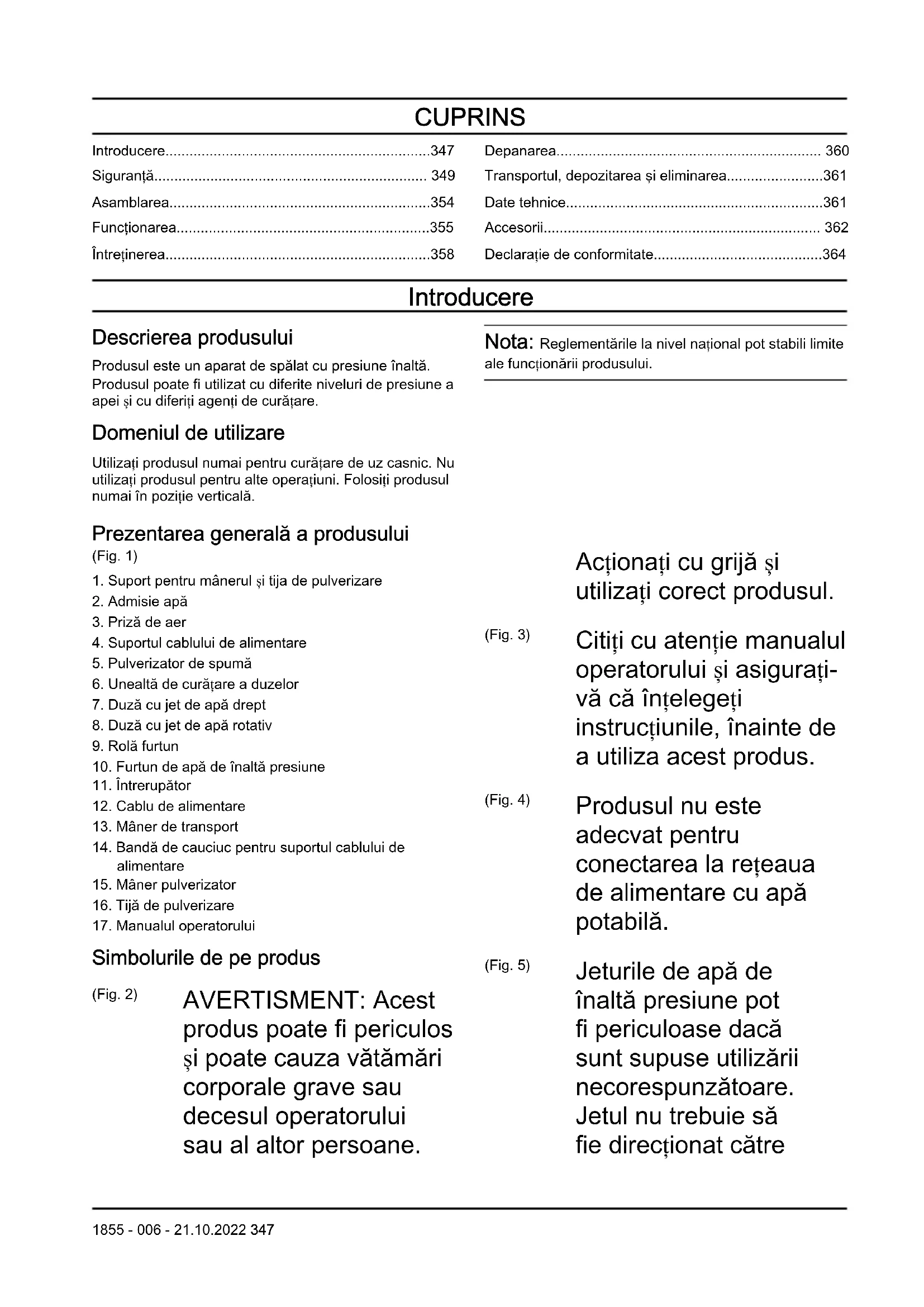 Simbolurile de pe produs (Fig. 2) AVERTISMENT: Acest produs poate fi periculos și poate cauza vătămări corporale grave sau decesul operatorului sau al altor persoane. Acționați cu grijă și utilizați corect produsul. (Fig. 3) Citiți cu atenție manualul operatorului și asigurați- vă că înțelegeți instrucțiunile, înainte de a utiliza acest produs. (Fig. 4) Produsul nu este adecvat pentru conectarea la rețeaua de alimentare cu apă potabilă. (Fig. 5) Jeturile de apă de înaltă presiune pot fi periculoase dacă sunt supuse utilizării necorespunzătoare. Jetul nu trebuie să fie direcționat către 1855 - 006 - 21.10.2022 347persoane, echipamente electrice sau către produs. (Fig. 6) Marcaj privind mediului înconjurător. Nici produsul și nici ambalajul său nu sunt deșeuri menajere. Reciclați-l la o unitate de eliminare autorizată pentru echipamente electrice și electronice. (Fig. 7) Unealtă clasa II. (Fig. 8) Produsul este conform cu directivele CE aplicabile. (Fig. 9) Produsul este conform cu directivele Uniunii Vamale Euroasiatice aplicabile. (Fig. 10) Produsul este conform cu directivele UkrSEPRO aplicabile. (Fig. 11) Produsul este conform cu directivele RCM aplicabile. Se aplică numai pentru AU/NZ. (Fig. 12) Etichetă privind emisiile de zgomot în mediu, conform directivelor și reglementărilor din UE și Regatul Unit și legislației din New South Wales „Regulamentele privind măsurile de protecție a mediului (controlul zgomotului) din 2017”. Nivelul de putere sonoră garantat al produsului este specificat în Date tehnice la pagina 361