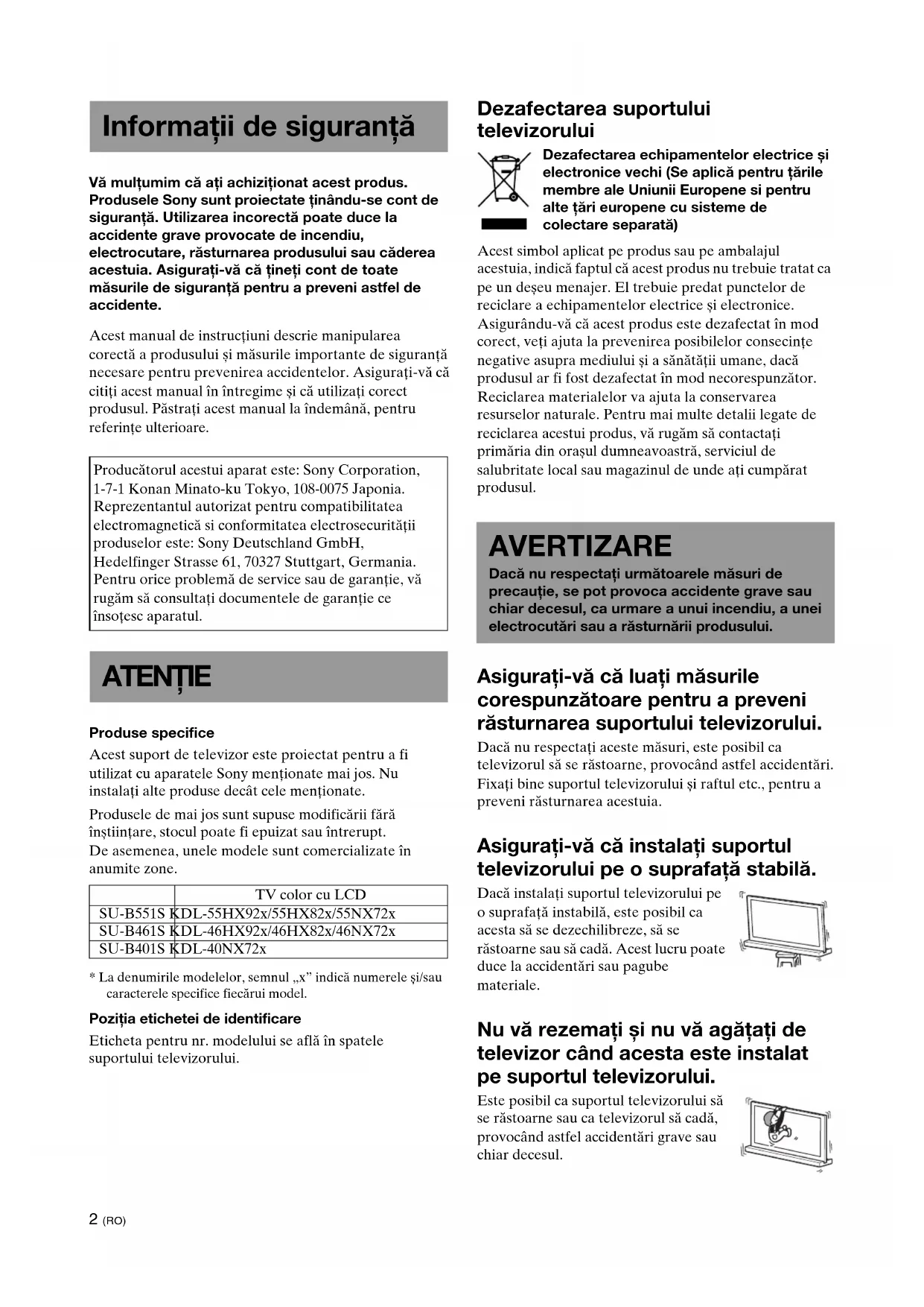 - La denumirile modelelor, semnul „x” indică numerele și/sau caracterele specifice fiecărui model. Poziţia etichetei de identificare Eticheta pentru nr. modelului se află în spatele suportului televizorului. Dezafectarea suportului televizorului Dezafectarea echipamentelor electrice și electronice vechi (Se aplică pentru ţările membre ale Uniunii Europene si pentru alte ţări europene cu sisteme de colectare separată) Acest simbol aplicat pe produs sau pe ambalajul acestuia, indică faptul că acest produs nu trebuie tratat ca pe un deșeu menajer. El trebuie predat punctelor de reciclare a echipamentelor electrice și electronice. Asigurându-vă că acest produs este dezafectat în mod corect, veţi ajuta la prevenirea posibilelor consecinţe negative asupra mediului și a sănătăţii umane, dacă produsul ar fi fost dezafectat în mod necorespunzător. Reciclarea materialelor va ajuta la conservarea resurselor naturale. Pentru mai multe detalii legate de reciclarea acestui produs, vă rugăm să contactaţi primăria din orașul dumneavoastră, serviciul de salubritate local sau magazinul de unde aţi cumpărat produsul. Asiguraţi-vă că luaţi măsurile corespunzătoare pentru a preveni răsturnarea suportului televizorului. Dacă nu respectaţi aceste măsuri, este posibil ca televizorul să se răstoarne, provocând astfel accidentări. Fixaţi bine suportul televizorului și raftul etc., pentru a preveni răsturnarea acestuia. Asiguraţi-vă că instalaţi suportul televizorului pe o suprafaţă stabilă. Dacă instalaţi suportul televizorului pe o suprafaţă instabilă, este posibil ca acesta să se dezechilibreze, să se răstoarne sau să cadă. Acest lucru poate duce la accidentări sau pagube materiale. Nu vă rezemaţi și nu vă agăţaţi de televizor când acesta este instalat pe suportul televizorului. Este posibil ca suportul televizorului să se răstoarne sau ca televizorul să cadă, provocând astfel accidentări grave sau chiar decesul. Informaţii de siguranţă Producătorul acestui aparat este: Sony Corporation, 1-7-1 Konan Minato-ku Tokyo, 108-0075 Japonia. Reprezentantul autorizat pentru compatibilitatea electromagnetică si conformitatea electrosecurităţii produselor este: Sony Deutschland GmbH, Hedelfinger Strasse 61, 70327 Stuttgart, Germania. Pentru orice problemă de service sau de garanţie, vă rugăm să consultaţi documentele de garanţie ce însoţesc aparatul. ATENŢIE TV color cu LCD SU-B551S KDL-55HX92x/55HX82x/55NX72x SU-B461S KDL-46HX92x/46HX82x/46NX72x SU-B401S KDL-40NX72x AVERTIZARE Dacă nu respectaţi următoarele măsuri de precauţie, se pot provoca accidente grave sau chiar decesul, ca urmare a unui incendiu, a unei electrocutări sau a răsturnării produsului.3 (RO) Nu acoperiţi orificiile de ventilaţie ale televizorului. Orificiile de ventilaţie din televizor au rolul de a sigura o funcţionare optimă a aparatului și de a-l proteja împotriva supraîncălzirii.