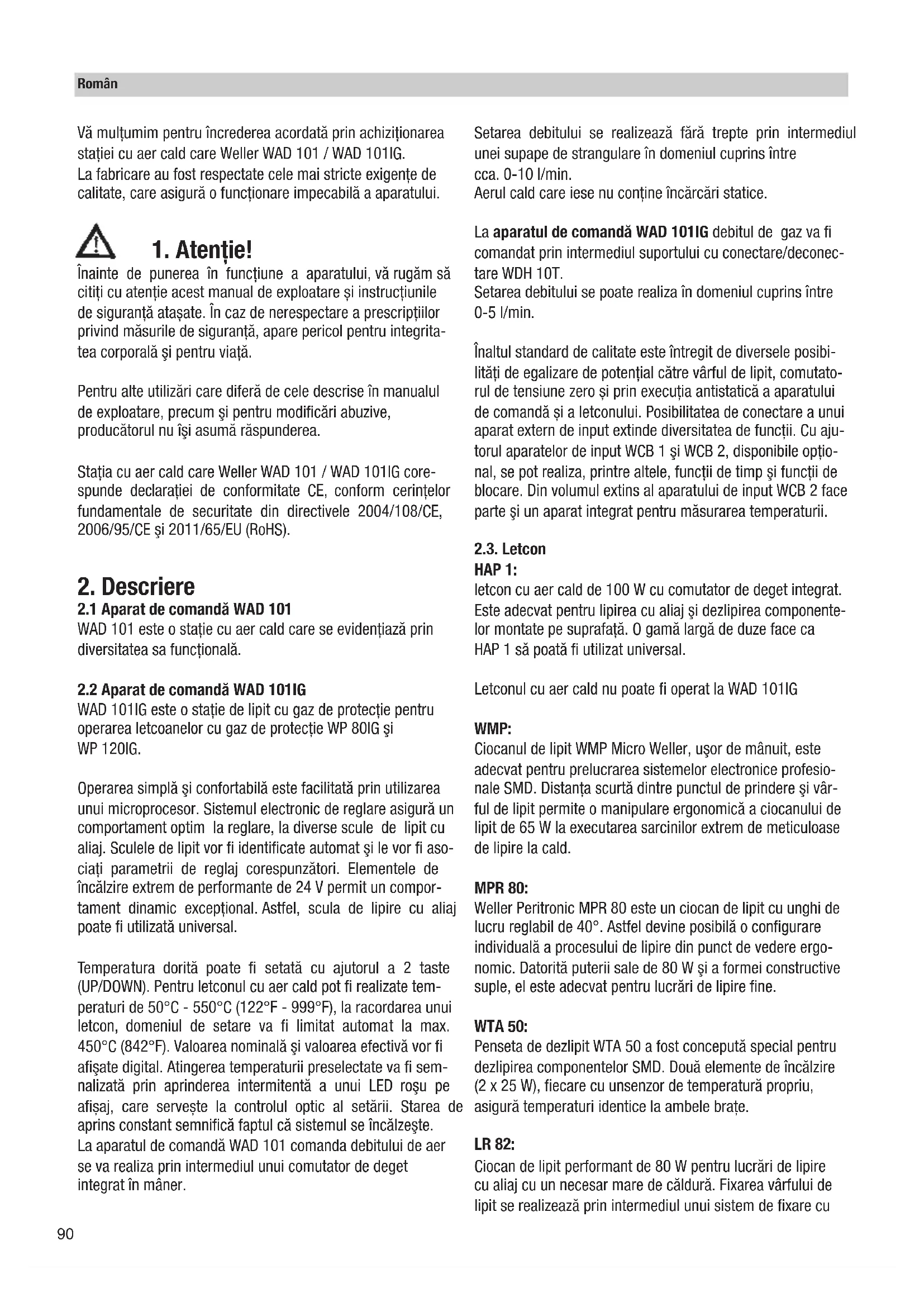 Înainte de punerea în funcțiune a aparatului, vă rugăm să citiți cu atenție acest manual de exploatare și instrucțiunile de siguranță atașate. În caz de nerespectare a prescripţiilor privind măsurile de siguranţă, apare pericol pentru integrita- tea corporală şi pentru viaţă. Pentru alte utilizări care diferă de cele descrise în manualul de exploatare, precum şi pentru modificări abuzive, producătorul nu îşi asumă răspunderea. Stația cu aer cald care Weller WAD 101 / WAD 101IG core- spunde declaraţiei de conformitate CE, conform cerinţelor fundamentale de securitate din directivele 2004/108/CE, 2006/95/CE şi 2011/65/EU (RoHS).