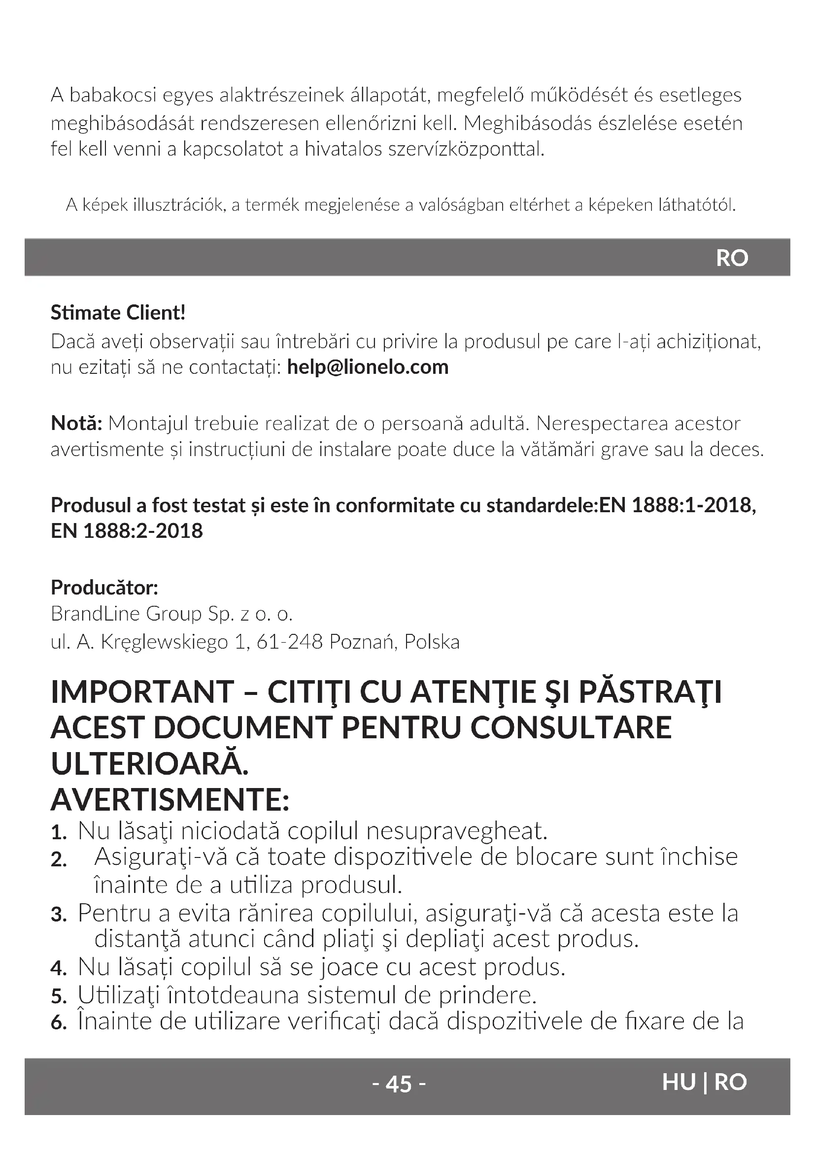 Smate Client! Dacă aveți observații sau întrebări cu privire la produsul pe care l-ați achiziționat, nu ezitați să ne contactați: help@lionelo.com Notă: Montajul trebuie realizat de o persoană adultă. Nerespectarea acestor aversmente și instrucțiuni de instalare poate duce la vătămări grave sau la deces. Produsul a fost testat și este în conformitate cu standardele:EN 1888:1-2018, EN 1888:2-2018 Producător: BrandLine Group Sp. z o. o. ul. A. Kręglewskiego 1, 61-248 Poznań, Polska IMPORTANT – CITIŢI CU ATENŢIE ŞI PĂSTRAŢI