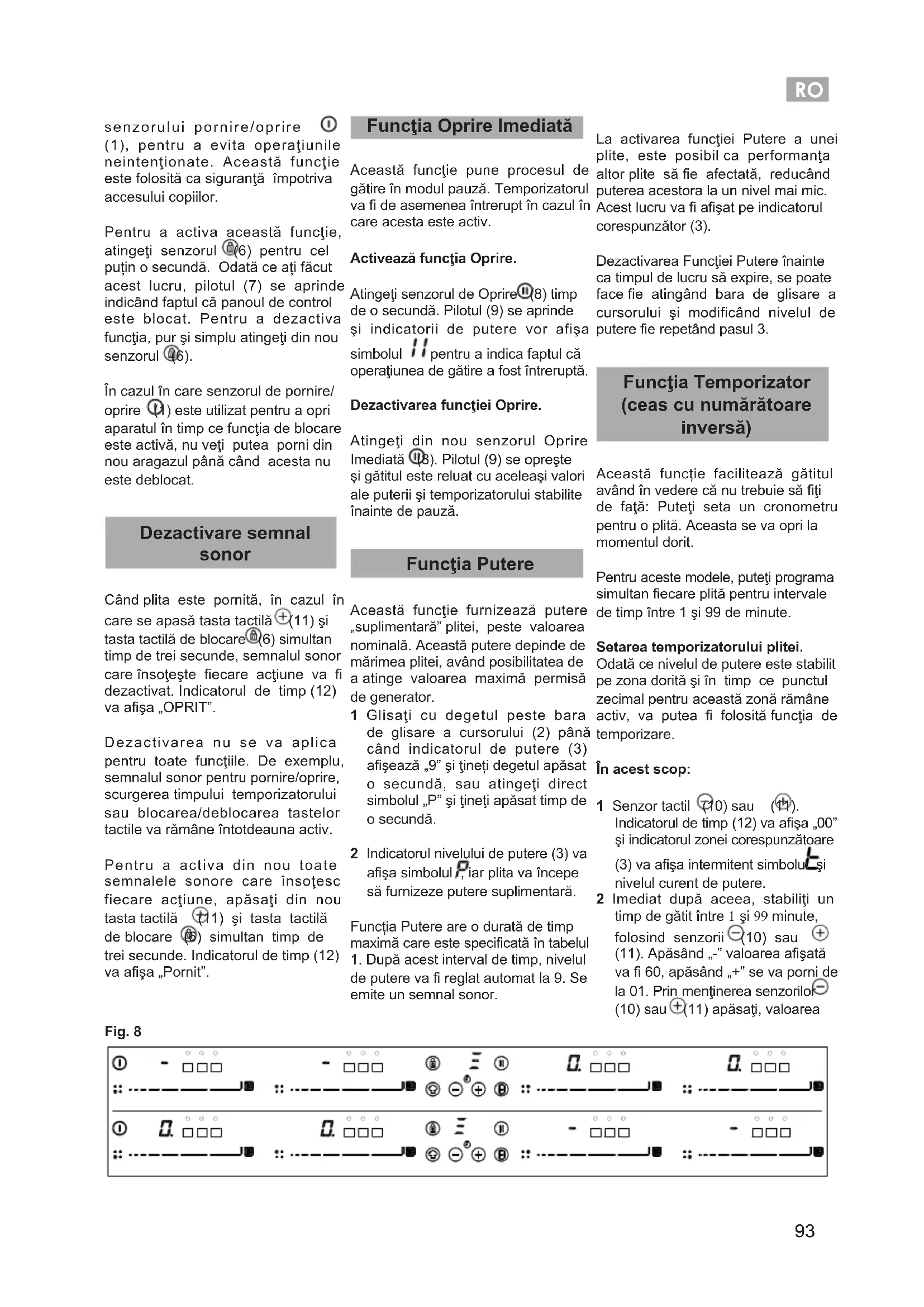 de putere va reglat automat la 9. Se emite un semnal sonor. La activarea funcţiei Putere a unei plite, este posibil ca performanţa altor plite să e afectată, reducând puterea acestora la un nivel mai mic. Acest lucru va aşat pe indicatorul corespunzător (3). Dezactivarea Funcţiei Putere înainte ca timpul de lucru să expire, se poate face e atingând bara de glisare a cursorului şi modificând nivelul de putere e repetând pasul 3. Funcţia Temporizator (ceas cu numărătoare inversă) Această funcție facilitează gătitul având în vedere că nu trebuie să ţi de faţă: Puteţi seta un cronometru pentru o plită. Aceasta se va opri la momentul dorit. Pentru aceste modele, puteţi programa simultan ecare plită pentru intervale de timp între 1 şi 99 de minute. Setarea temporizatorului plitei. Odată ce nivelul de putere este stabilit pe zona dorită şi în timp ce punctul zecimal pentru această zonă rămâne activ, va putea folosită funcţia de temporizare. În acest scop: 1 Senzor tactil (10) sau (11). Indicatorul de timp (12) va aşa „00” şi indicatorul zonei corespunzătoare (3) va aşa intermitent simbolul şi nivelul curent de putere. 2 Imediat după aceea, stabiliţi un timp de gătit între 1 şi 99 minute, folosind senzorii (10) sau (11). Apăsând „-” valoarea aşată va 60, apăsând „+” se va porni de la 01. Prin menţinerea senzorilor (10) sau (11) apăsaţi, valoarea Fig. 8RO