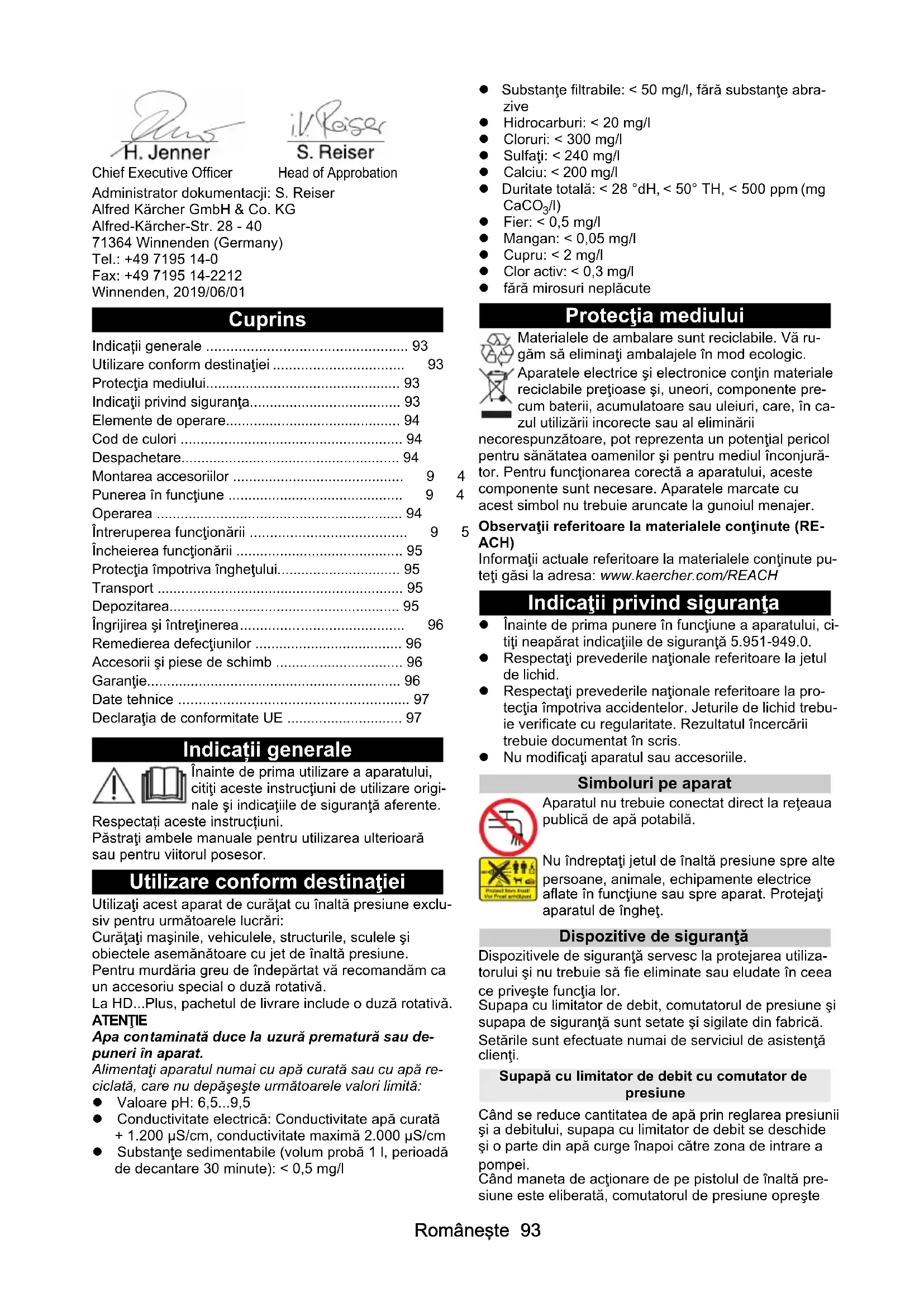 • /l) Fier: < 0,5 mg/l Mangan: < 0,05 mg/l Cupru: < 2 mg/l Clor activ: < 0,3 mg/l fără mirosuri neplăcute Protecţia mediului Materialele de ambalare sunt reciclabile. Vă ru- găm să eliminaţi ambalajele în mod ecologic. Aparatele electrice şi electronice conţin materiale reciclabile preţioase şi, uneori, componente pre- cum baterii, acumulatoare sau uleiuri, care, în ca- zul utilizării incorecte sau al eliminării necorespunzătoare, pot reprezenta un potenţial pericol pentru sănătatea oamenilor şi pentru mediul înconjură- tor. Pentru funcţionarea corectă a aparatului, aceste componente sunt necesare. Aparatele marcate cu acest simbol nu trebuie aruncate la gunoiul menajer. Observaţii referitoare la materialele conţinute (RE- ACH) Informaţii actuale referitoare la materialele conţinute pu- teţi găsi la adresa: www.kaercher.com/REACH Indicaţii privind siguranţa Înainte de prima punere în funcţiune a aparatului, ci- tiţi neapărat indicaţiile de siguranţă 5.951-949.0. Respectaţi prevederile naţionale referitoare la jetul de lichid. Respectaţi prevederile naţionale referitoare la pro- tecţia împotriva accidentelor. Jeturile de lichid trebu- ie verificate cu regularitate. Rezultatul încercării trebuie documentat în scris. Nu modificaţi aparatul sau accesoriile. Simboluri pe aparat Aparatul nu trebuie conectat direct la reţeaua publică de apă potabilă. Nu îndreptaţi jetul de înaltă presiune spre alte persoane, animale, echipamente electrice aflate în funcţiune sau spre aparat. Protejaţi aparatul de îngheţ. Dispozitive de siguranţă Dispozitivele de siguranţă servesc la protejarea utiliza- torului şi nu trebuie să fie eliminate sau eludate în ceea ce priveşte funcţia lor. Supapa cu limitator de debit, comutatorul de presiune şi supapa de siguranţă sunt setate şi sigilate din fabrică. Setările sunt efectuate numai de serviciul de asistenţă clienţi. Supapă cu limitator de debit cu comutator de presiune Când se reduce cantitatea de apă prin reglarea presiunii şi a debitului, supapa cu limitator de debit se deschide şi o parte din apă curge înapoi către zona de intrare a pompei. Când maneta de acţionare de pe pistolul de înaltă pre- siune este eliberată, comutatorul de presiune opreşte Indicații generale p. 93