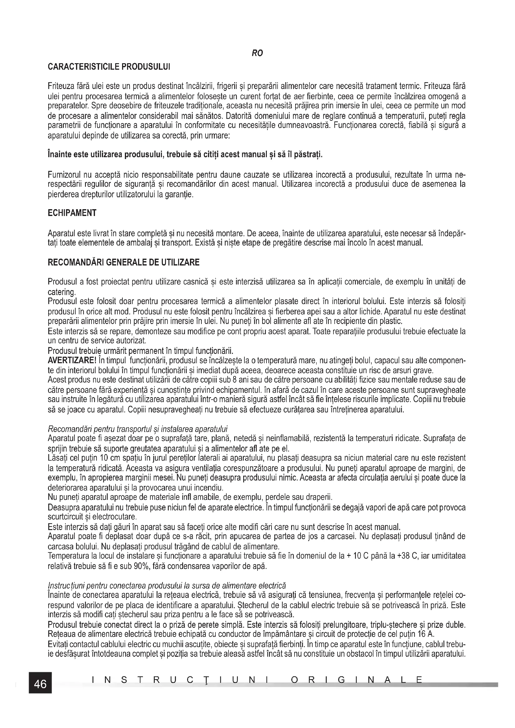 CARACTERISTICILE PRODUSULUI Friteuza fără ulei este un produs destinat încălzirii, frigerii și preparării alimentelor care necesită tratament termic. Friteuza fără ulei pentru procesarea termică a alimentelor folosește un curent forțat de aer fi erbinte, ceea ce permite încălzirea omogenă a preparatelor. Spre deosebire de friteuzele tradiționale, aceasta nu necesită prăjirea prin imersie în ulei, ceea ce permite un mod de procesare a alimentelor considerabil mai sănătos. Datorită domeniului mare de reglare continuă a temperaturii, puteți regla parametrii de funcționare a aparatului în conformitate cu necesitățile dumneavoastră. Funcționarea corectă, fi abilă și sigură a aparatului depinde de utilizarea sa corectă, prin urmare: Înainte este utilizarea produsului, trebuie să citiți acest manual și să îl păstrați. Furnizorul nu acceptă nicio responsabilitate pentru daune cauzate se utilizarea incorectă a produsului, rezultate în urma ne- respectării regulilor de siguranță și recomandărilor din acest manual. Utilizarea incorectă a produsului duce de asemenea la pierderea drepturilor utilizatorului la garanție. ECHIPAMENT Aparatul este livrat în stare completă și nu necesită montare. De aceea, înainte de utilizarea aparatului, este necesar să îndepăr- tați toate elementele de ambalaj și transport. Există și niște etape de pregătire descrise mai încolo în acest manual.