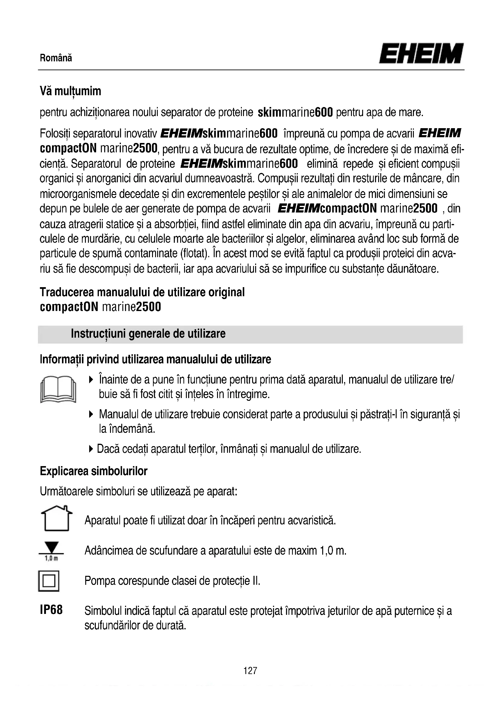 Dacă cedaţi aparatul terţilor, înmânaţi și manualul de utilizare. Explicarea simbolurilor Următoarele simboluri se utilizează pe aparat: Aparatul poate fi utilizat doar în încăperi pentru acvaristică. Adâncimea de scufundare a aparatului este de maxim 1,0 m. Pompa corespunde clasei de protecţie II. IP68 Simbolul indică faptul că aparatul este protejat împotriva jeturilor de apă puternice și a scufundărilor de durată.Produsul este aprobat în conformitate cu prescripţiile și normele naţionale respective și corespunde normelor UE. Următoarele simboluri și cuvinte cheie se utilizează în acest manual de utilizare. PERICOL! Simbolul indică un pericol iminent care poate avea ca urmări decesul sau accidente grave, dacă nu se iau măsurile corespunzătoare. PERICOL! Simbolul indică un pericol iminent care poate avea ca urmări decesul sau accidente grave, dacă nu se iau măsurile corespunzătoare. ATENŢIE! Simbolul indică un pericol iminent care poate avea ca urmări decesul sau accidente grave, dacă nu se iau măsurile corespunzătoare. PRECAUŢIE! Indicaţie cu privire la pagube materiale. Indicaţii cu informaţii utile și sfaturi. Tipuri de semne: