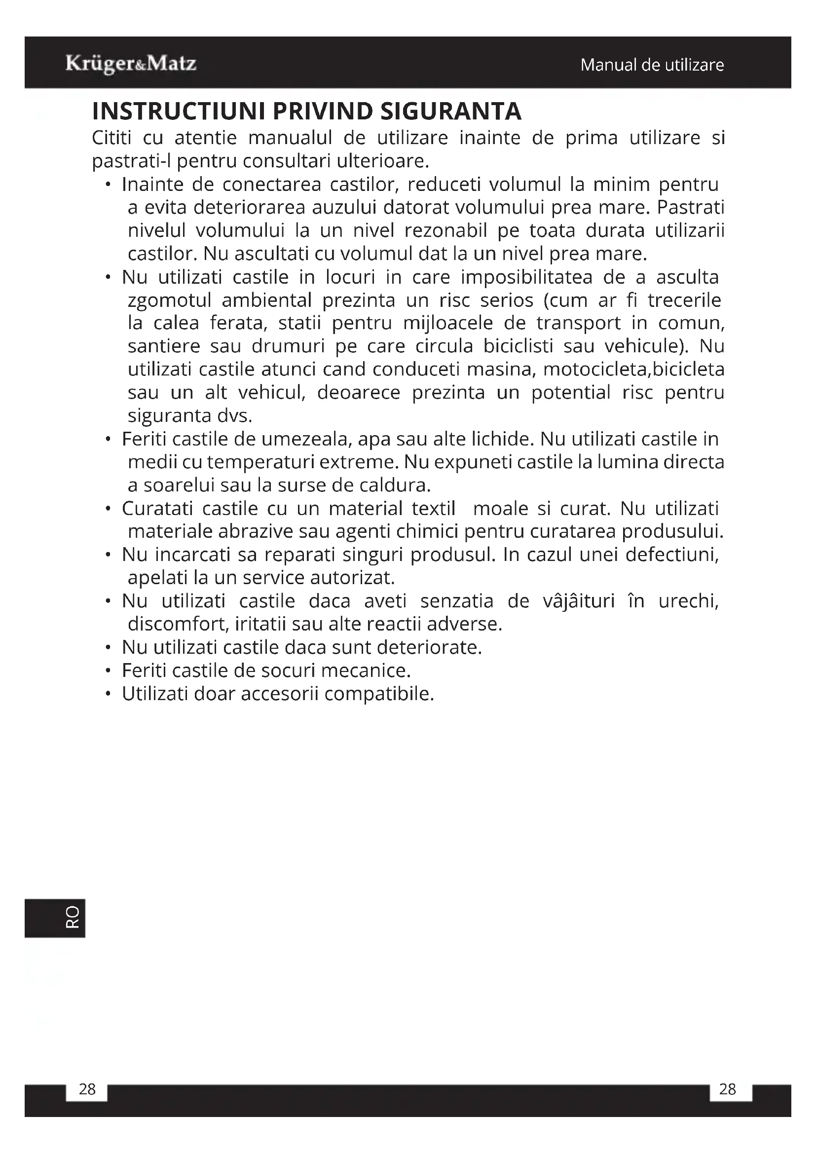 - Inainte de conectarea castilor, reduceti volumul la minim pentru a evita deteriorarea auzului datorat volumului prea mare. Pastrati nivelul volumului la un nivel rezonabil pe toata durata utilizarii castilor. Nu ascultati cu volumul dat la un nivel prea mare.