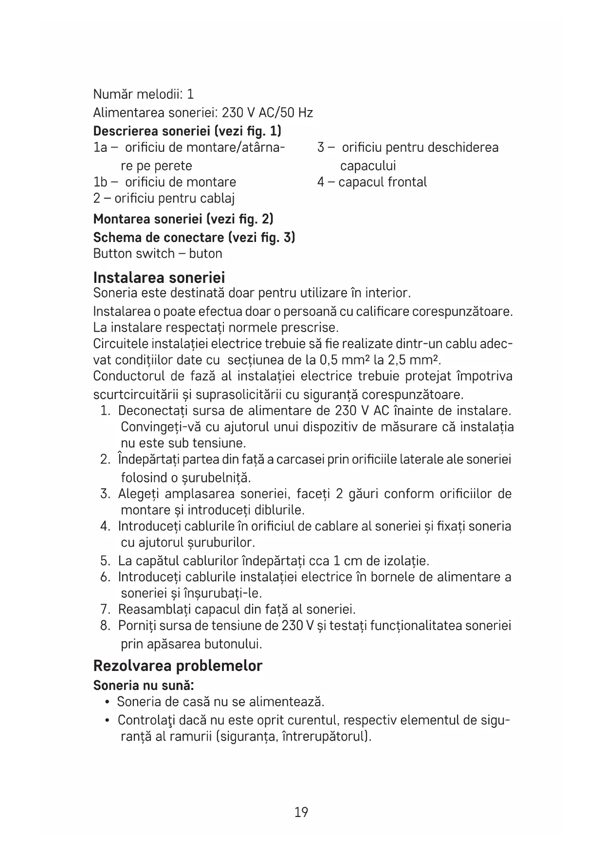 - Controlaţi dacă nu este oprit curentul, respectiv elementul de sigu- rană al ramurii (sigurana, întrerupătorul).20 Grija şi întreţinerea Soneria este un aparat electronic sensibil, respectaţi, de aceea, urmă- toarele măsuri: