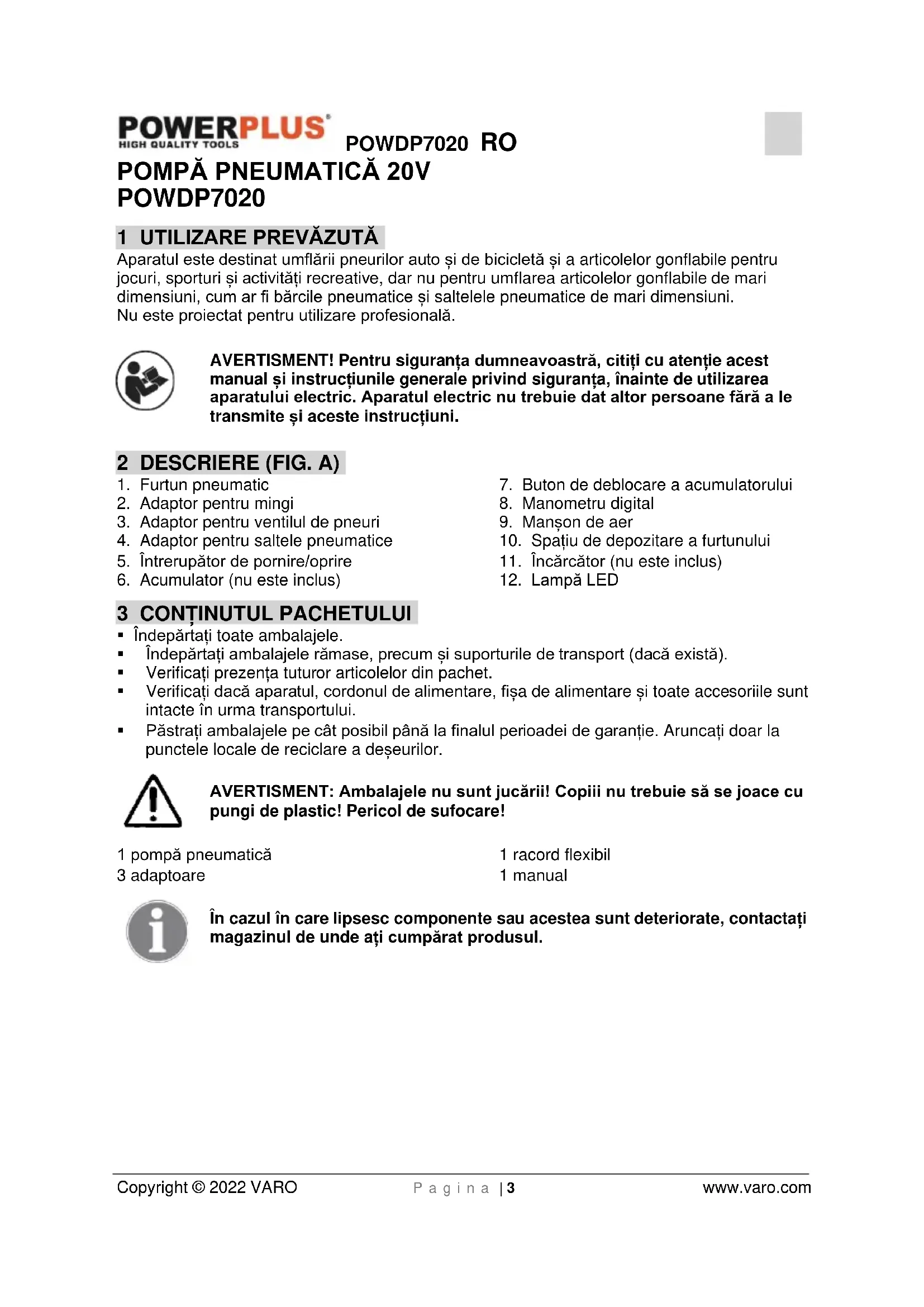 - Nu păstrați în pungi de plastic pentru a evita acumularea umezelii.POWDP7020 RO Copyright © 2022 VARO P a g i n a | 11 www.varo.com 13 GARANȚIE