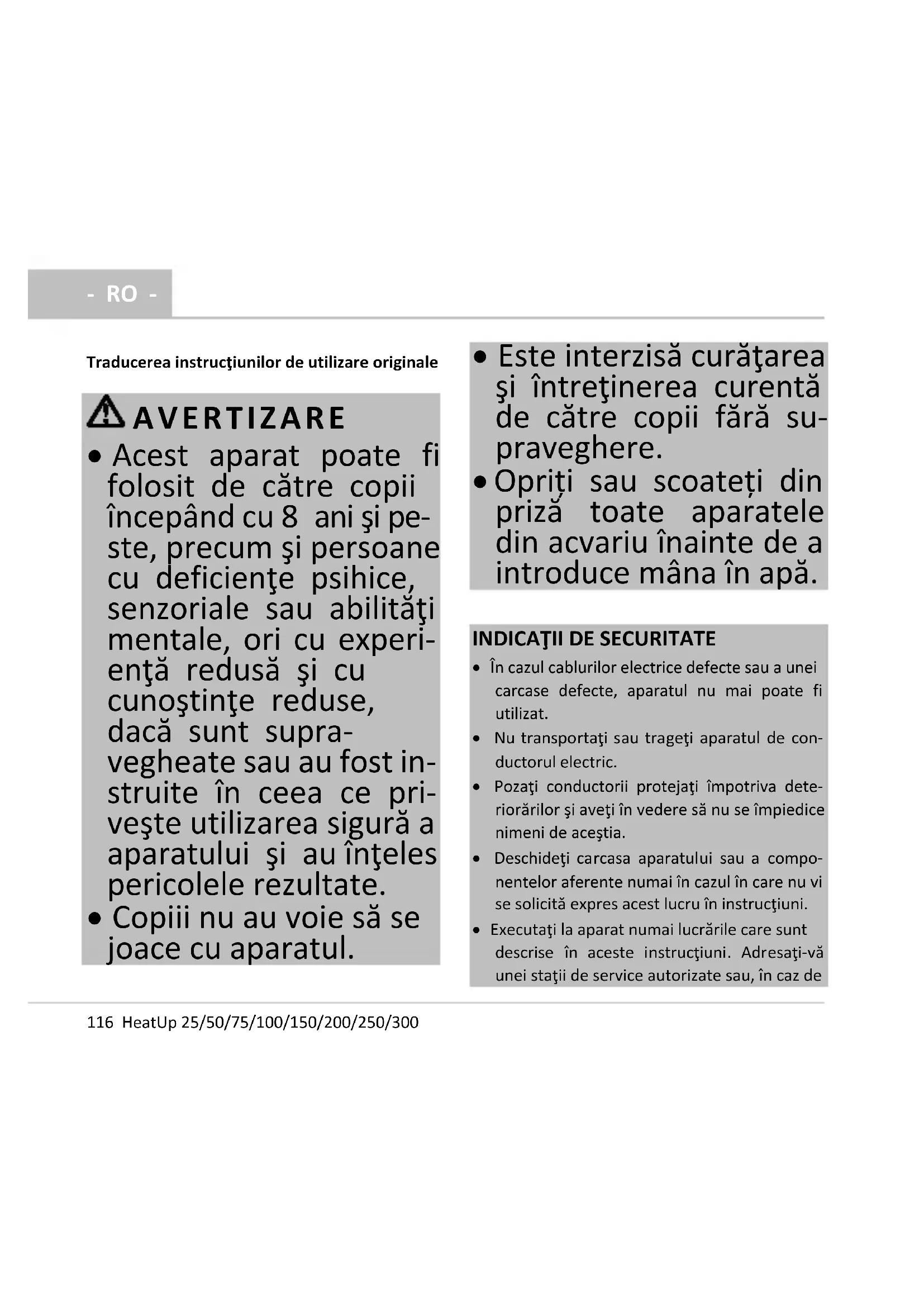 - Este interzisă curăţarea şi întreţinerea curentă de către copii fără su- praveghere.