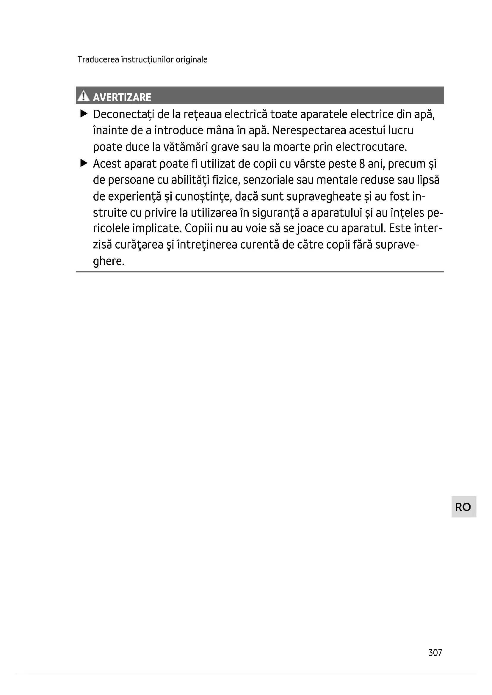 AVERTI ZARE AVERTIZARE Deconectați de la rețeaua electrică toate aparatele electrice din apă, înainte de a introduce mâna în apă. Nerespectarea acestui lucru poate duce la vătămări grave sau la moarte prin electrocutare. Acest aparat poate fi utilizat de copii cu vârste peste 8 ani, precum și de persoane cu abilități fizice, senzoriale sau mentale reduse sau lipsă de experiență și cunoștințe, dacă sunt supravegheate și au fost in- struite cu privire la utilizarea în siguranță a aparatului și au înțeles pe- ricolele implicate. Copiii nu au voie să se joace cu aparatul. Este inter- zisă curăţarea şi întreţinerea curentă de către copii fără suprave- ghere.308 Indicații de securitate Conexiunea electrică