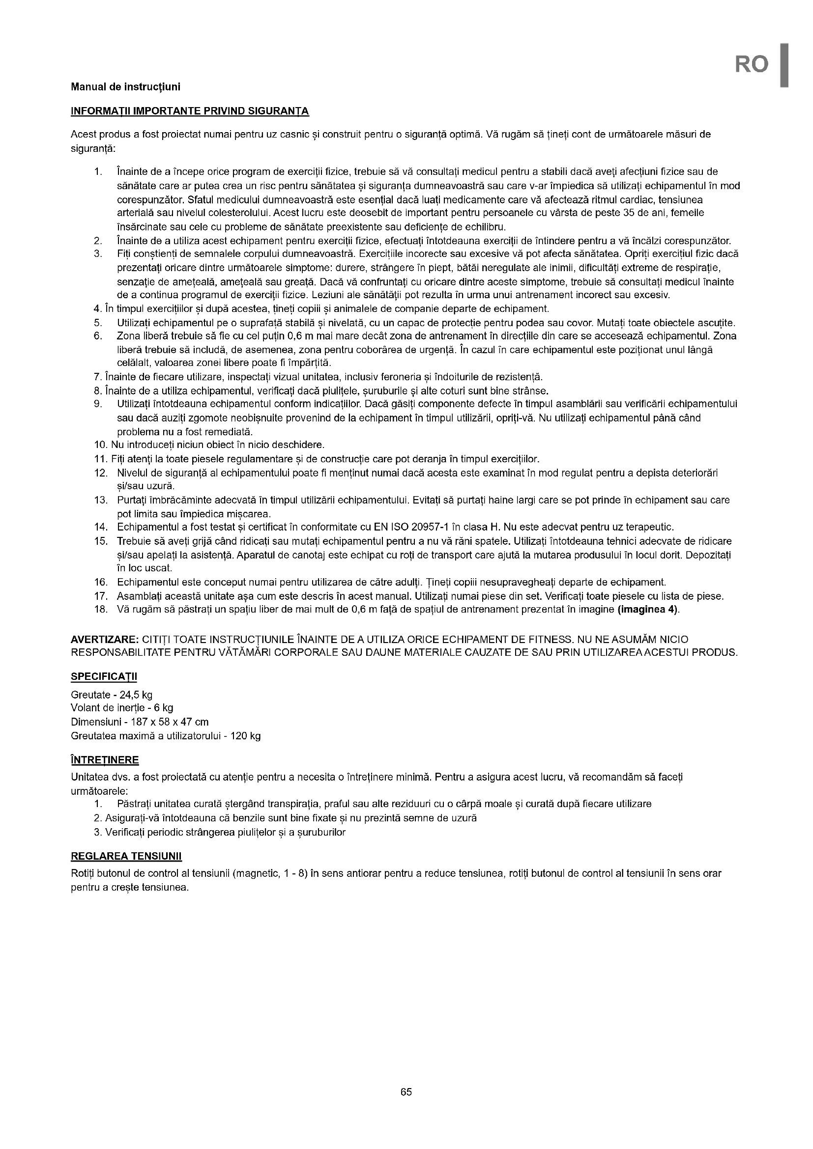 - Inainte de a utiliza acest echipament pentru exerciti fizice, efectuati intotdeauna exerciti de intindere pentru a va incalzi corespunzator.