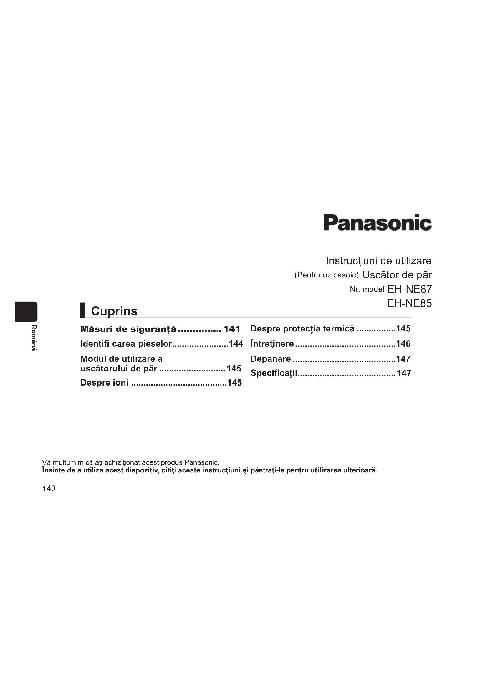 - Consum de putere 1 900 W 2 100 W 2 300 W Accesoriu EH-NE87 Duza de supraalimentare cu aer, Duza de concentrare, Difuzor EH-NE85 Duza de supraalimentare cu aer, Duza de concentrare Zgomot acustic pe calea aerului 83 (dB(A) re 1 pW) Acest produs este destinat numai pentru uz casnic.148 Română Eliminarea echipamentelor Numai pentru Uniunea Europeană şi ţările cu sisteme de reciclare Acest simbol de pe produse, ambalaje şi/ sau documentele însoţitoare indică faptul că produsele electrice şi electronice nu trebuie să fi e amestecate cu deşeurile menajere obişnuite. Pentru un tratament corespunzător, pentru recuperarea şi reciclarea produselor vechi, vă rugăm să le depuneţi la punctele de colectare special amenajate, în conformitate cu legislaţia naţională. Prin depunerea corespunzătoare a acestora la deşeuri, veţi ajuta la economisirea unor resurse valoroase şi veţi preveni potenţiale efecte negative asupra sănătăţii umane şi asupra mediului înconjurător. Pentru mai multe informaţii despre colectare şi reciclare, vă rugăm să contactaţi autorităţile locale. Este posibil ca depunerea incorectă la deşeuri să fi e pedepsită în conformitate cu legile naţionale. Reprezentant autorizat în UE: Panasonic Marketing Europe GmbH Panasonic Testing Centre Winsbergring 15, 22525 Hamburg, Germania Importator: Panasonic Marketing Europe GmbH Hagenauer Strasse 43, 65203 Wiesbaden, Germania Fabricat de: Panasonic Corporation 1006, Oaza Kadoma, Kadoma City, Osaka, Japonia149 Türkçe Kullanım Kılavuzu (Ev tipi kullanım) Saç Kurutma Makinesi Model No. EH-NE87 EH-NE85 Bu Panasonic ürününü satın aldığınız için teşekkür ederiz. Bu cihazı çalıştırmadan önce, lütfen bu kılavuzu tamamen okuyun ve ileride kullanmak üzere saklayın. Emniyet önlemleri p. 150