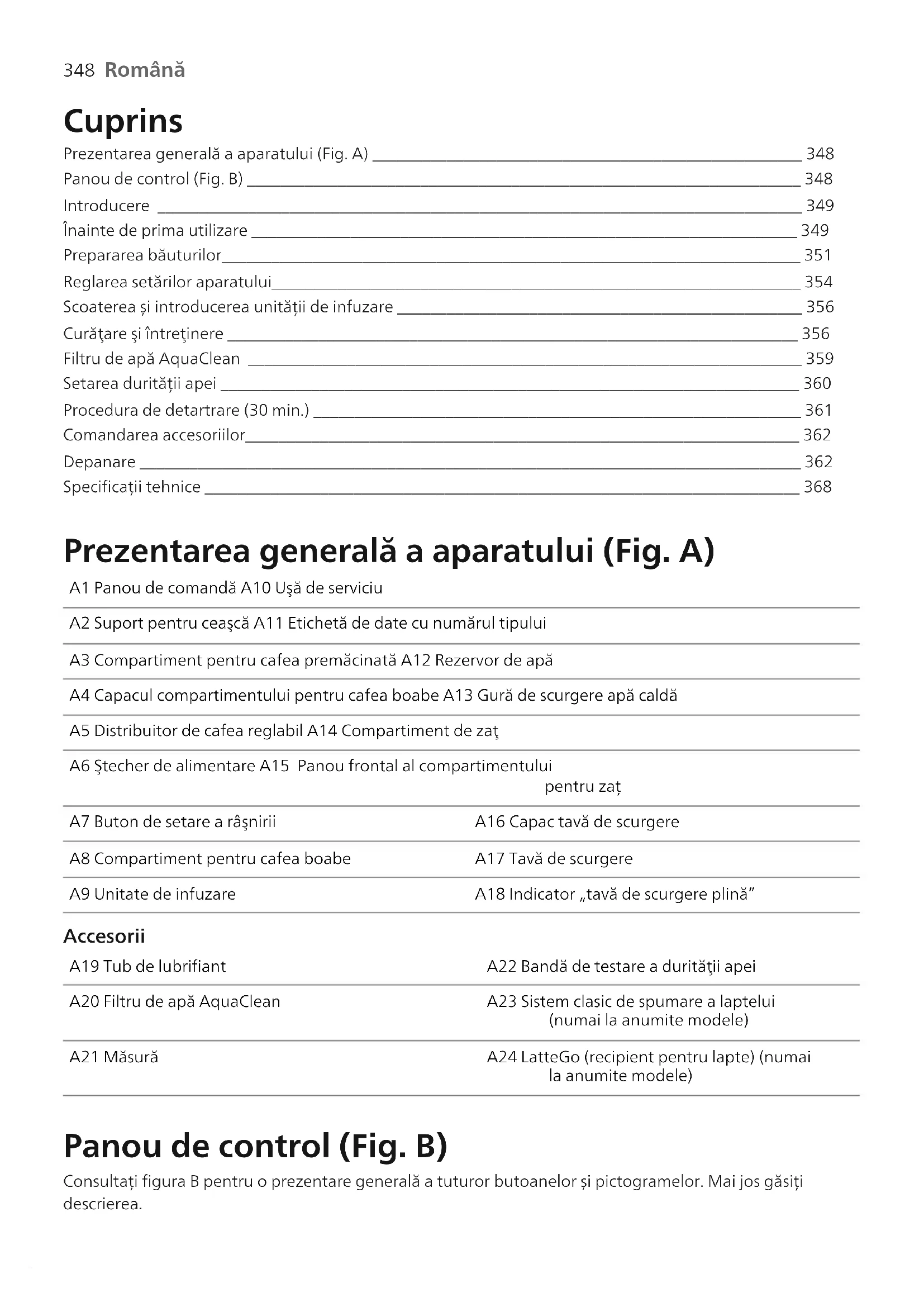 Română Cuprins Prezentarea generală a aparatului (Fig. A) ____________________________________________________ 348 Panou de control (Fig. B) ___________________________________________________________________ 348 Introducere ______________________________________________________________________________ 349 Înainte de prima utilizare __________________________________________________________________ 349 Prepararea băuturilor______________________________________________________________________ 351 Reglarea setărilor aparatului________________________________________________________________ 354 Scoaterea și introducerea unității de infuzare _________________________________________________ 356 Curăţare şi întreţinere _____________________________________________________________________ 356 Filtru de apă AquaClean ___________________________________________________________________ 359 Setarea durității apei ______________________________________________________________________ 360 Procedura de detartrare (30 min.) ___________________________________________________________ 361 Comandarea accesoriilor___________________________________________________________________ 362 Depanare ________________________________________________________________________________ 362 Specificații tehnice ________________________________________________________________________ 368 Prezentarea generală a aparatului (Fig. A) A1 Panou de comandă A10 Uşă de serviciu A2 Suport pentru ceaşcă A11 Etichetă de date cu numărul tipului A3 Compartiment pentru cafea premăcinată A12 Rezervor de apă A4 Capacul compartimentului pentru cafea boabe A13 Gură de scurgere apă caldă A5 Distribuitor de cafea reglabil A14 Compartiment de zaţ A6 Ştecher de alimentare A15 Panou frontal al compartimentului pentru zaț A7 Buton de setare a râşnirii A16 Capac tavă de scurgere A8 Compartiment pentru cafea boabe A17 Tavă de scurgere A9 Unitate de infuzare A18 Indicator „tavă de scurgere plină” Accesorii A19 Tub de lubrifiant A22 Bandă de testare a durităţii apei A20 Filtru de apă AquaClean A23 Sistem clasic de spumare a laptelui (numai la anumite modele) A21 Măsură A24 LatteGo (recipient pentru lapte) (numai la anumite modele) Panou de control (Fig. B) Consultați figura B pentru o prezentare generală a tuturor butoanelor și pictogramelor. Mai jos găsiți descrierea.349 Română Română Unele dintre butoane/pictograme sunt doar pentru tipuri specifice. B1 Buton de pornire/oprire B7 Pictograme avertismente B2 Pictograme băutură* B8 Led de pornire B3 Pictogramă intensitate aromă/cafea pre-măcinată B9 Buton Start/stop B4 Pictogramă cantitate băutură B10 Pictogramă Calc / Clean B5 Pictogramă cantitate lapte (numai la anumite modele) B11 Pictogramă AquaClean B6 Pictogramă temperatură cafea (numai la anumite modele)