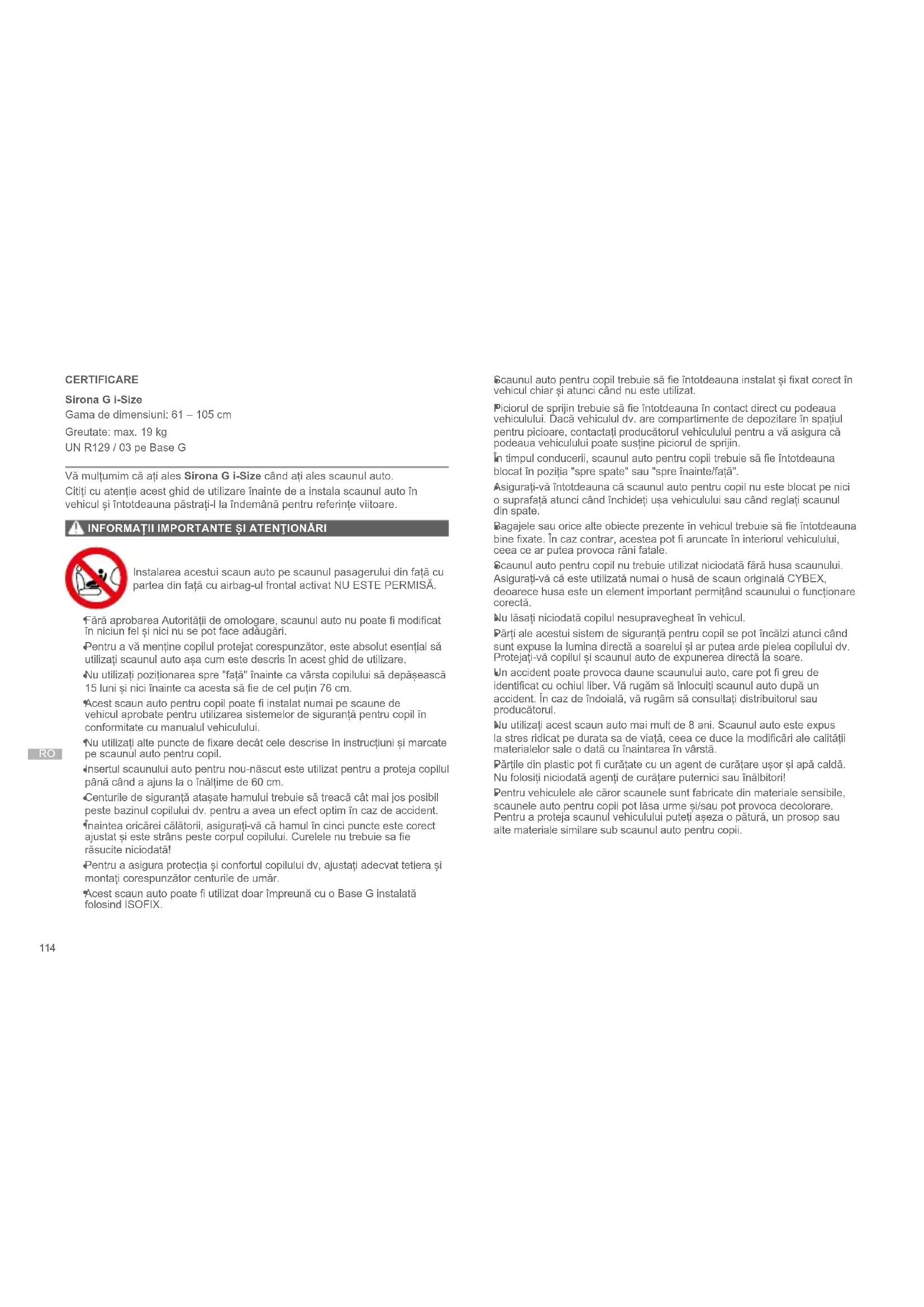 CERTIFICARE Sirona G i-Size Gama de dimensiuni: 61 – 105 cm Greutate: max. 19 kg UN R129 / 03 pe Base G Vă mulțumim că ați ales Sirona G i-Size când ați ales scaunul auto. Citiți cu atenție acest ghid de utilizare înainte de a instala scaunul auto în vehicul și întotdeauna păstrați-l la îndemână pentru referințe viitoare. INFORMAȚII IMPORTANTE ȘI ATENŢIONĂRI Instalarea acestui scaun auto pe scaunul pasagerului din față cu partea din față cu airbag-ul frontal activat NU ESTE PERMISĂ.