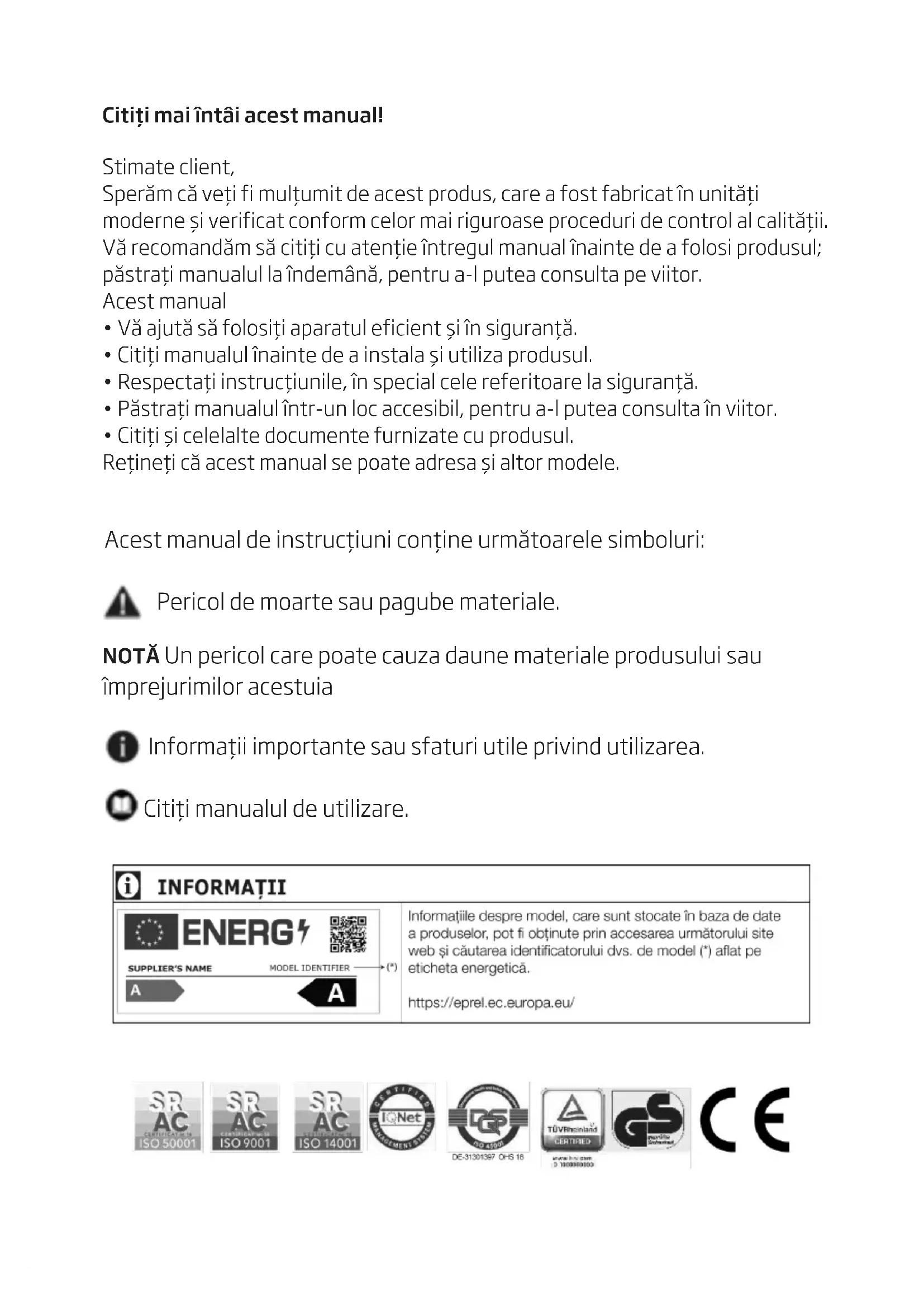 Citiţi mai întâi acest manual! Stimate client, Sperăm că veţi fi mulţumit de acest produs, care a fost fabricat în unităţi moderne şi verificat conform celor mai riguroase proceduri de control al calităţii. Vă recomandăm să citiţi cu atenţie întregul manual înainte de a folosi produsul; păstraţi manualul la îndemână, pentru a-l putea consulta pe viitor. Acest manual