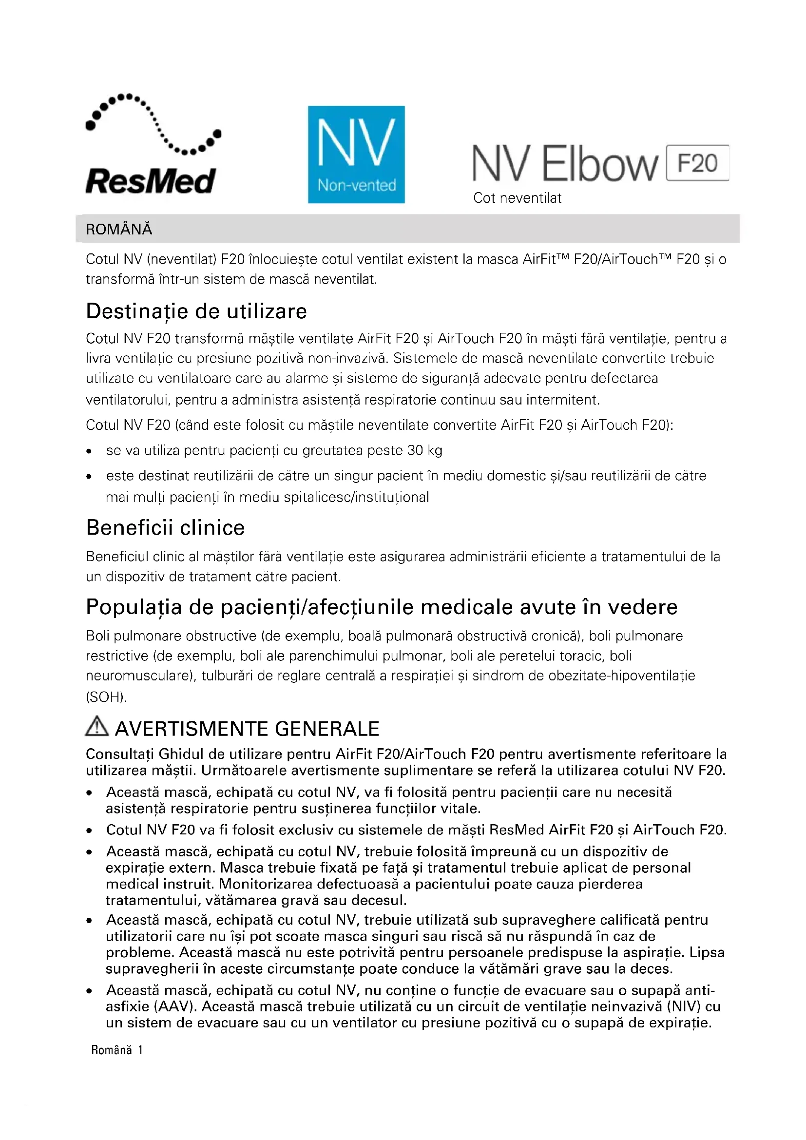 - este destinat reutilizării de către un singur pacient în mediu domestic și/sau reutilizării de către mai mulți pacienți în mediu spitalicesc/instituțional Beneficii clinice Beneficiul clinic al măștilor fără ventilație este asigurarea administrării eficiente a tratamentului de la un dispozitiv de tratament către pacient. Populația de pacienți/afecțiunile medicale avute în vedere Boli pulmonare obstructive (de exemplu, boală pulmonară obstructivă cronică), boli pulmonare restrictive (de exemplu, boli ale parenchimului pulmonar, boli ale peretelui toracic, boli neuromusculare), tulburări de reglare centrală a respirației și sindrom de obezitate-hipoventilație (SOH). AVERTISMENTE GENERALE Consultați Ghidul de utilizare pentru AirFit F20/AirTouch F20 pentru avertismente referitoare la utilizarea măștii. Următoarele avertismente suplimentare se referă la utilizarea cotului NV F20.