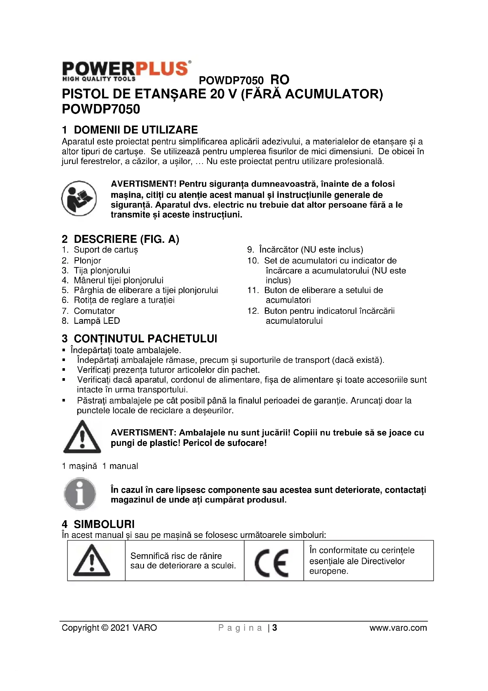 VARO – Vic. Van Rompuy N.V. - Joseph Van Instraat 9 - BE2500 Lier - BELGIA, declară că produsul: Pistol de etanșare 20 V marcă înregistrată: POWERplus model: POWDP7050 este în conformitate cu specificațiile esențiale și alte prevederi relevante ale Directivelor Europene aplicabile, pe baza aplicării standardelor europene armonizate. Orice modificare neautorizată a aparatelor atrage după sine anularea acestei declarații. Directivele europene (inclusiv, dacă este cazul, amendamentele lor, până la data semnăturii): 2011/65/EU 2006/42/EC 2014/30/EU Standardele europene armonizate (inclusiv, dacă este cazul, amendamentele lor, până la data semnăturii): EN62841-1 : 2015 EN ISO 12100 : 2010 EN55014-1 : 2017 EN55014-2 : 2015 Persoana care păstrează documentația tehnică : Philippe Vankerkhove, VARO – Vic. Van Rompuy N.V. Subsemnatul acționează în numele Directorului general executiv al societății, Ludo Mertens Divizia de reglementare – Director de conformitate 08/10/2020, Lier - BelgiumPOWDP7050 PL Copyright © 2021 VARO Strona | 1 www.varo.com 1 ZASTOSOWANIE ........................................................................... 3