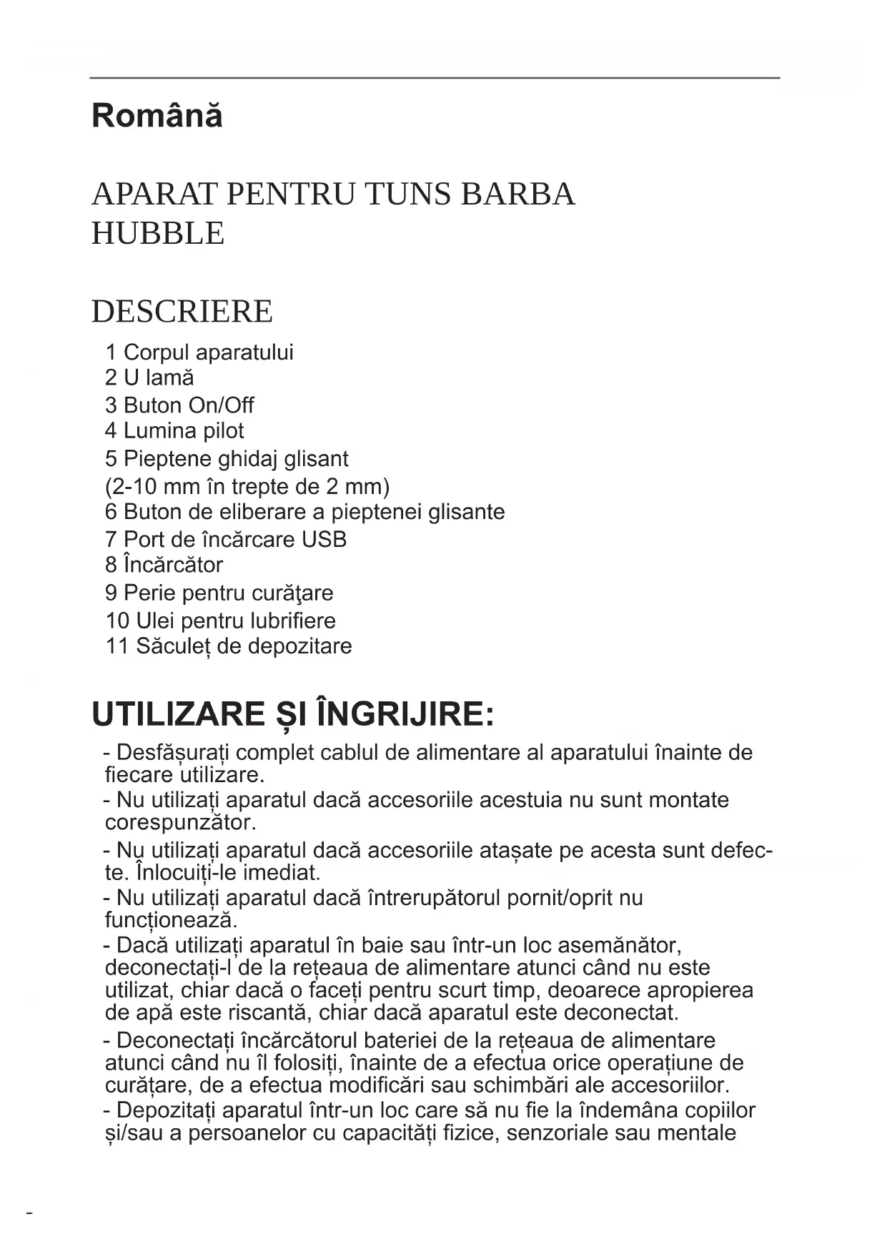 HUBBLE DESCRIERE 1 Corpul aparatului 2 U lamă 3 Buton On/Off 4 Lumina pilot 5 Pieptene ghidaj glisant (2-10 mm în trepte de 2 mm) 6 Buton de eliberare a pieptenei glisante 7 Port de încărcare USB 8 Încărcător 9 Perie pentru curăţare 10 Ulei pentru lubriere 11 Săculeț de depozitare UTILIZARE ȘI ÎNGRIJIRE: - Desfășurați complet cablul de alimentare al aparatului înainte de ecare utilizare. - Nu utilizați aparatul dacă accesoriile acestuia nu sunt montate corespunzător. - Nu utilizați aparatul dacă accesoriile atașate pe acesta sunt defec- te. Înlocuiți-le imediat. - Nu utilizați aparatul dacă întrerupătorul pornit/oprit nu funcționează. - Dacă utilizați aparatul în baie sau într-un loc asemănător, deconectați-l de la rețeaua de alimentare atunci când nu este utilizat, chiar dacă o faceți pentru scurt timp, deoarece apropierea de apă este riscantă, chiar dacă aparatul este deconectat. - Deconectați încărcătorul bateriei de la rețeaua de alimentare atunci când nu îl folosiți, înainte de a efectua orice operațiune de curățare, de a efectua modicări sau schimbări ale accesoriilor. - Depozitați aparatul într-un loc care să nu e la îndemâna copiilor și/sau a persoanelor cu capacități zice, senzoriale sau mentalereduse, ori care nu au experiență sau cunoștințele necesare. - Nu lăsați niciodată aparatul pe o suprafață în timp ce funcționează. - Păstrați aparatul în stare bună. Vericați piesele mobile pentru a vedea dacă sunt nealiniate sau blocate și asigurați-vă că nu există piese rupte sau anomalii care pot afecta funcționarea corectă a aparatului. - Acordați atenție deosebită în timpul montării și demontării acce- soriilor, pentru că lamele sunt ascuțite. Aveți grijă și evitați contac- tul direct cu muchiile tăioase ale lamei. - Nu lăsați niciodată aparatul conectat și nesupravegheat dacă nu este utilizat. Astfel se economisește energie și se prelungește durata de viață a aparatului. - Nu utilizați aparatul pe animale de companie sau animale. - Nu deschideți bateria/bateriile, indiferent de circumstanță. - Reîncărcați bateria numai cu cablul de alimentare USB furnizat de producător, orice alt tip de cablu poate cauza pericol de explozie sau incendiu. Nu utilizați adaptoare USB. - Utilizați aparatul numai cu bateria/bateriile pentru care a fost proiectat. Utilizarea altei/altor baterii poate cauza o explozie sau pericol de incendiu. ÎNCĂRCAREA BATERIEI: - Atenție: o baterie nouă nu este încărcată complet, de aceea tre- buie pusă la încărcat înainte ca aparatul să e utilizat pentru prima dată. - Încărcați bateria la o temperatură atmosferică între 4 și 40 ºC. - Cuplați încărcătoru (7) la conectorul jack utilizând mufa de pe aparat. Priza este localizată în partea inferioară a aparatului. - Introduceţi încărcătorul (8) în priză. - Indicatorul luminos (4) vaclipi pentru a indica faptul că încărcătorul încarcă bateria. - Aproximativ 100 de minute sunt necesare pentru o încărcare completă a bateriei. - Lumina pilot (4) se aprinde permanent albastru când bateria este complet încărcată. - După ce bateria s-a încărcat, deconectați încărcătorul de la rețea. - lumina pilot (4) clipește când bateria este aproape descărcată. Odată ce începe să clipească, conectați aparatul la priză.INSTRUCȚIUNI DE UTILIZARE ÎNAINTE DE UTILIZARE: - Asigurați-vă că ați înlăturat toate ambalajele produsului. - Înainte de a utiliza acest produs pentru prima dată, este important să efectuați o încărcare completă a bateriilor. INTRODUCEREA UNUI GHIDAJ PENTRU PIEPTENE: - Țineți pieptenele de ghidare de cele două părți, introduceți capul în ghidaje (Fig. 1), și și apăsând butonul de deblocare a piepte- nelui (Fig. 2), glisați în jos până când este cuplat.. - Utilizaţi selectorul de mărime a pieptenelui pentru a ajusta înălţimea tăierii. - Pentru a îndepărta pieptenele de ghidare (5), apăsați și mențineți apăsat butonul de deblocare a pieptenelui (6) și trageți în sus. LAMA ÎN FORMĂ DE U (2) - Potrivită pentru tunderea bărbii, mustății și perciunilor. - Poate utilizată împreună cu sau fără pieptenele de ghidare, în funcție de înălțimea de tăiere dorită. UTILIZARE: - Aparatul poate utilizat prin conectarea directă la rețea sau prin utilizarea bateriilor sale. - Dacă doriți să utilizați dispozitivul conectat la rețea, extindeți com- plet cablul înainte de al conecta. - Conectați aparatul la rețeaua electrică. - Selectați înălțimea de tăiere dorită cu ajutorul selectorului de înălțime al pieptenelui. Apăsați-l și ajustați înălțimea conform lungimii de tăiere dorite. PIEPTENE PENTRU A TUNDE BARBA: - Utilizați pieptenele de ghidare (5) în funcție de lungimea de tăiere dorită. - Tăiaţi părul prin deplasarea aparatului în direcţie opusă creşterii naturale a acestuia. - Asiguraţi-vă întotdeauna că dinţii ghidajului pentru pieptene sunt orientaţi în direcţia de deplasare a aparatului. - Evitați înfundarea pieptenei cu păr. Îndepărtați-l și curățați-l din când în când. DUPĂ CE AȚI TERMINAT CU UTILIZAREA APARATULUI: - Opriți aparatul de la butonul pornit/oprit. - Deconectați aparatul de la rețeaua de alimentare.- Curățați aparatul. - Pentru a menține aparatul de tuns la o funcționare corectă, ungeți-l cu ulei ușor pentru mașină după ecare utilizare. CURĂȚAREA: - Decuplați încărcătorul bateriei de la priză și lăsați-l să se răcească înaintea oricărei operații de curățare. - AVERTISMENT: Separați piesa portabilă de cablul de alimentare înainte de a o curăța în apă. - Dezasamblați aparatul parcurgând etapele următoare: - Scoateți pieptenele de ghidare (5) utilizând butonul de deblocare a pieptenelui (6). - Țineți aparatul cu o mână și utilizați degetul mare pentru a apăsa lamele,