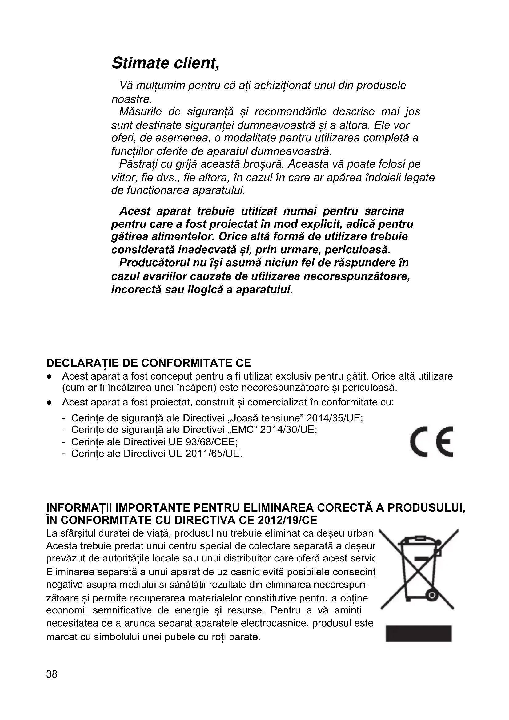 Stimate client, Vă mulțumim pentru că ați achiziționat unul din produsele noastre. Măsurile de siguranță și recomandările descrise mai jos sunt destinate siguranței dumneavoastră și a altora. Ele vor oferi, de asemenea, o modalitate pentru utilizarea completă a funcțiilor oferite de aparatul dumneavoastră. Păstrați cu grijă această broșură. Aceasta vă poate folosi pe viitor, fie dvs., fie altora, în cazul în care ar apărea îndoieli legate de funcționarea aparatului. Acest aparat trebuie utilizat numai pentru sarcina pentru care a fost proiectat în mod explicit, adică pentru gătirea alimentelor. Orice altă formă de utilizare trebuie considerată inadecvată și, prin urmare, periculoasă. Producătorul nu își asumă niciun fel de răspundere în cazul avariilor cauzate de utilizarea necorespunzătoare, incorectă sau ilogică a aparatului.