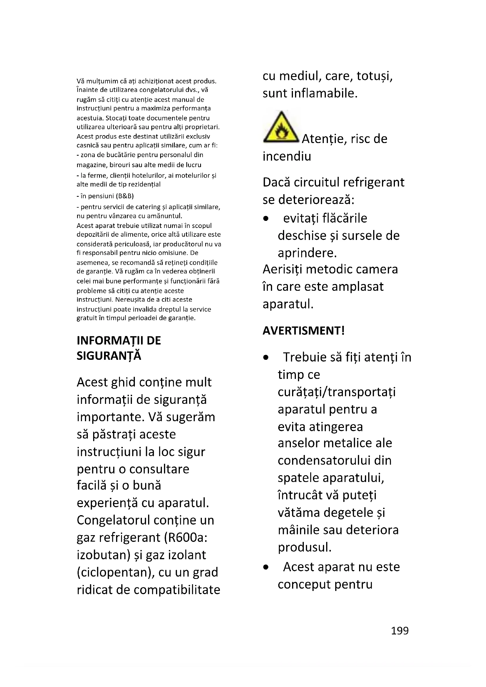 SIGURANȚĂ Acest ghid conține mult informații de siguranță importante. Vă sugerăm să păstrați aceste instrucțiuni la loc sigur pentru o consultare facilă și o bună experiență cu aparatul. Congelatorul conține un gaz refrigerant (R600a: izobutan) și gaz izolant (ciclopentan), cu un grad ridicat de compatibilitate cu mediul, care, totuși, sunt inflamabile. Atenție, risc de incendiu Dacă circuitul refrigerant se deteriorează: