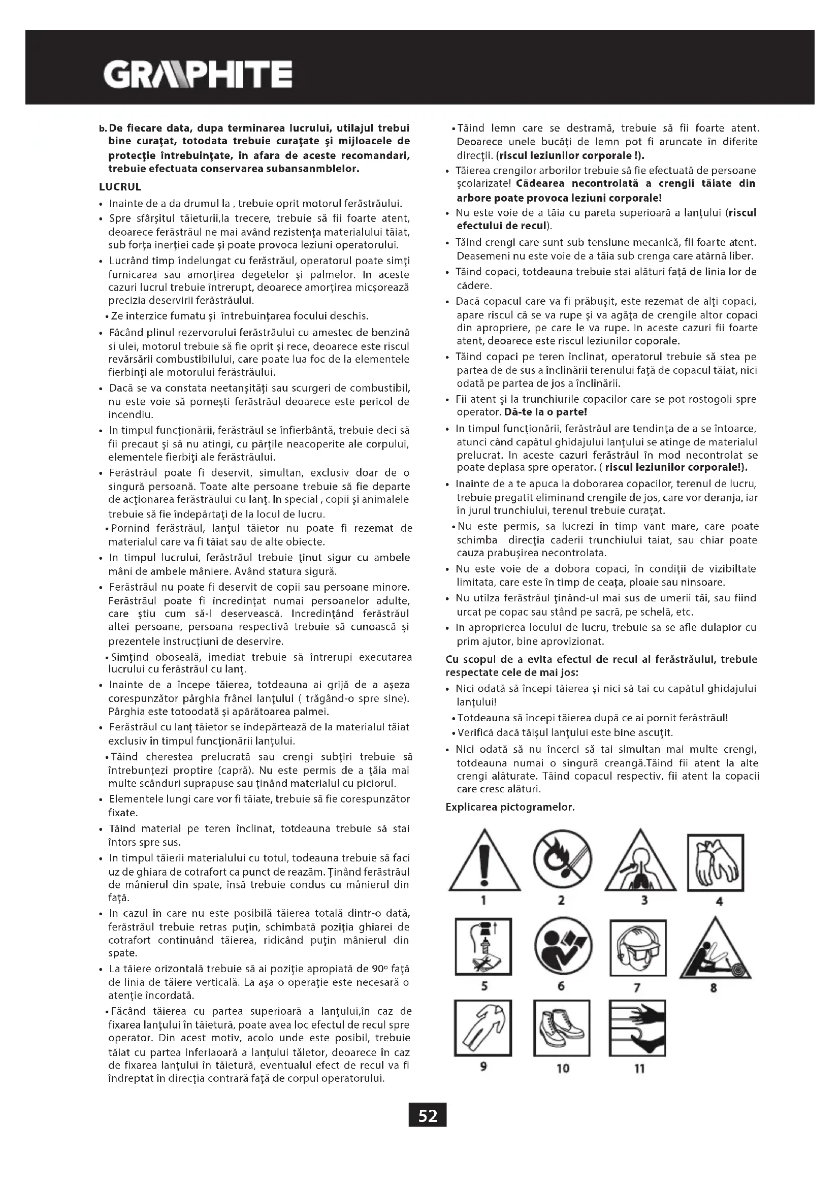 - Nici odată să nu încerci să tai simultan mai multe crengi, totdeauna numai o singură creangă.Tăind fii atent la alte crengi alăturate. Tăind copacul respectiv, fii atent la copacii care cresc alături. Explicarea pictogramelor.53