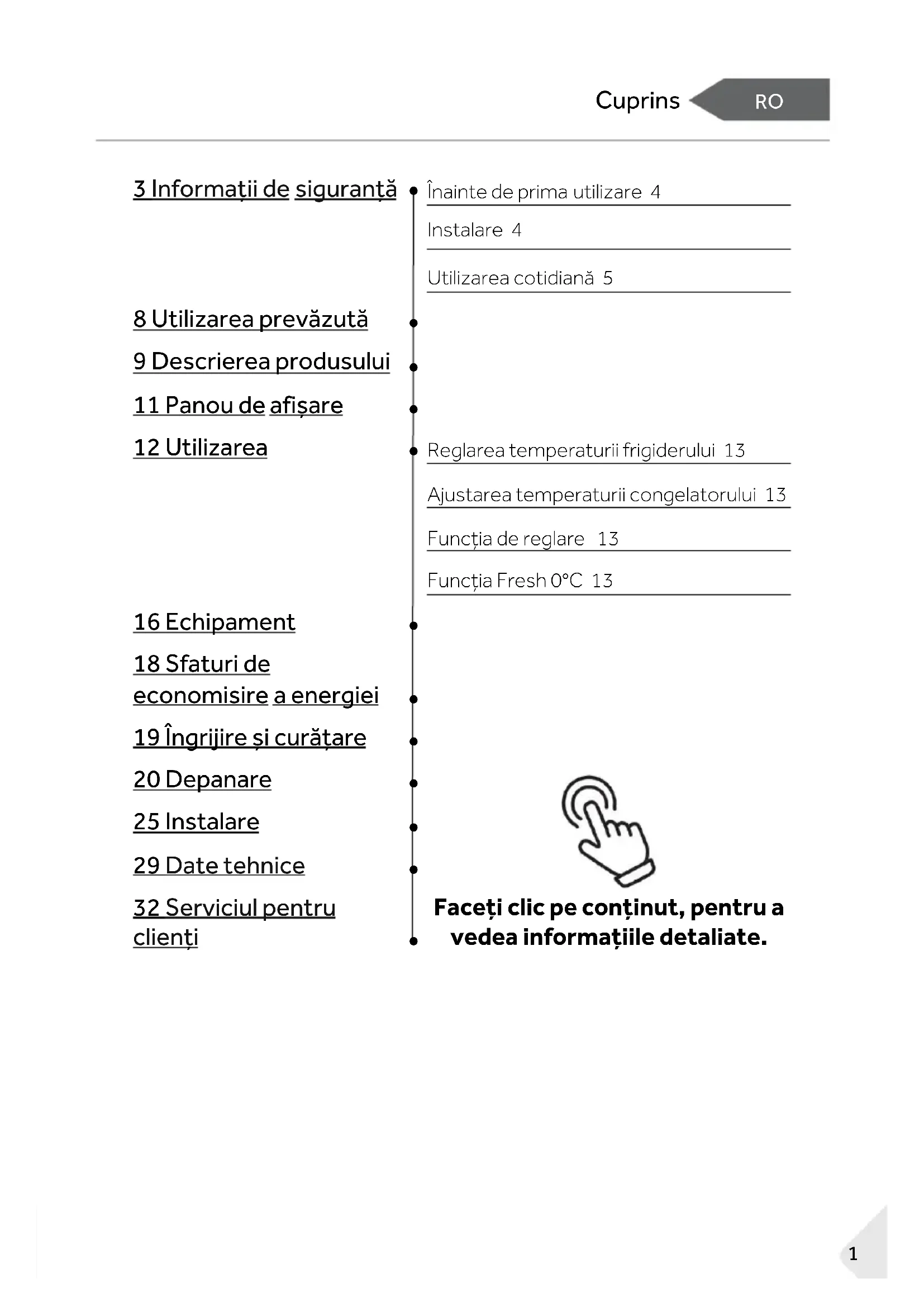 Afișaj temperatură frigider Înainte de prima utilizare ► Scoateți toate materialele de ambalare, nu le lăsați la îndemâna copiilor și eliminați-le într-un mod ecologic, ► Curățați interiorul și exteriorul aparatului, precum și interiorul și accesoriile cu apă și un detergent moale și uscați-l bine cu o cârpă moale. ► După echilibrarea și curățarea aparatului, așteptați cel puțin 2 ore înainte de a-l conecta la rețeaua de alimentare. Consultați secțiunea INSTALARE. ► Răciți în prealabil compartimentele cu setări ridicate înainte de ale umple cu alimente.RO Utilizarea CUPRINS