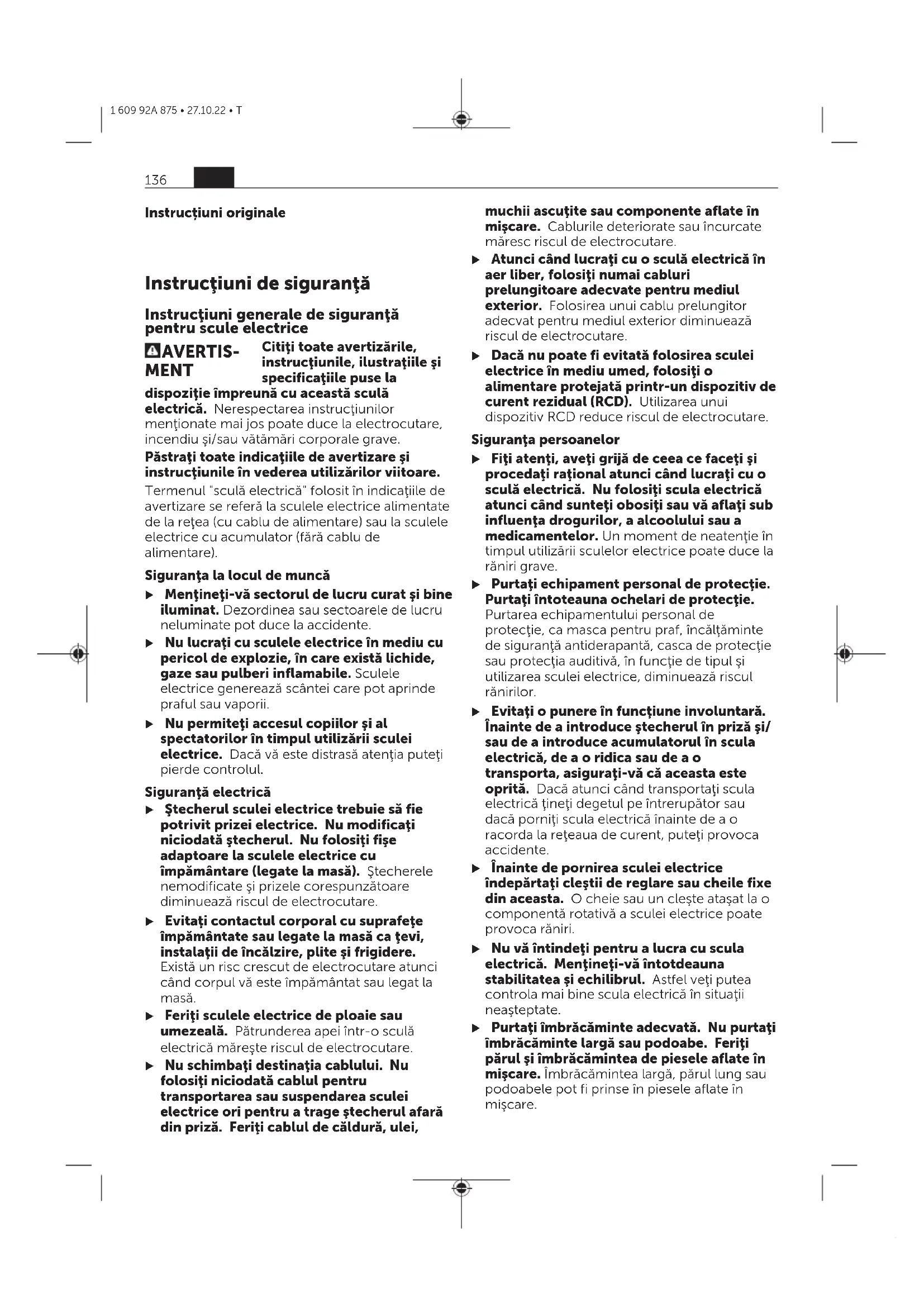 (Specificaţiile pentru debitarea plăcilor din PAL sunt valabile pentru o grosime a piesei de prelucrat de 20mm.) Nivelul vibraţiilor şi nivelul zgomotelor emise specificate în prezentele instrucţiuni au fost măsurate conform unei proceduri de măsurare standardizate şi pot fi utilizate la compararea diferitelor scule electrice. Acestea pot fi folosite şi pentru evaluarea provizorie a vibraţiilor şi zgomotului emis. Nivelul specificat al vibraţiilor şi al zgomotului emis se referă la cele mai frecvente utilizări ale sculei electrice. În eventualitatea în care scula electrică este utilizată pentru alte aplicaţii, împreună cu alte accesorii decât cele indicate sau nu, beneficiază de o întreţinere satisfăcătoare, nivelul vibraţiilor şi nivelul zgomotului emis se pot abate de la valorile specificate. Aceasta poate amplifica considerabil vibraţiile şi zgomotul de-a lungul întregului interval de lucru. Pentru o evaluare exactă a vibraţiilor şi a zgomotului ar trebui luate în calcul şi intervalele de timp în care scula electrică este deconectată sau funcţionează, dar nu este folosită efectiv. Această metodă de calcul ar putea duce la reducerea considerabilă a zgomotului pe întreg intervalul de lucru. Stabiliţi măsuri de siguranţă suplimentare pentru protejarea utilizatorului împotriva efectului vibraţiilor, ca de exemplu: întreţinerea sculei ro 139 1 609 92A 875 • 27.10.22 • Telectrice şi a accesoriilor, menţinerea căldurii mâinilor, organizarea proceselor de muncă. AcumulatorRomână Încărcarea acumulatoruluiRomână u Folosiţi numai încărcătoarele menţionate în datele tehnice. Numai aceste încărcătoare sunt adaptate la acumulatorul cu tehnologie litiu‑ion montat în scula dumneavoastră electrică. Observaţie: Acumulatorii litiu-ion sunt livraţi în stare parţial încărcată, conform reglementărilor internaţionale privind transportul. Pentru a asigura funcţionarea la capacitate maximă a acumulatorului, încarcă complet acumulatorul înainte de prima utilizare. Introducerea acumulatoruluiRomână Introdu acumulatorul încărcat în adaptorul pentru acumulator până când acesta se fixează. Extragerea acumulatoruluiRomână Pentru extragerea acumulatorului, apasă tasta de deblocare şi extrage acumulatorul. Nu forţa. Acumulatoruleste prevăzut cu 2 trepte de blocare, care au rolul de a preveni căderea acumulatorului din scula electrică în cazul apăsării involuntare a tastei de deblocare aacumulatorului. Atât timp cât acumulatorul se află în interiorul sculei electrice, acesta este menţinut în poziţie prin forţa elastică a unui arc. Indicatorul stării de încărcare a acumulatoruluiRomână LED-urile verzi ale indicatorului stării de încărcare a acumulatorului indică starea de încărcare a acumulatorului. Din considerente legate de siguranţă, verificarea stării de încărcare este posibilă numai cu scula electrică oprită. Pentru indicarea stării de încărcare, apasă tasta sau . Acest lucru este posibil şi când acumulatorul nu este montat pe scula electrică. Dacă, după apăsarea tastei pentru indicarea stării de încărcare, nu se aprinde niciun LED, înseamnă că acumulatorul este defect şi trebuie înlocuit. Tip de acumulator GBA 18V...Română LED Capacitate Aprindere continuă de 3 ori în verde 60–100% Aprindere continuă de 2 ori în verde 30–60% Aprindere continuă o dată în verde 5–30% LED Capacitate Aprindere intermitentă o dată în verde 0–5% Tip de acumulator ProCORE18V...Română LED Capacitate Aprindere continuă de 5 ori în verde 80–100% Aprindere continuă de 4 ori în verde 60–80% Aprindere continuă de 3 ori în verde 40–60% Aprindere continuă de 2 ori în verde 20–40% Aprindere continuă o dată în verde 5–20% Aprindere intermitentă o dată în verde 0–5% Indicaţii privind manevrarea optimă a acumulatoruluiRomână Protejaţi acumulatorul împotriva umezelii şi apei. Depozitaţi acumulatorul numai la temperaturi cuprinse între −20°C şi 50°C. Nu lăsaţi acumulatorul în autovehicul, de exemplu, pe timpul verii. Ocazional curăţaţi fantele de ventilaţie ale acumulatorului utilizând o pensulă moale, curată şi uscată. Un timp de funcţionare considerabil redus după încărcare indică faptul că acumulatorul s‑a uzat şi trebuie înlocuit. Respectaţi instrucţiunile privind eliminarea. MontareRomână u Înaintea oricăror intervenţii asupra sculei electrice (de ex. întreţinere, schimbarea accesoriilor, etc.) cât şi în timpul transportului şi depozitării acesteia extrageţi acumulatorul din scula electrică. În cazul acţionării involuntare a întrerupătorului pornit/oprit există pericol de rănire. Montarea/schimbarea pânzei de ferăstrăuRomână u La montarea sau schimbarea accesoriului purtaţi mănuşi de protecţie. Accesoriile sunt ascuţite şi se pot înfierbânta după o utilizare mai îndelungată. u La înlocuirea pânzei de ferăstrău aveţi grijă ca în orificiul de prindere al pânzei de 140 ro 1 609 92A 875 • 27.10.22 • Tferăstrău să nu existe resturi de material, de exemplu, aşchii de lemn sau metal. Alegerea pânzei de ferăstrăuRomână Montează numai pânze de ferăstrău cu coadă universală de 1/2". Pânza de ferăstrău nu trebuie să fie mai lungă decât este necesar pentru tăierea prevăzută. Montarea pânzei de ferăstrău (consultaţiimagineaA)Română Rotiţi manşonul de blocare(3) cu aproximativ 90° în direcţia săgeţii şi ţineţi-l ferm. Apăsaţi pânza de ferăstrău(1) în sistemul de prindere al pânzei de ferăstrău(10). Eliberaţi manşonul de blocare. u Trageţi de pânza de ferăstrău pentru a verifica dacă aceasta este fixată ferm. O pânză de ferăstrău care nu este fixată bine poate cădea afară din sistemul de prindere şi vă poate provoca răniri. Pentru anumite lucrări, pânza de ferăstrău(1) poate fi rotită la 180° 