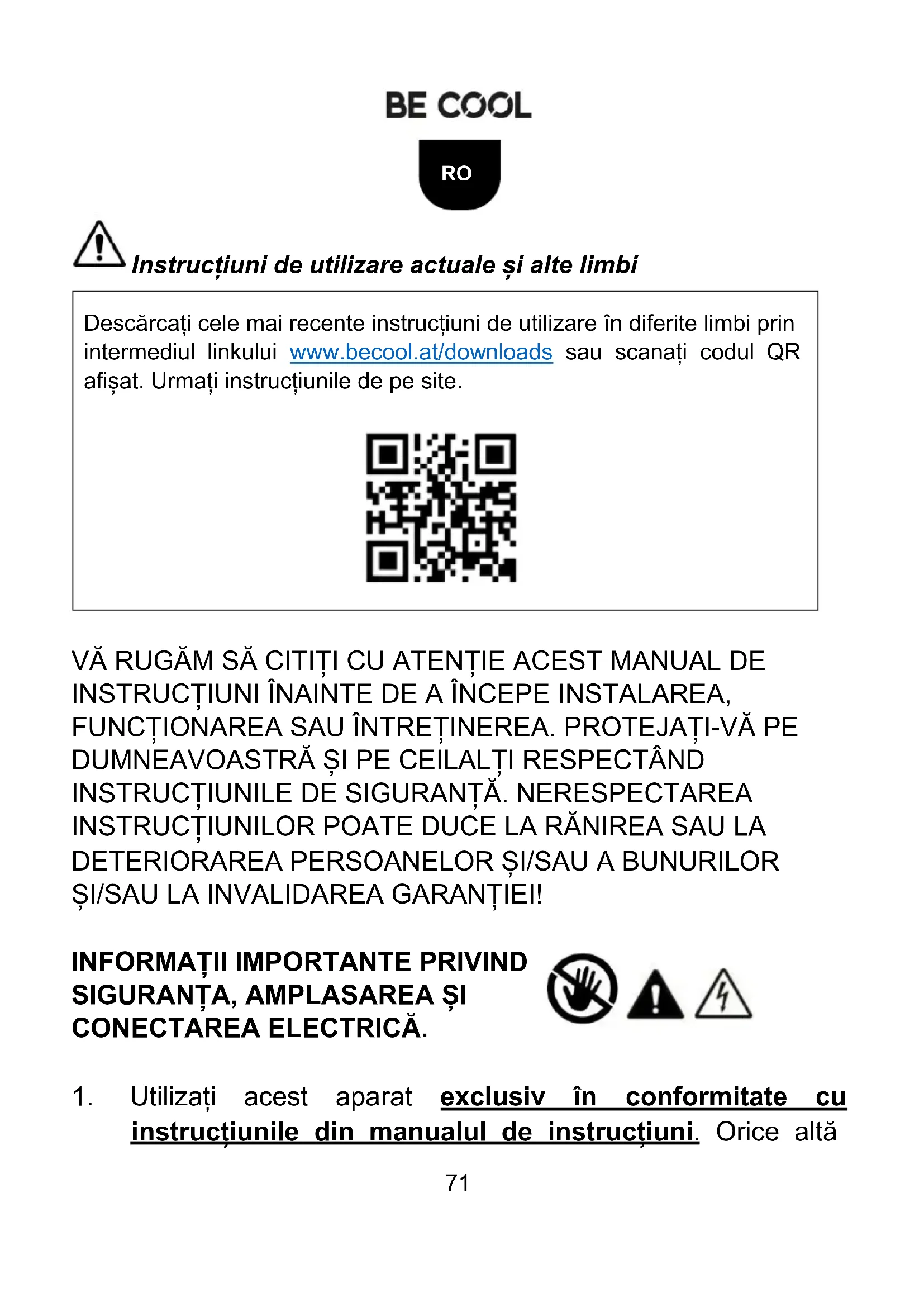 Descărcați cele mai recente instrucțiuni de utilizare în diferite limbi prin intermediul linkului www.becool.at/downloads sau scanați codul QR afișat. Urmați instrucțiunile de pe site.