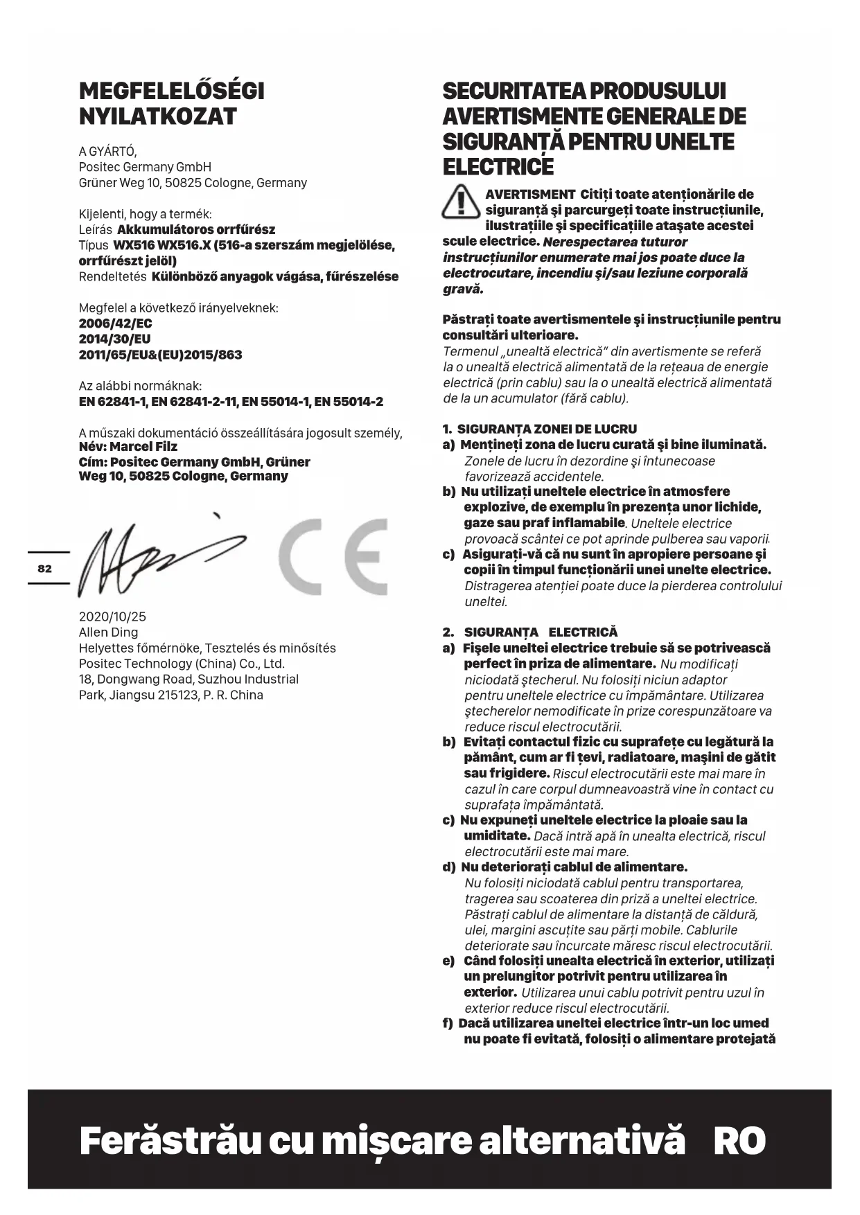- Nu toate accesoriile ilustrate sau descrise sunt incluse în livrarea standard. DATE TEHNICE Tip WX516 WX516.X (500- 519-denumire maşină reprezentând ferăstrăul mecanic) WX516 WX516.X** Te n s i u n e 2 0 V Max*** Turaţie în gol 0-3000/min Lungime cursă 29mm Capacitate de tăiere, grosime maximă Lemn 300mm Oţel 12mm Greutate (Instrument scump) 2.5kg ** X = 1-999, A-Z, M1-M9 sunt destinate doar clienţilor diferiţi, nu există modificări legate de siguranţă între aceste modele. *** Tensiune măsurată în gol. Tensiunea iniţială a bateriei atinge maximum 20 volţi. Tensiunea nominală este de 18 volţi.