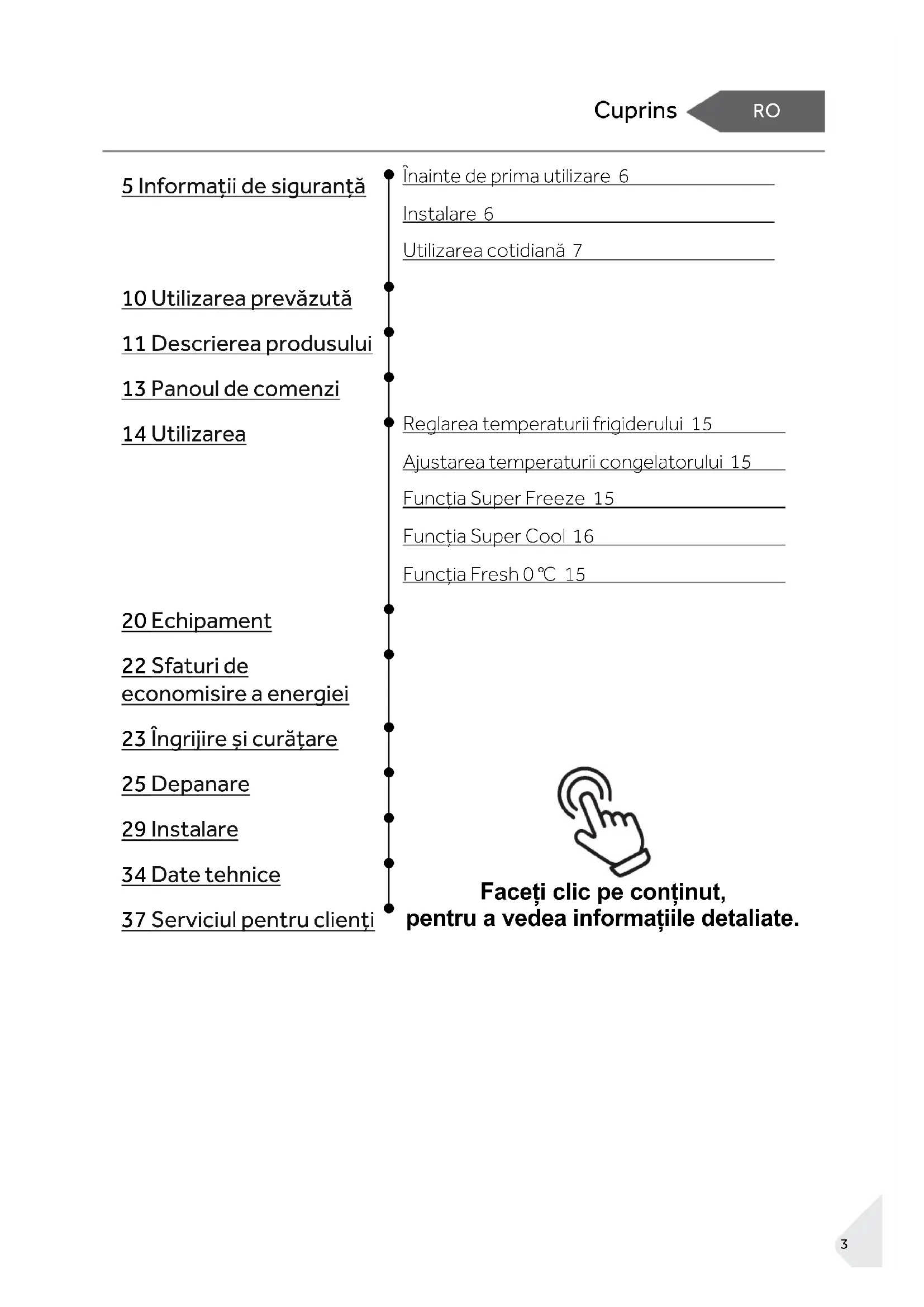 Afișaj temperatură frigider Înainte de prima utilizare ► Scoateți toate materialele de ambalare, nu le lăsați la îndemâna copiilor și eliminați-le într-un mod ecologic. ► Curățați interiorul și exteriorul aparatului, precum și interiorul și accesoriile cu apă și un detergent moale și uscați-l bine cu o cârpă moale. ► După echilibrarea și curățarea aparatului, așteptați cel puțin 2 ore înainte de a-l conecta la rețeaua de alimentare. Consultați secțiunea INSTALARE. ► Răciți în prealabil compartimentele cu setări ridicate înainte de ale umple cu alimente.RO Utilizarea CUPRINS