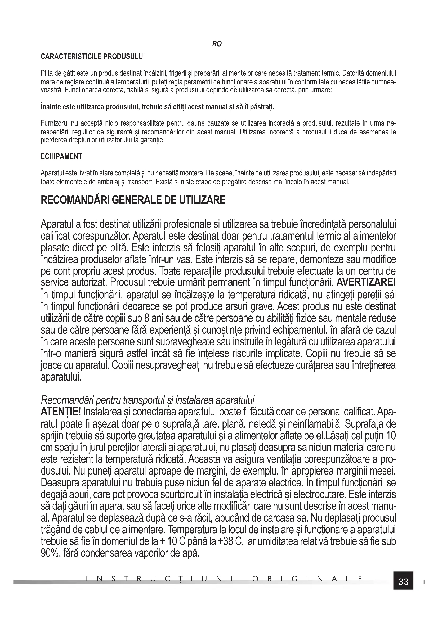 Aparatul a fost destinat utilizării profesionale și utilizarea sa trebuie încredințată personalului califi cat corespunzător. Aparatul este destinat doar pentru tratamentul termic al alimentelor plasate direct pe plită. Este interzis să folosiți aparatul în alte scopuri, de exemplu pentru încălzirea produselor afl ate într-un vas. Este interzis să se repare, demonteze sau modifi ce pe cont propriu acest produs. Toate reparațiile produsului trebuie efectuate la un centru de service autorizat. Produsul trebuie urmărit permanent în timpul funcționării. AVERTIZARE! În timpul funcționării, aparatul se încălzește la temperatură ridicată, nu atingeți pereții săi în timpul funcționării deoarece se pot produce arsuri grave. Acest produs nu este destinat utilizării de către copiii sub 8 ani sau de către persoane cu abilități fi zice sau mentale reduse sau de către persoane fără experiență și cunoștințe privind echipamentul. în afară de cazul în care aceste persoane sunt supravegheate sau instruite în legătură cu utilizarea aparatului într-o manieră sigură astfel încât să fi e înțelese riscurile implicate. Copiii nu trebuie să se joace cu aparatul. Copiii nesupravegheați nu trebuie să efectueze curățarea sau întreținerea aparatului. Recomandări pentru transportul și instalarea aparatului ATENȚIE! Instalarea și conectarea aparatului poate fi făcută doar de personal califi cat. Apa- ratul poate fi așezat doar pe o suprafață tare, plană, netedă și neinfl amabilă. Suprafața de sprijin trebuie să suporte greutatea aparatului și a alimentelor afl ate pe el.Lăsați cel puțin 10 cm spațiu în jurul pereților laterali ai aparatului, nu plasați deasupra sa niciun material care nu este rezistent la temperatură ridicată. Aceasta va asigura ventilația corespunzătoare a pro- dusului. Nu puneți aparatul aproape de margini, de exemplu, în apropierea marginii mesei. Deasupra aparatului nu trebuie puse niciun fel de aparate electrice. În timpul funcționării se degajă aburi, care pot provoca scurtcircuit în instalația electrică și electrocutare. Este interzis să dați găuri în aparat sau să faceți orice alte modifi cări care nu sunt descrise în acest manu- al. Aparatul se deplasează după ce s-a răcit, apucând de carcasa sa. Nu deplasați produsul trăgând de cablul de alimentare. Temperatura la locul de instalare și funcționare a aparatului trebuie să fi e în domeniul de la + 10 C până la +38 C, iar umiditatea relativă trebuie să fi e sub 90%, fără condensarea vaporilor de apă.34