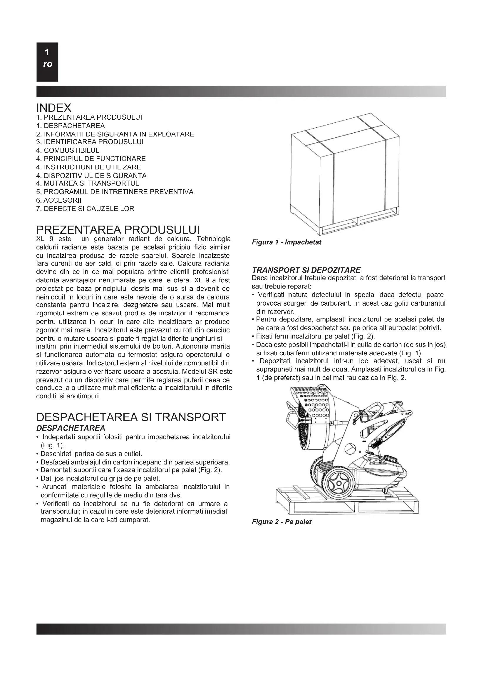 - Vericati ca incalzitorul sa nu e deteriorat ca urmare a transportului; in cazul in care este deteriorat informati imediat magazinul de la care l-ati cumparat. XL 9 este un generator radiant de caldura. Tehnologia caldurii radiante este bazata pe acelasi pricipiu zic similar cu incalzirea produsa de razele soarelui. Soarele incalzeste fara curenti de aer cald, ci prin razele sale. Caldura radianta devine din ce in ce mai populara printre clientii profesionisti datorita avantajelor nenumarate pe care le ofera. XL 9 a fost proiectat pe baza principiului desris mai sus si a devenit de neinlocuit in locuri in care este nevoie de o sursa de caldura constanta pentru incalzire, dezghetare sau uscare. Mai mult zgomotul extrem de scazut produs de incalzitor il recomanda pentru utilizarea in locuri in care alte incalzitoare ar produce zgomot mai mare. Incalzitorul este prevazut cu roti din cauciuc pentru o mutare usoara si poate reglat la diferite unghiuri si inaltimi prin intermediul sistemului de bolturi. Autonomia marita si functionarea automata cu termostat asigura operatorului o utilizare usoara. Indicatorul extern al nivelului de combustibil din rezervor asigura o vericare usoara a acestuia. Modelul SR este prevazut cu un dispozitiv care permite reglarea puterii ceea ce conduce la o utilizare mult mai ecienta a incalzitorului in diferite conditii si anotimpuri.