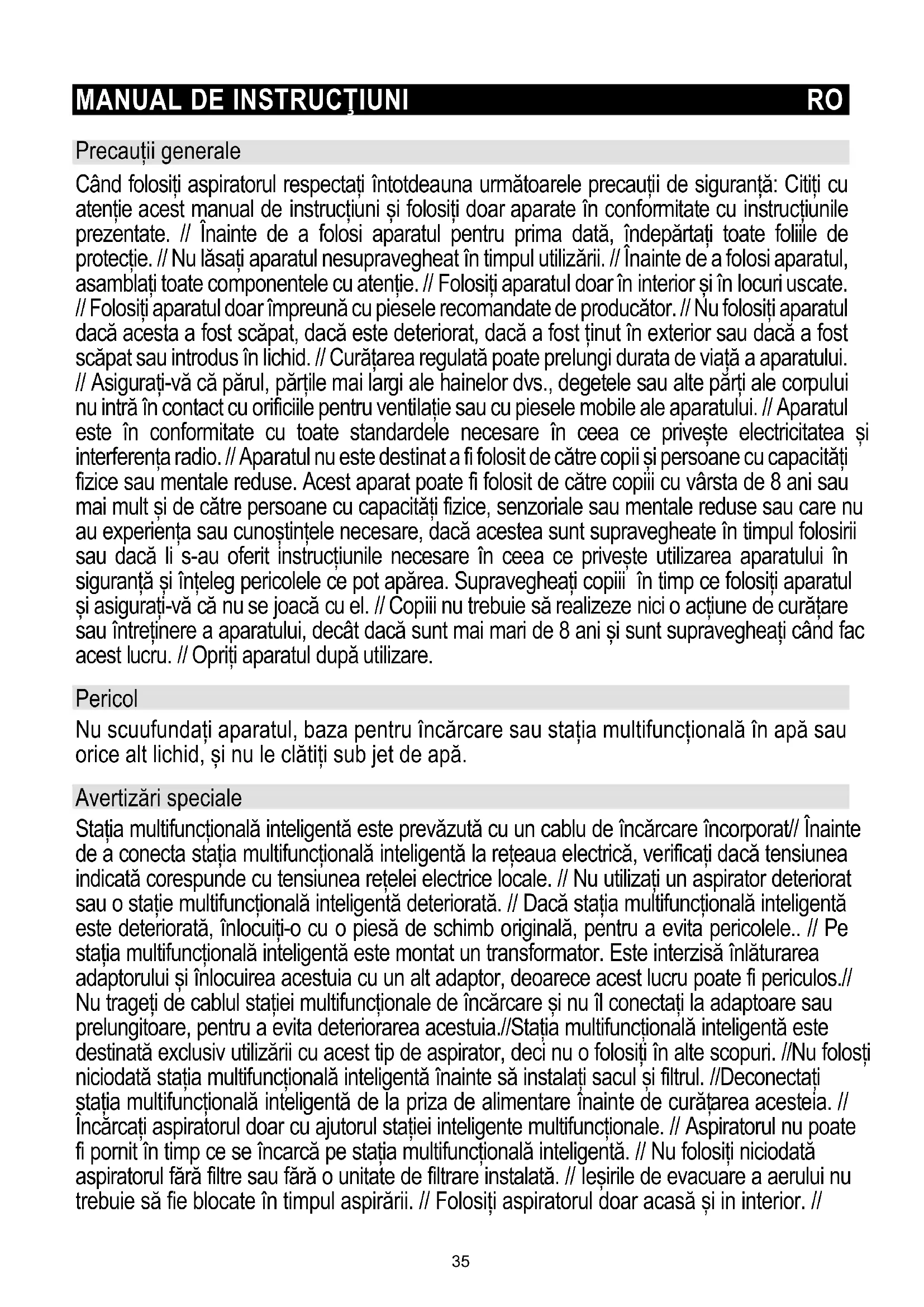 Precauții generale Când folosiți aspiratorul respectați întotdeauna următoarele precauții de siguranță: Citiți cu atenție acest manual de instrucțiuni și folosiți doar aparate în conformitate cu instrucțiunile prezentate. // Înainte de a folosi aparatul pentru prima dată, îndepărtați toate foliile de protecție. // Nu lăsați aparatul nesupravegheat în timpul utilizării. // Înainte de a folosi aparatul, asamblați toate componentele cu atenție. // Folosiți aparatul doar în interior și în locuri uscate. // Folosiți aparatul doar împreună cu piesele recomandate de producător. // Nu folosiți aparatul dacă acesta a fost scăpat, dacă este deteriorat, dacă a fost ținut în exterior sau dacă a fost scăpat sau introdus în lichid. // Curățarea regulată poate prelungi durata de viață a aparatului. // Asigurați-vă că părul, părțile mai largi ale hainelor dvs., degetele sau alte părți ale corpului nu intră în contact cu orificiile pentru ventilație sau cu piesele mobile ale aparatului. // Aparatul este în conformitate cu toate standardele necesare în ceea ce privește electricitatea și interferența radio. // Aparatul nu este destinat a fi folosit de către copii și persoane cu capacități fizice sau mentale reduse. Acest aparat poate fi folosit de către copiii cu vârsta de 8 ani sau mai mult și de către persoane cu capacități fizice, senzoriale sau mentale reduse sau care nu au experiența sau cunoștințele necesare, dacă acestea sunt supravegheate în timpul folosirii sau dacă li s-au oferit instrucțiunile necesare în ceea ce privește utilizarea aparatului în siguranță și înțeleg pericolele ce pot apărea. Supravegheați copiii în timp ce folosiți aparatul și asigurați-vă că nu se joacă cu el. // Copiii nu trebuie să realizeze nici o acțiune de curățare sau întreținere a aparatului, decât dacă sunt mai mari de 8 ani și sunt supravegheați când fac acest lucru. // Opriți aparatul după utilizare. Pericol Nu scuufundați aparatul, baza pentru încărcare sau stația multifuncțională în apă sau orice alt lichid, și nu le clătiți sub jet de apă. Avertizări speciale Stația multifuncțională inteligentă este prevăzută cu un cablu de încărcare încorporat// Înainte de a conecta stația multifuncțională inteligentă la rețeaua electrică, verificați dacă tensiunea indicată corespunde cu tensiunea rețelei electrice locale. // Nu utilizați un aspirator deteriorat sau o stație multifuncțională inteligentă deteriorată. // Dacă stația multifuncțională inteligentă este deteriorată, înlocuiți-o cu o piesă de schimb originală, pentru a evita pericolele.. // Pe stația multifuncțională inteligentă este montat un transformator. Este interzisă înlăturarea adaptorului și înlocuirea acestuia cu un alt adaptor, deoarece acest lucru poate fi periculos.// Nu trageți de cablul stației multifuncționale de încărcare și nu îl conectați la adaptoare sau prelungitoare, pentru a evita deteriorarea acestuia.//Stația multifuncțională inteligentă este destinată exclusiv utilizării cu acest tip de aspirator, deci nu o folosiți în alte scopuri. //Nu folosți niciodată stația multifuncțională inteligentă înainte să instalați sacul și filtrul. //Deconectați stația multifuncțională inteligentă de la priza de alimentare înainte de curățarea acesteia. // Încărcați aspiratorul doar cu ajutorul stației inteligente multifuncționale. // Aspiratorul nu poate fi pornit în timp ce se încarcă pe stația multifuncțională inteligentă. // Nu folosiți niciodată aspiratorul fără filtre sau fără o unitate de filtrare instalată. // Ieșirile de evacuare a aerului nu trebuie să fie blocate în timpul aspirării. // Folosiți aspiratorul doar acasă și in interior. // 35Asigurați-vă că orificiile de aspirare sunt deschise și ca aerul poate circula prin acestea, pentru a asigura o putere de aspirare optimă și constantă a aparatului. Se recomandă curățarea regulată a părților deschise ale furtunului de aspirare și îndepărtarea prafului, părului, sau a oricărui alt lucru care poate înfunda fluxul de aer.// Nu folisiți niciodată aspiratorul pentru a curăța particule sau resturi arse, mucuri de țigară, chibrituri, lichide (de exemplu apă, spumă pentru covoare), sau obiecte tăioase și ascuțite (cioburi, etc) . // Nu apropiați nioiodată furtunul de aspirare sau partea deschisă a aparatului de față sau de corp. // Nu folosiți niciodată aspiratorul pentru a aspira materiale de construcție (cum ar fi nisip fin, var, praf de ciment, praf de cretă, etc). Acestea pot deteriora aparatul. Probleme şi soluţii Problemă Motiv posibil Soluţie Nu funcţionează. Bateria este descărcată. Aspiratorul portabil nu este asamblat corect. Încărcaţi-o. Asamblaţi aspiratorul portabil corect. Puterea de aspirare s-a redus. Cuva de praf este plină. Filtrul este blocat. Orificiul de admisie a aerului sau rola periei electrice sunt blocate. Înlăturaţi praful. Curăţaţi sau schimbaţi filtrul Curăţaţi peria electrică. Aspiratorul nu se încarcă. Încărcătorul nu este conectat la priză. Ştecherul încărcătorului nu este conectat la orificiul bazei. Aspiratorul portabil nu este aşezat e ansamblu. Conectaţi încărcătorul la priză. Conectaţi încărcătorul la ansamblul bazei aspiratorului. Aşezaţi aspiratorul portabil pe ansamblu. Durată de uncționare redusă după încărcare. Nu este lăsat suficient la încărcat. Bateria este descărcată. Încărcaţi-l conform instrucţiunilor. Schimbaţi bateria. Mediul înconjurător Nu aruncaţi aparatul împreună cu deşeurile casnice atunci când nu mai este utilizabil. Înmânaţi-l la un punct oficial de colectare spre a fi reciclat. Astfel, ajutaţi la conservarea mediului. Acest aparat este marcat în conformitate cu Directiva europeană 2012/19/EU privind deşeurile de